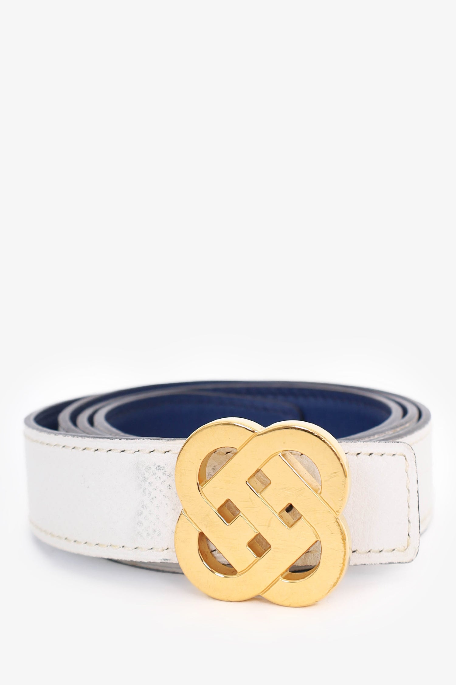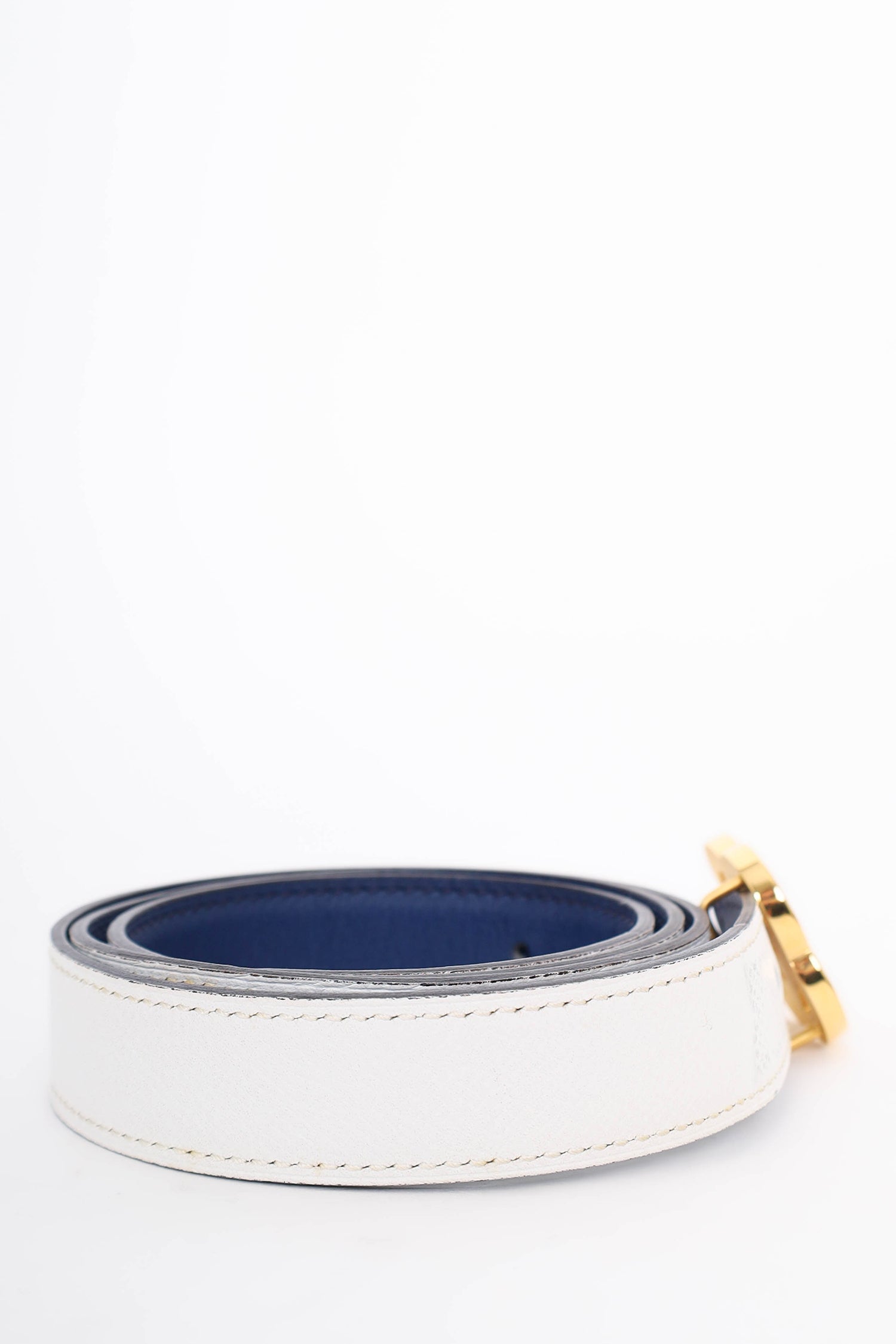 Refresh availabilityHermès White/Navy Reversible Leather 24 mm Iris Belt Kit. Adjustable pull through buckle closure. Tonal stitching. Gold-tone hardware.