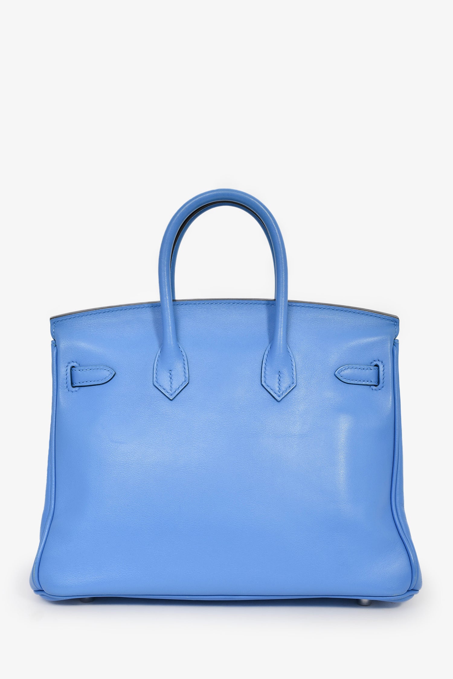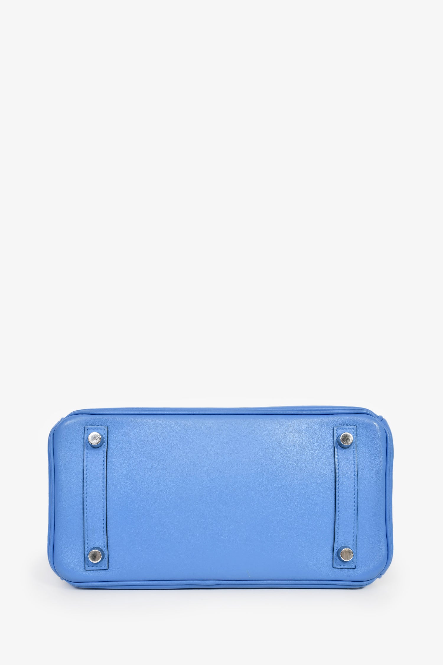 Refresh availabilityHermès 2015 Blue Swift Leather Birkin 25. Front fold-over flap and side straps with turn-lock closure. Twin top handles. Protective studs on bottom. Interior zip and slip pocket. Includes clochette. Palladium-tone hardware. Tonal stitching.