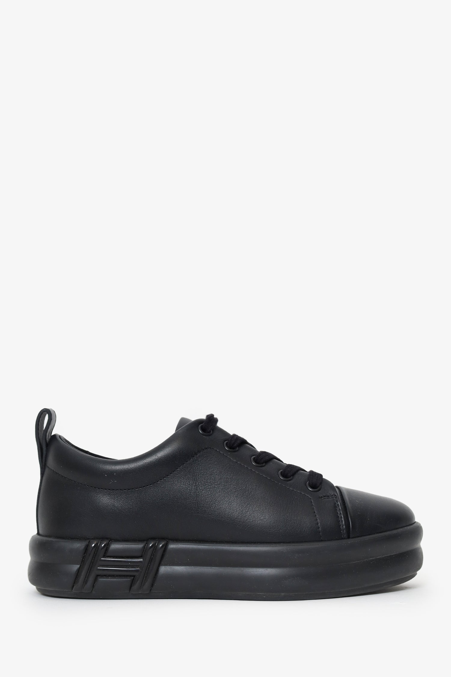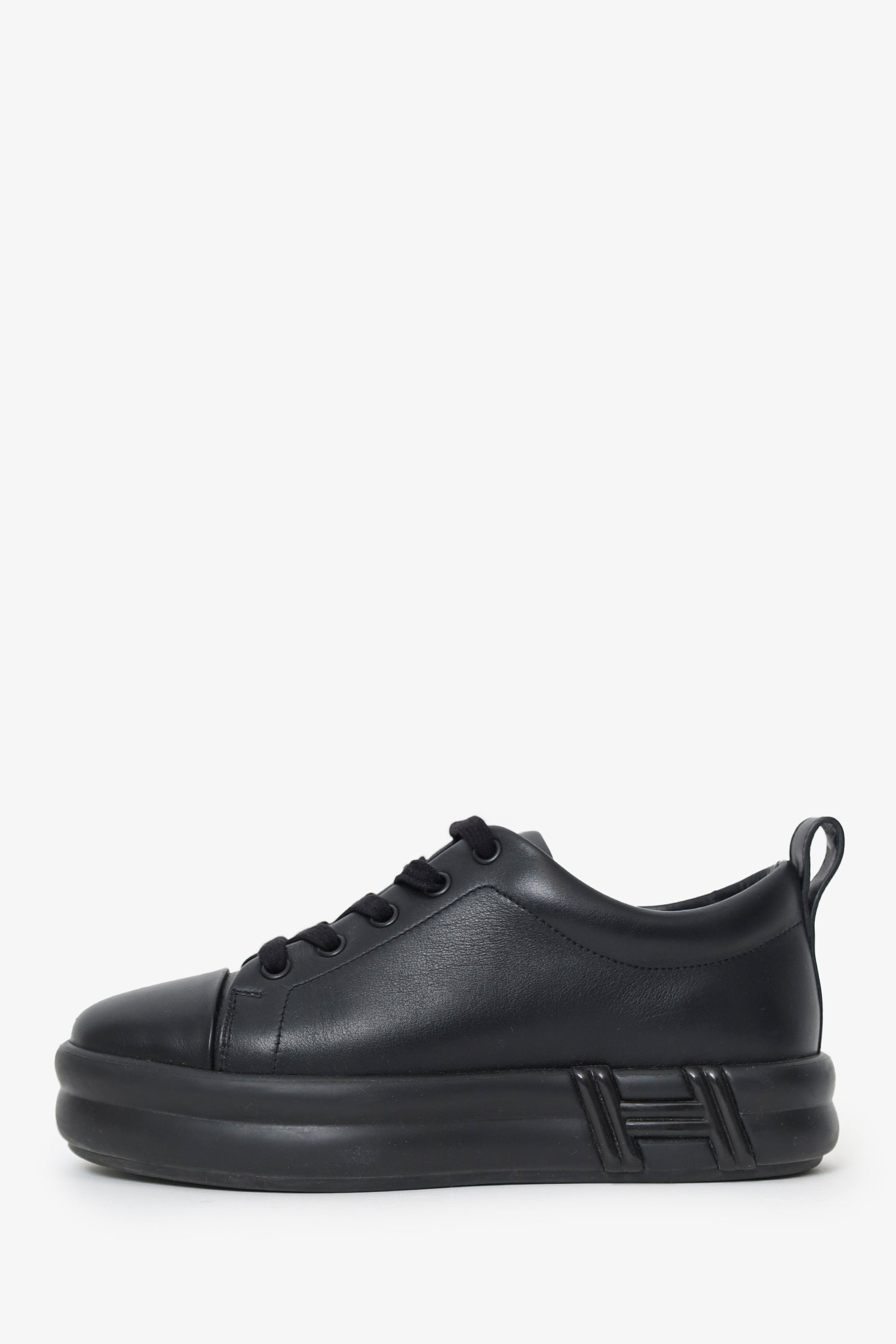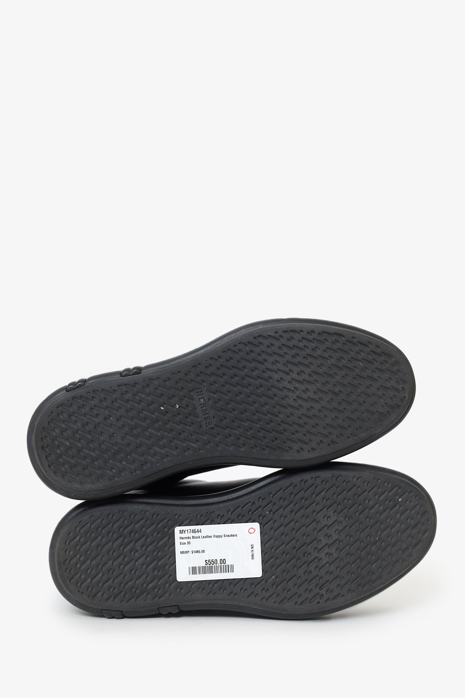 Refresh availabilityHermès Black Leather Happy Sneakers. Pull on. Front lace-up closure. Rear pull tab. Round toe. Tonal hardware. Tonal stitching.
