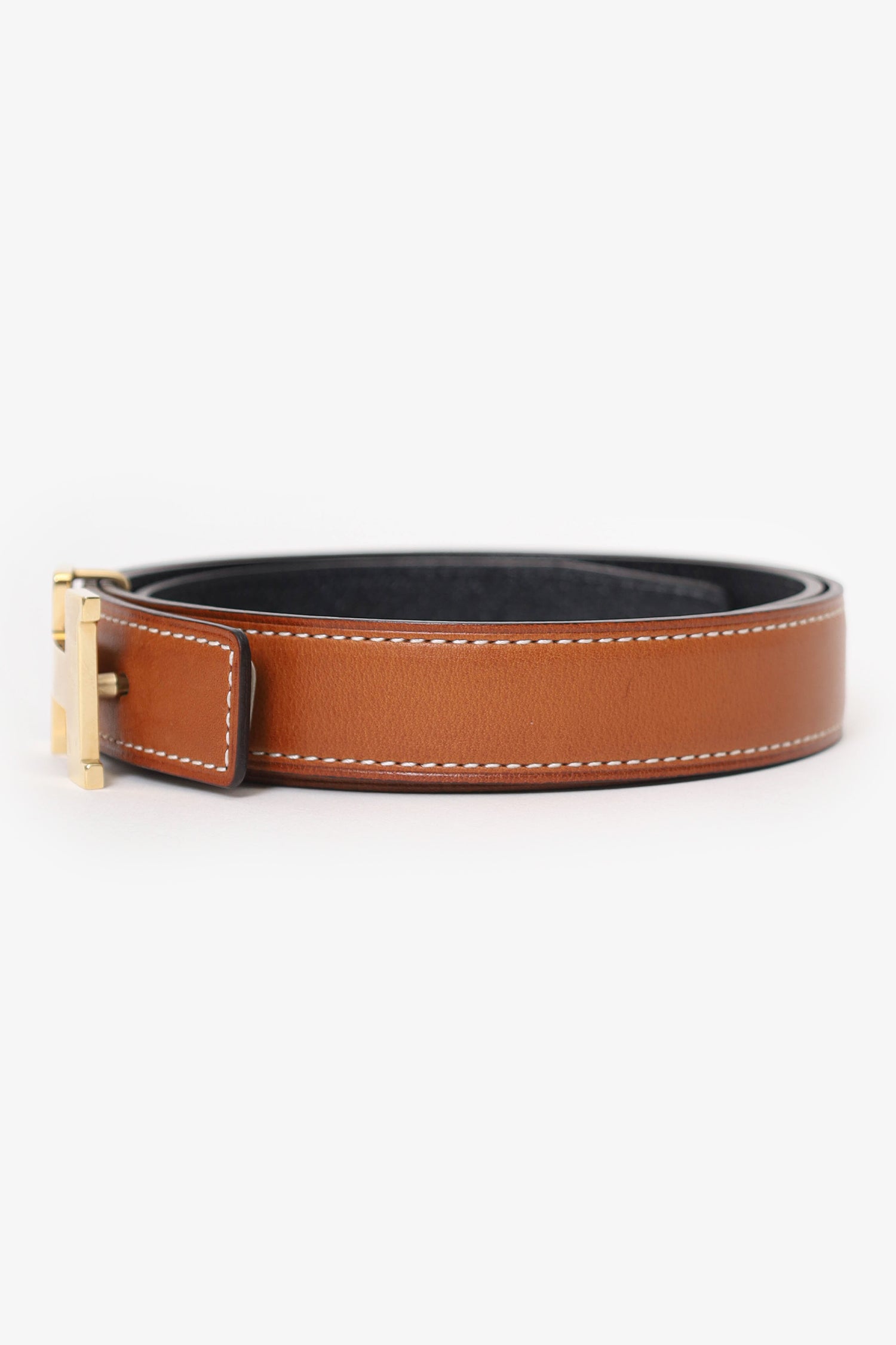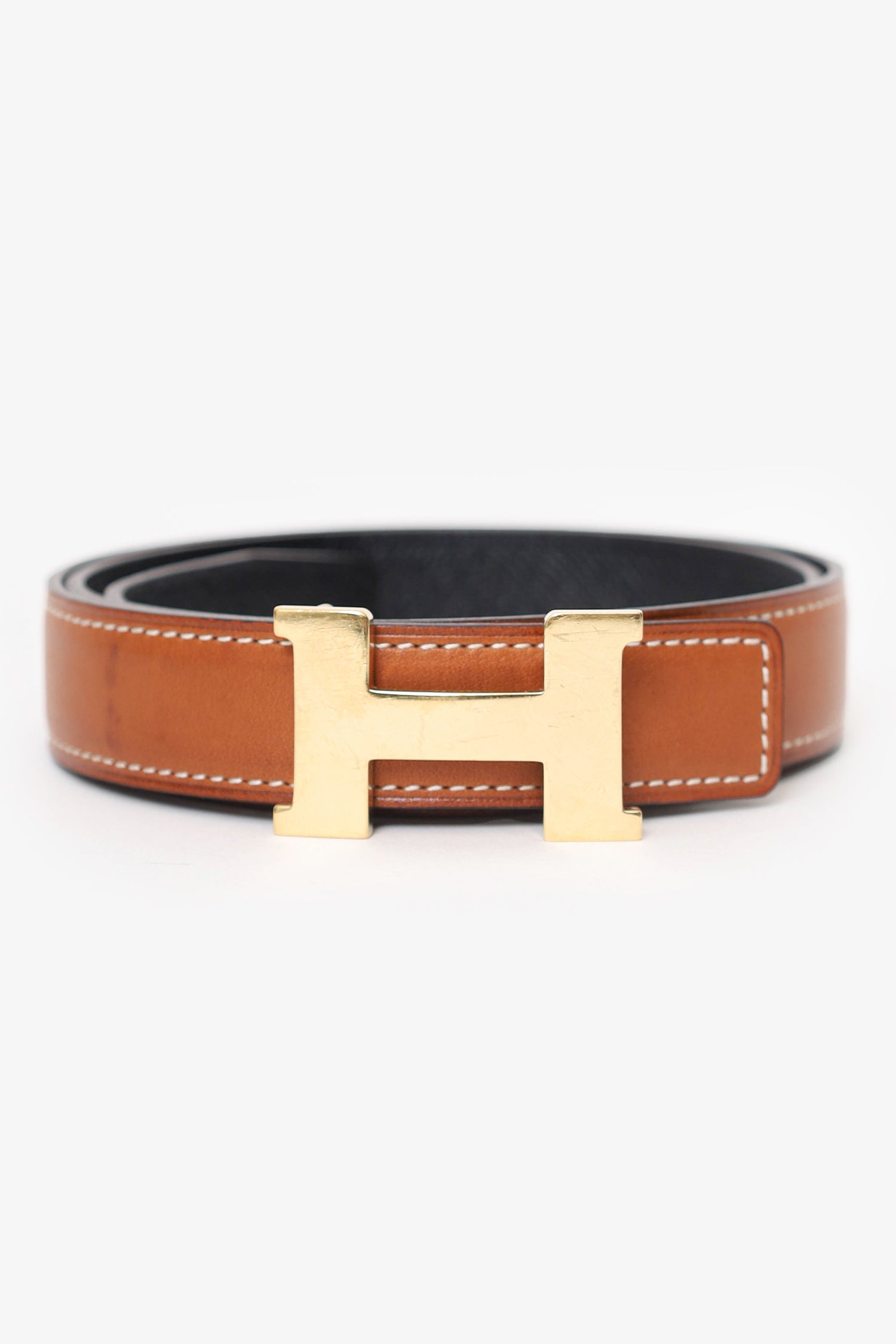 Refresh availabilityHermès Black/Gold Epsom Leather Reversible 'H' Belt. Adjustable pull-through buckle closure. Gold-tone hardware. Contrast and tonal stitching.