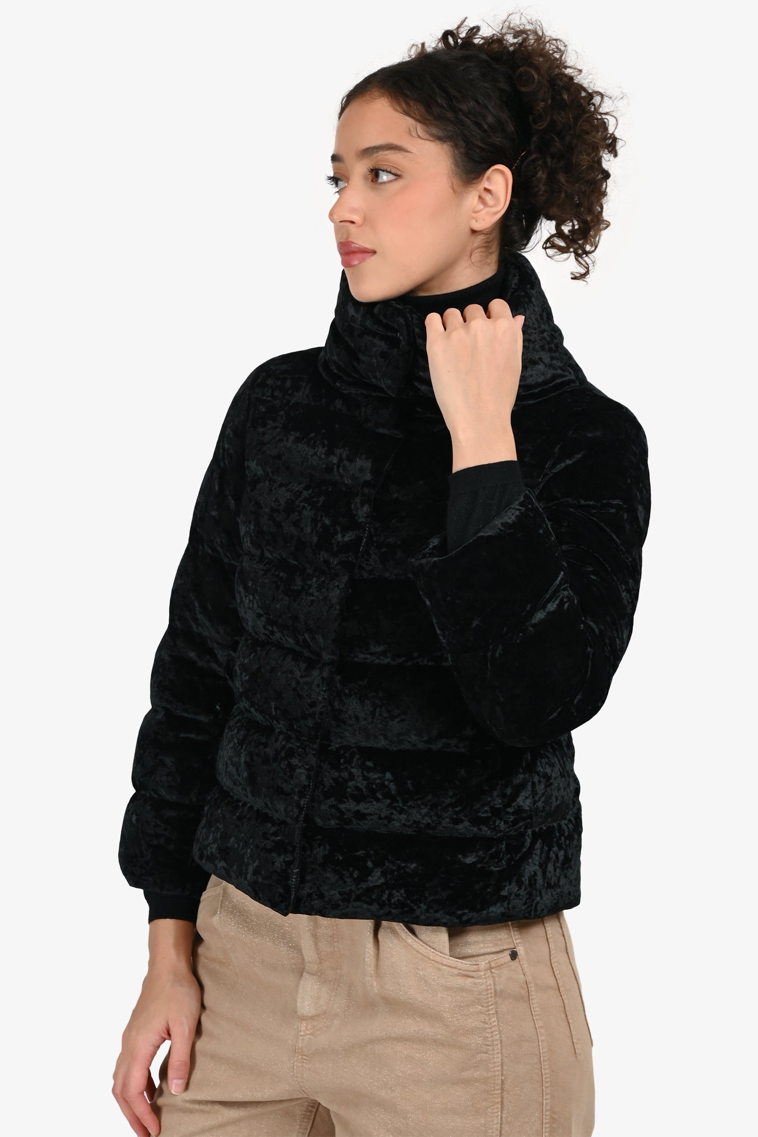 Refresh availabilityHerno Black Crushed Velvet Puffer Jacket. Front button-up closure. Stand collar. 2 exterior zip pockets. Fully lined interior. Elasticized cuffs. Tonal stitching.