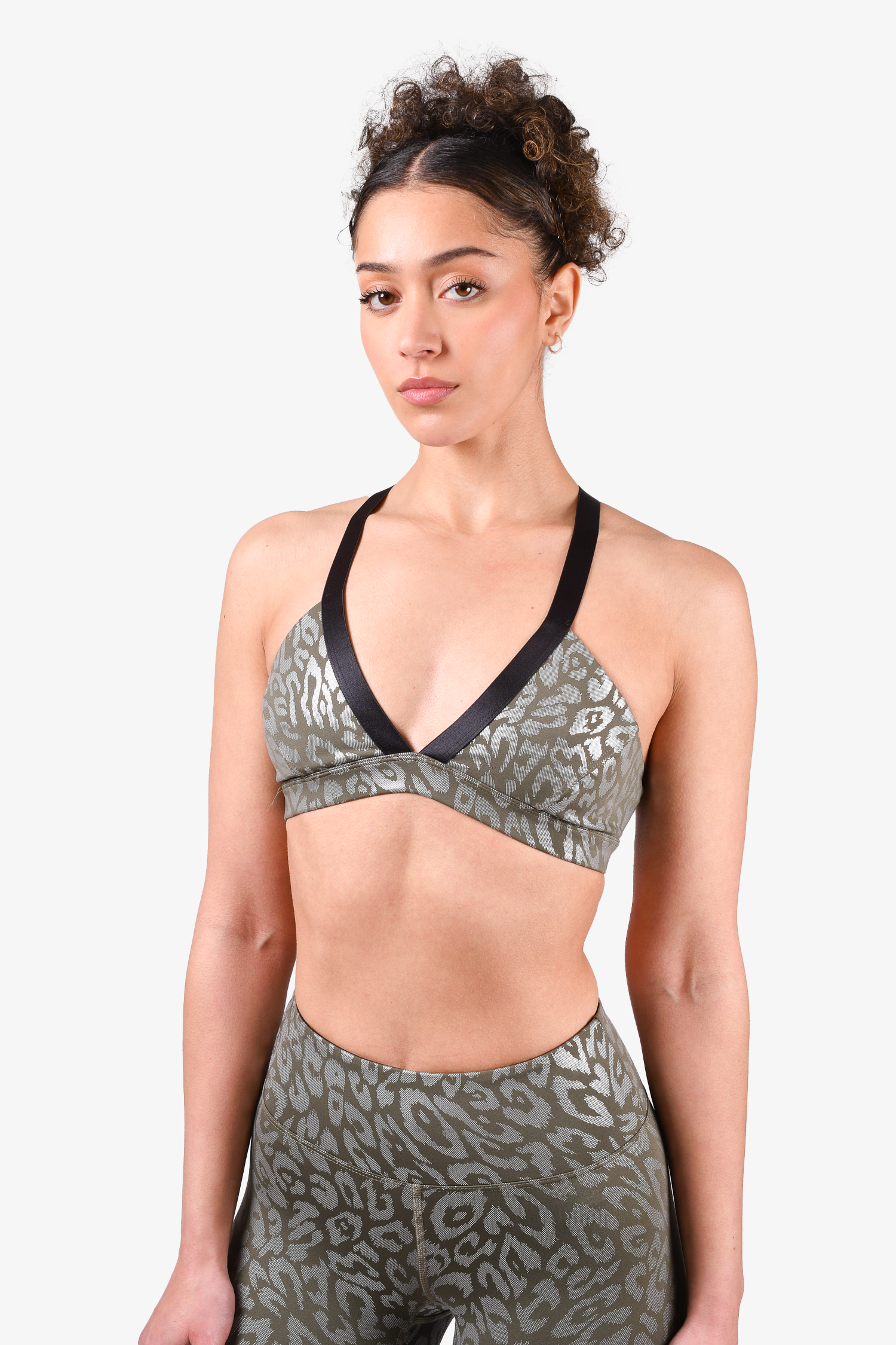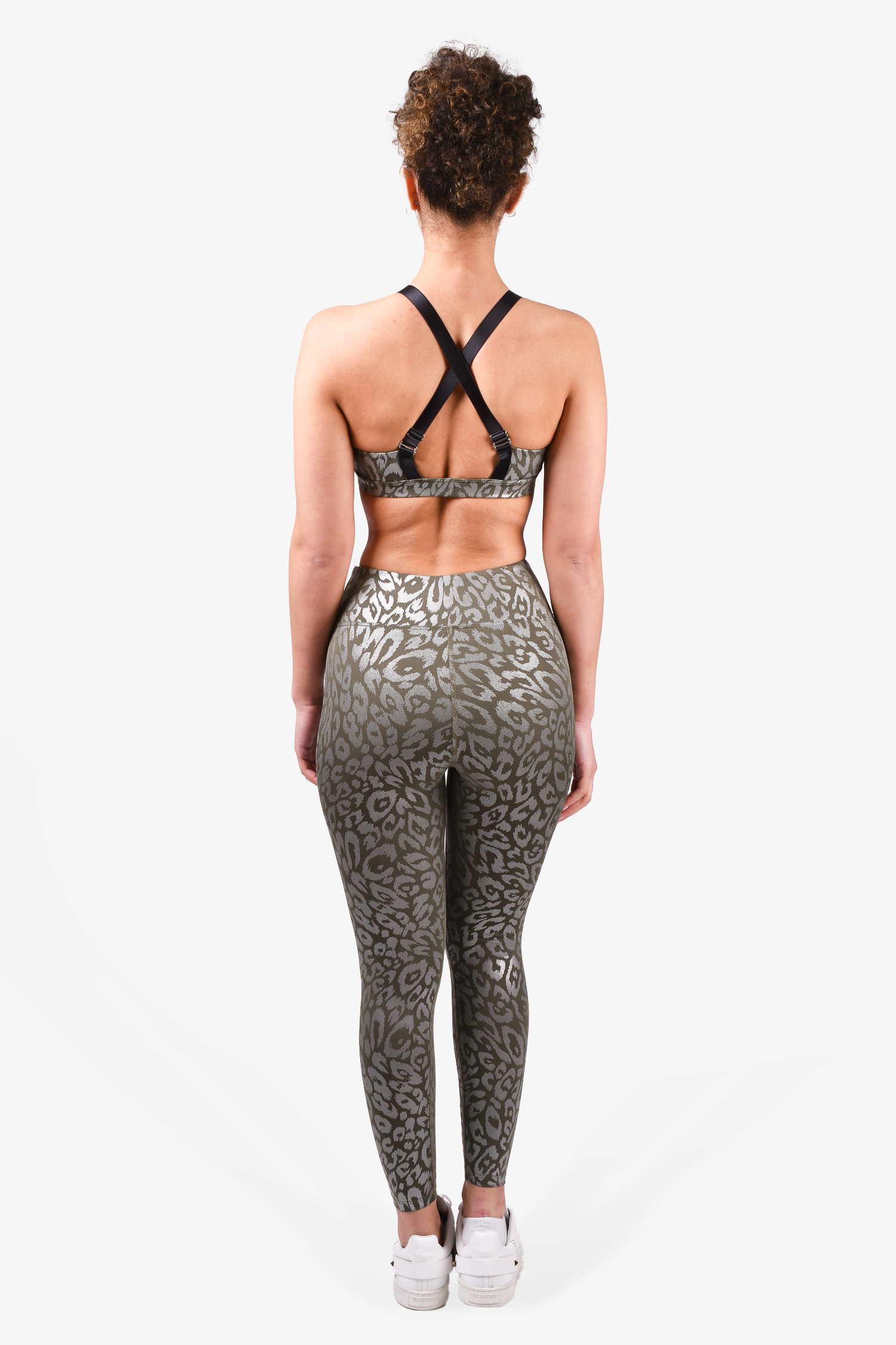 Refresh availabilityHeroine Sport Green/Metallic Cheetah Print Tight + Bra Set. Bra: Adjustable straps. Pull-on. Tights: Elasticized waist. Tonal stitching.