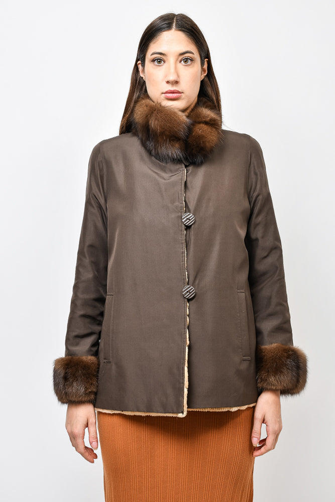 Holt Renfrew Brown Fur/Nylon Reversible Midi Coat with Fur Cuff & Neckline