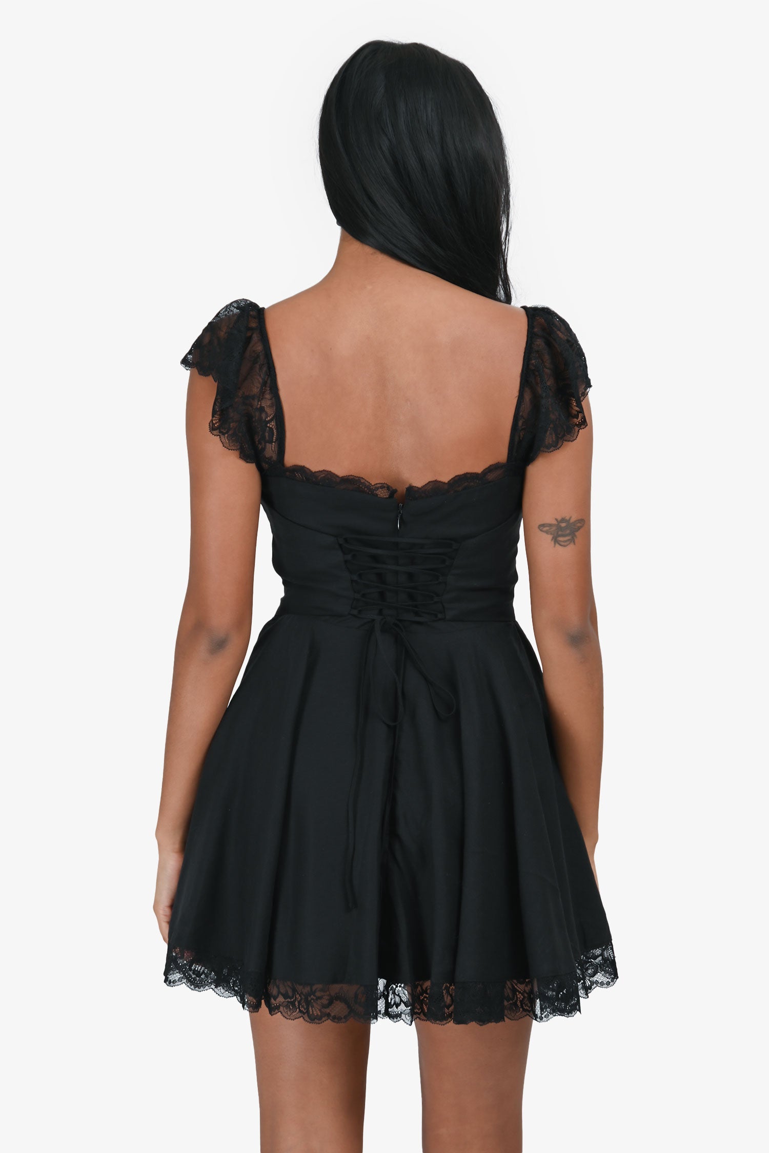 Refresh availabilityHouse Of CB Black Lace 'Kaia' Mini Dress. Slip-on. Square neckline. Rear zip, hook, and lace-up closure. Lined interior. Tonal stitching.