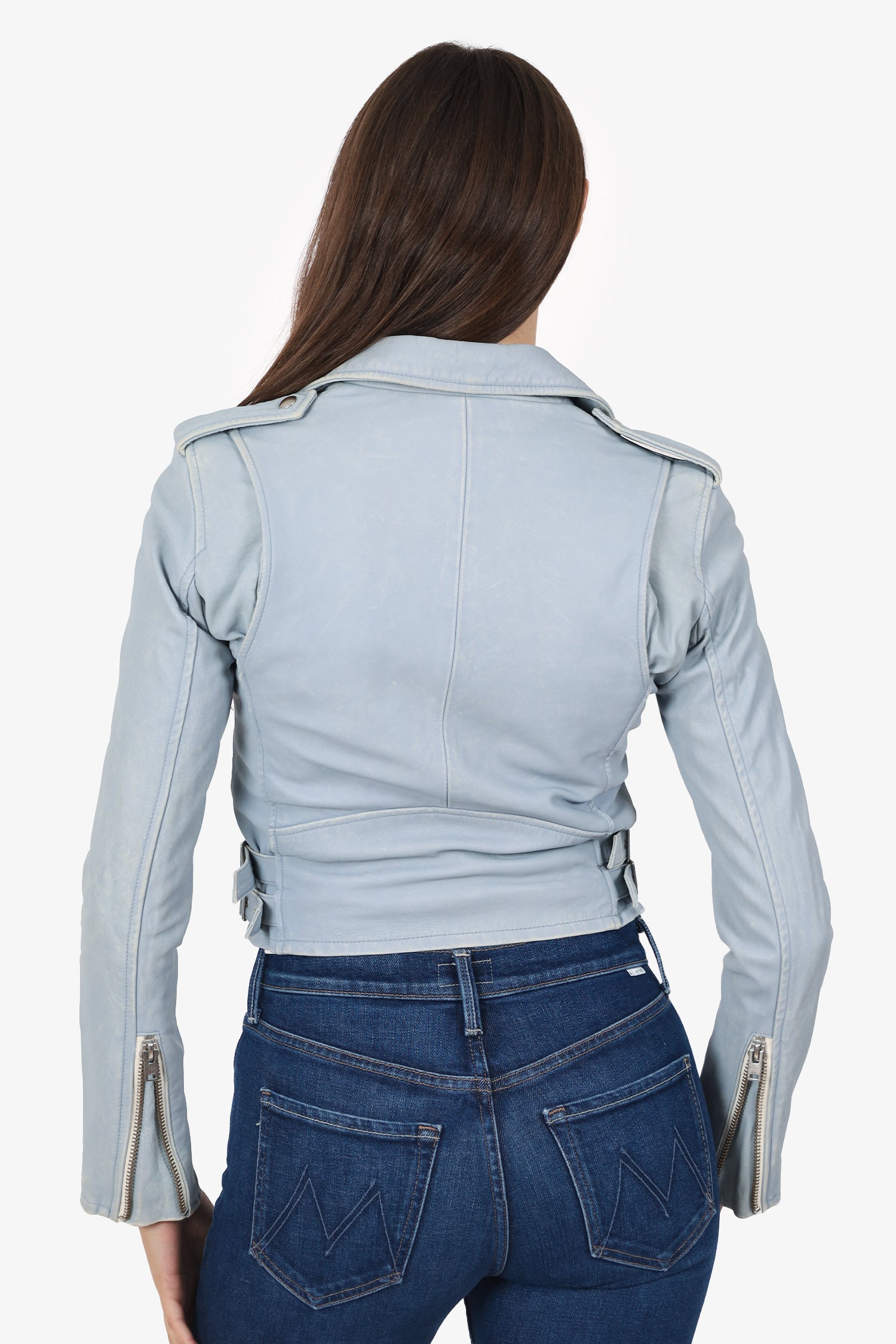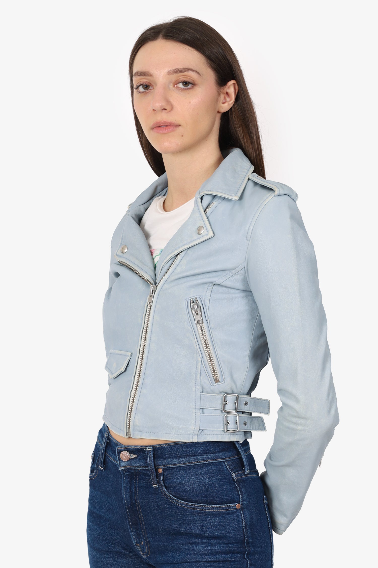 Refresh availabilityIro Blue Aged Leather Biker Jacket. Pull-on. Collared-neckline. Front zip closure. 3 exterior pockets; 2 side zip and 1 mini flap. Buckle closure at bottom sides. Epaulettes with snap-button closure. Lined interior. Silver-tone hardware. Tonal stitching.