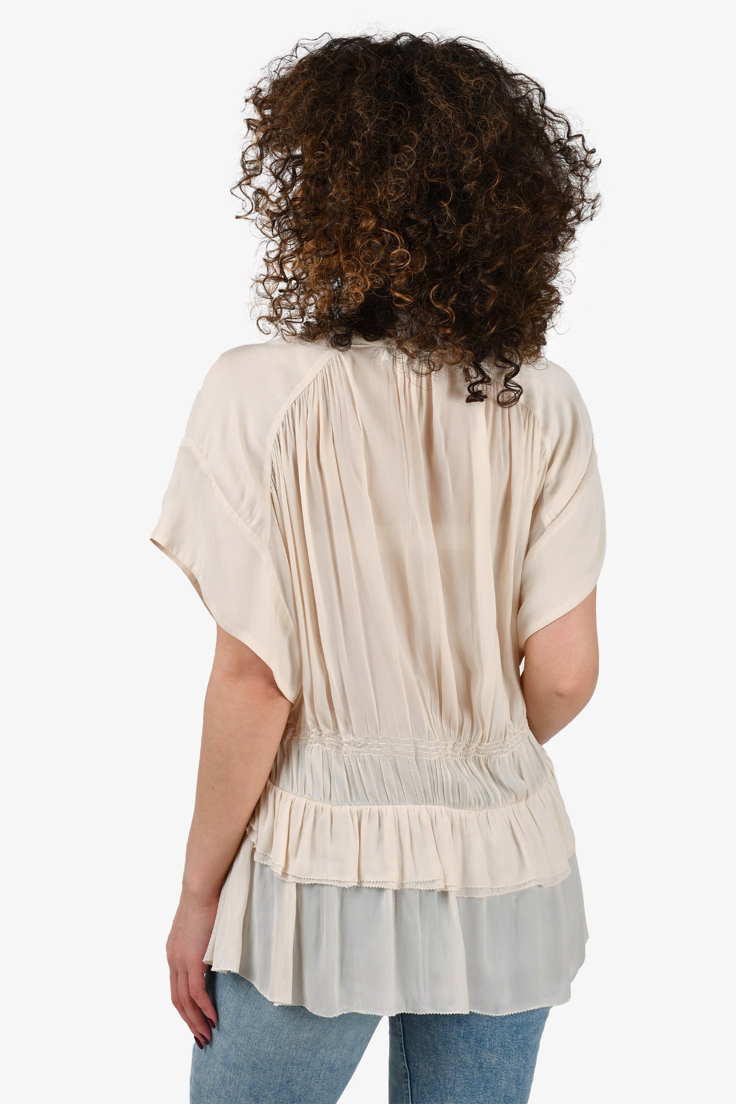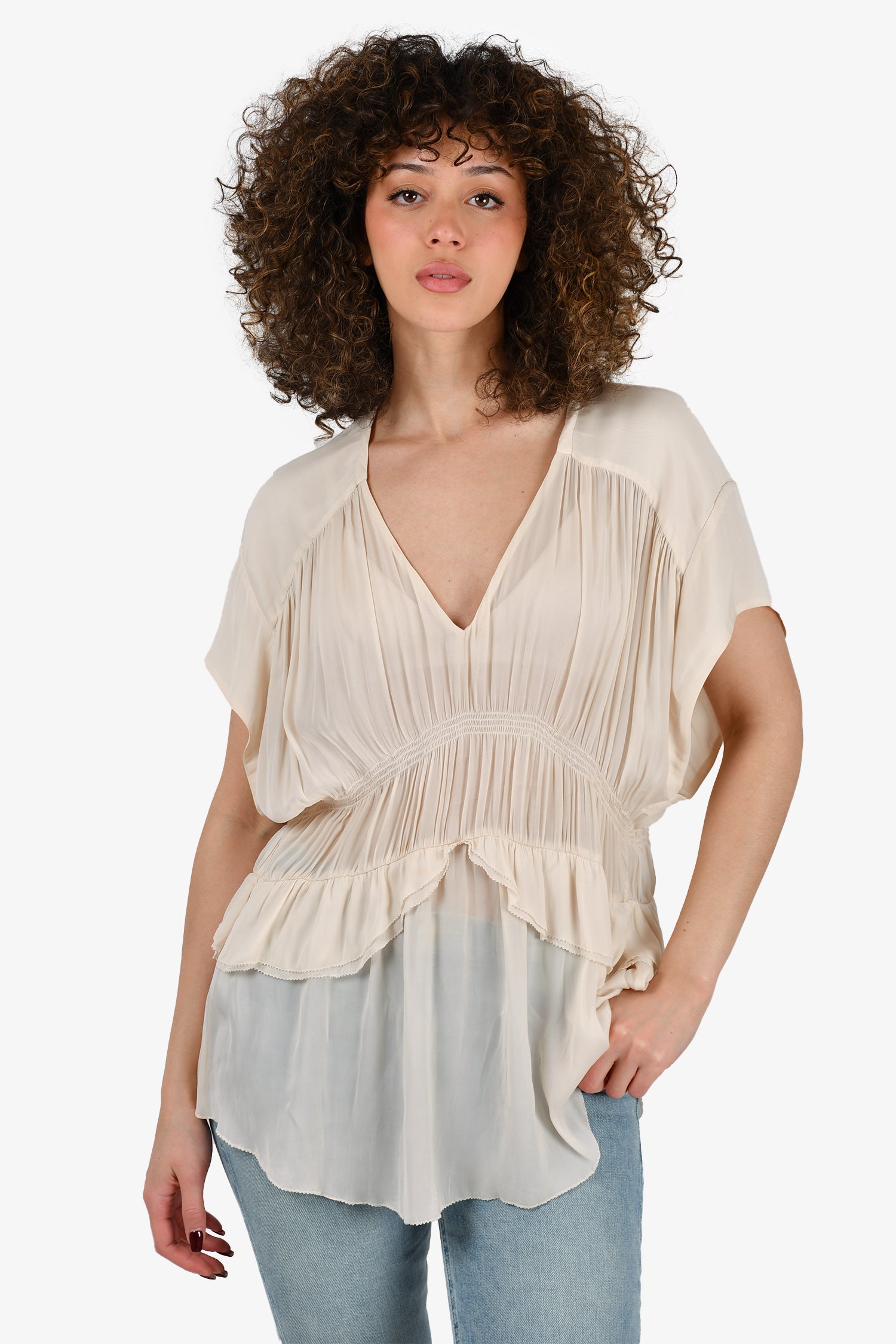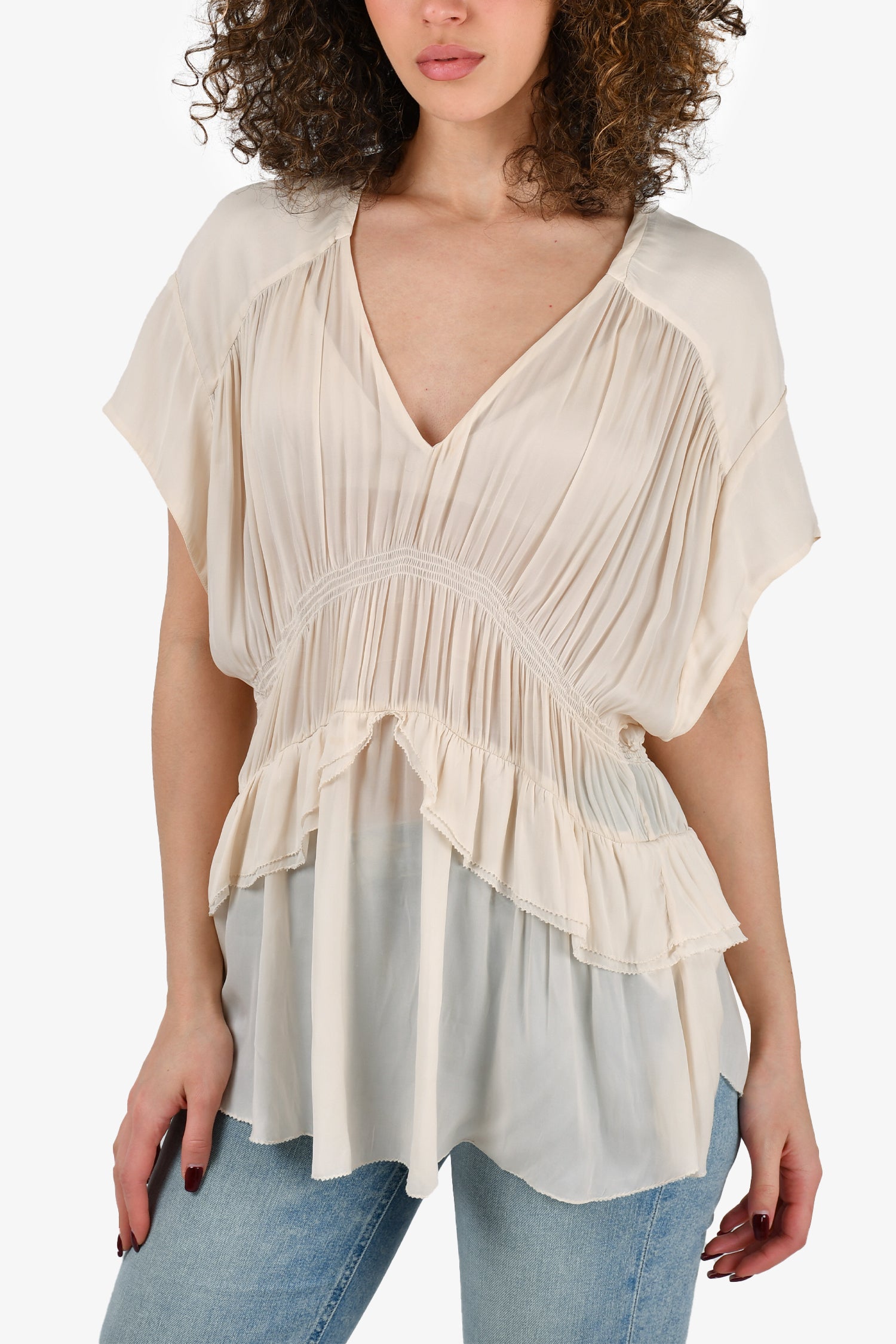 Refresh availabilityIRO Cream Satin 'Gisele' Blouse. V-neck. Pull-on. Ruffled trims throughout. Tonal stitching.
