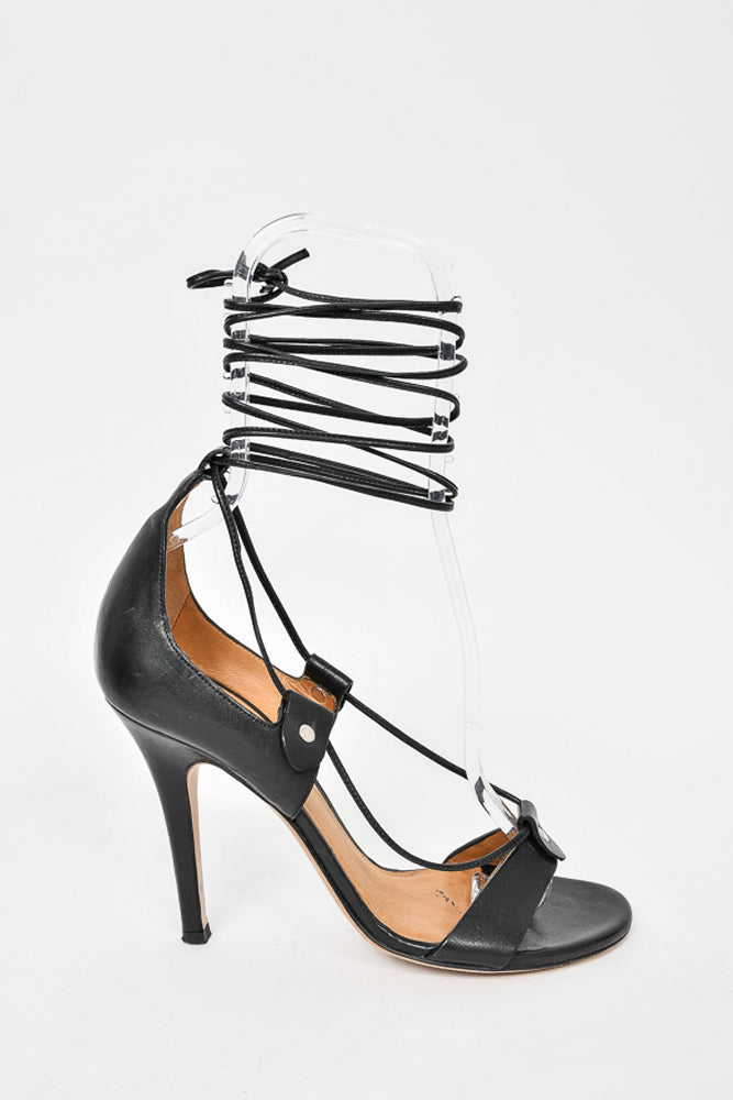 Refresh availabilityIsabel Marant Black Leather Lace Up Heeled Sandal. Lace up closure. Rounded toe. Silver-tone hardware. Tonal stitching.
