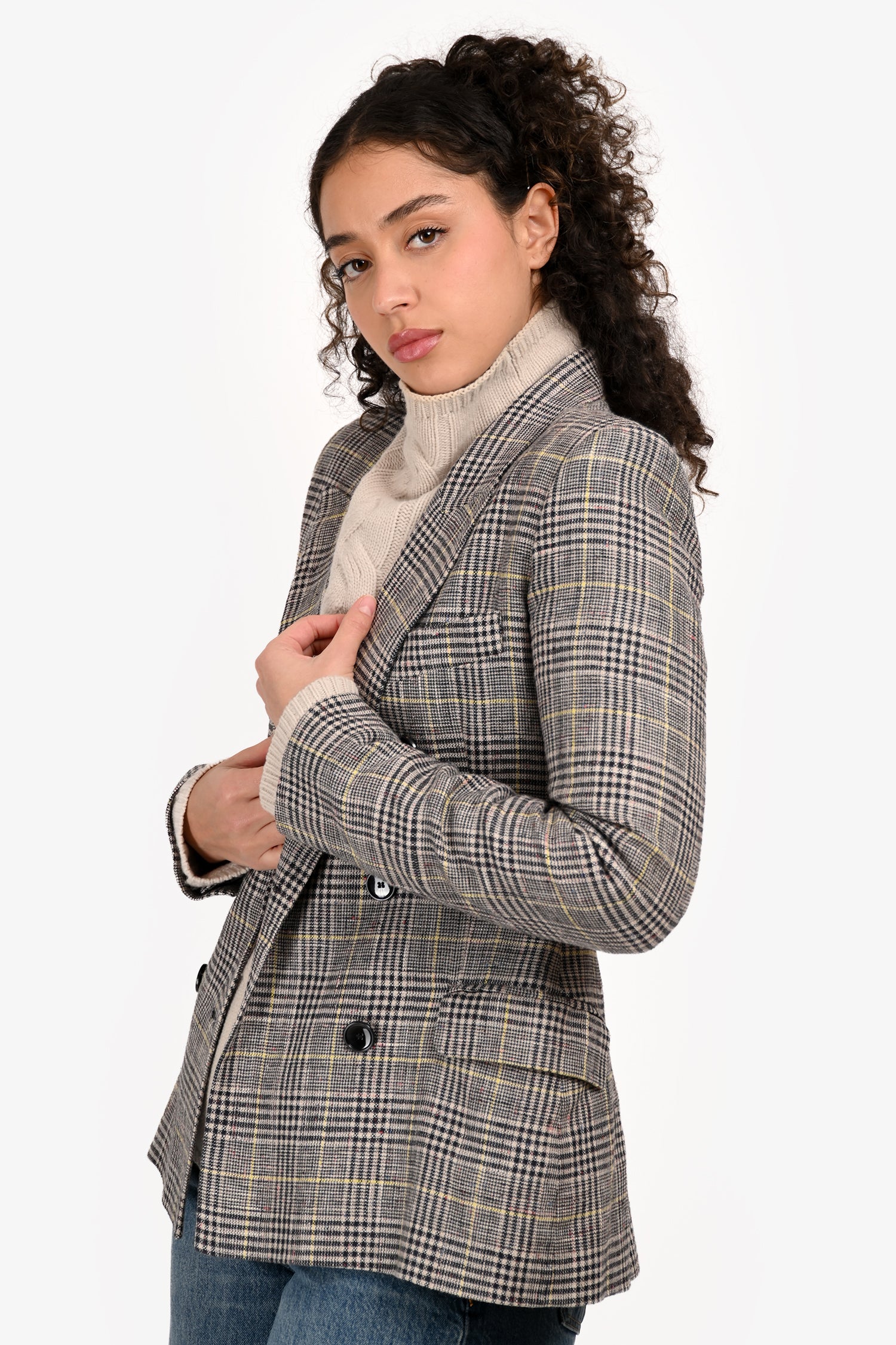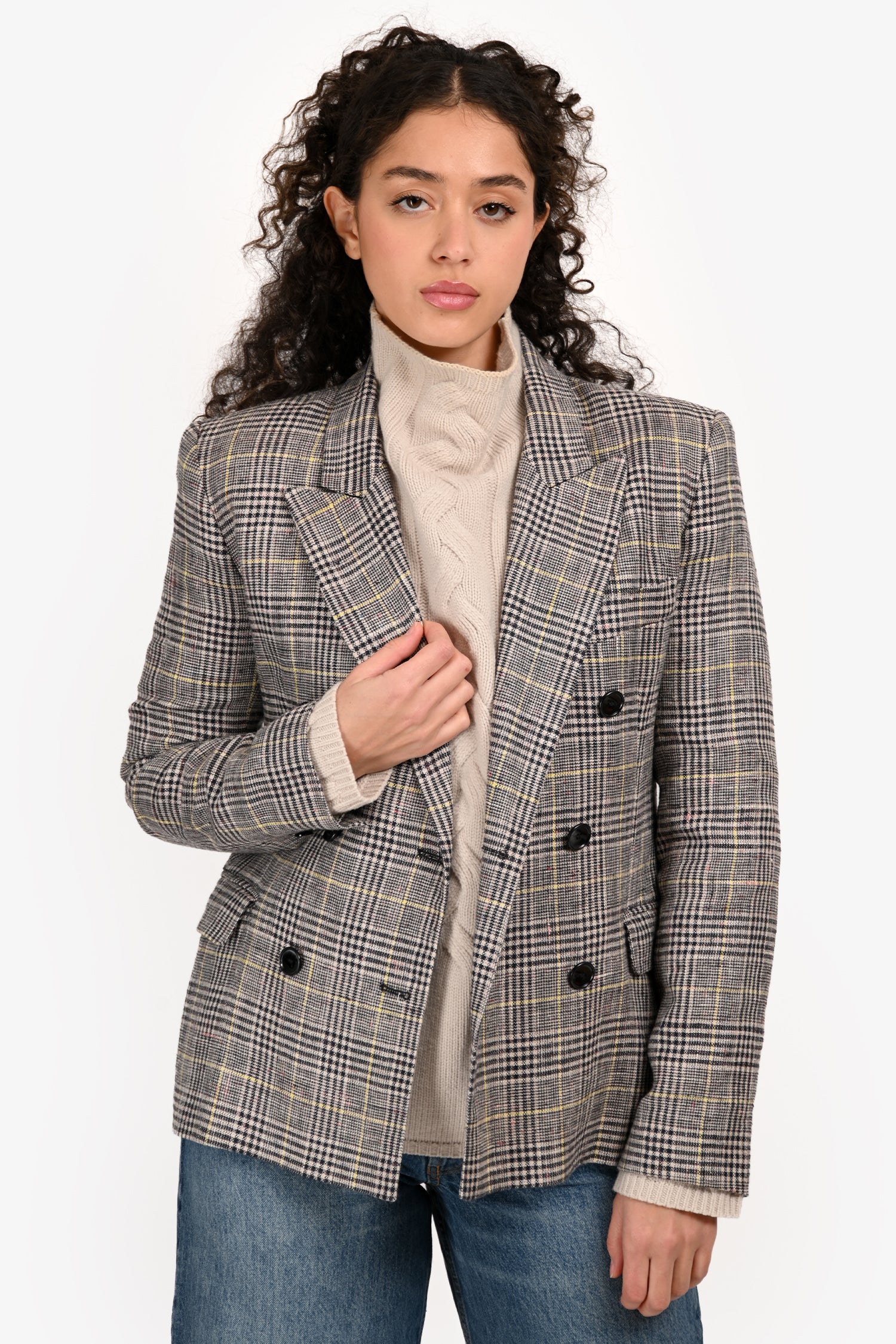 Refresh availabilityIsabel Marant Black/White Check Double Breasted Blazer. Slip-on. Peak lapels. Button closure in the front. 2 exterior pockets with fold-over closure. Single welt pocket in the front. Lined. Tonal stitching.