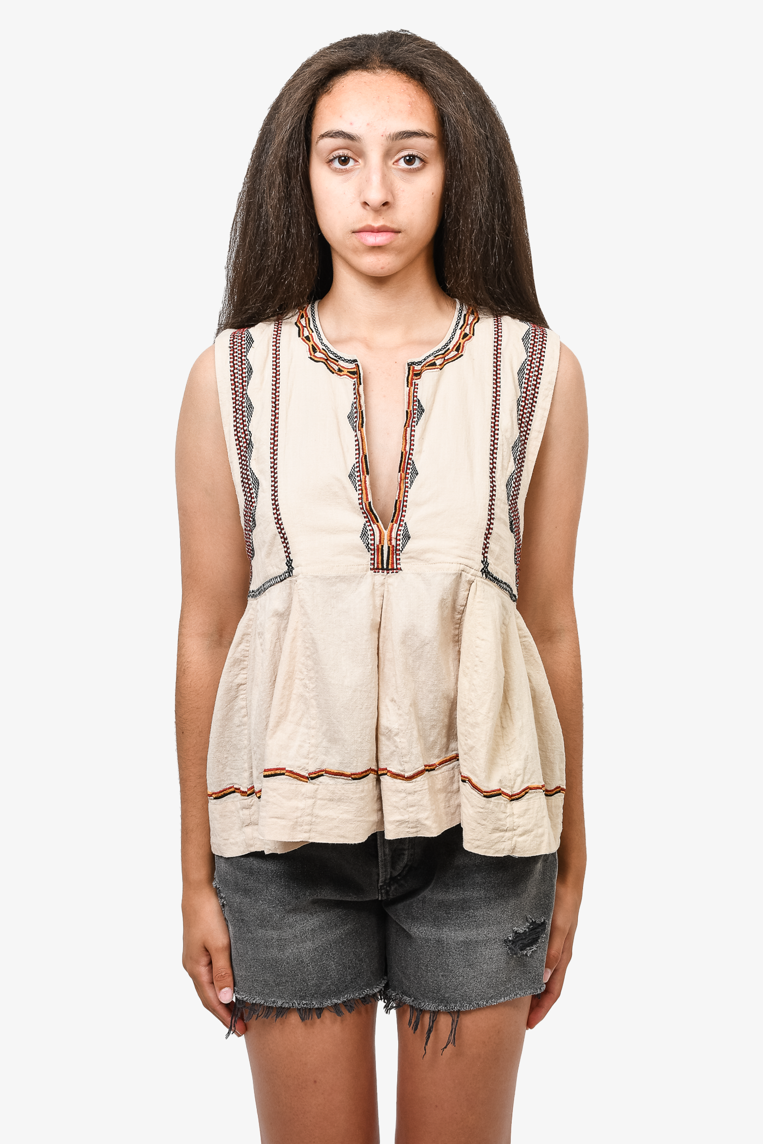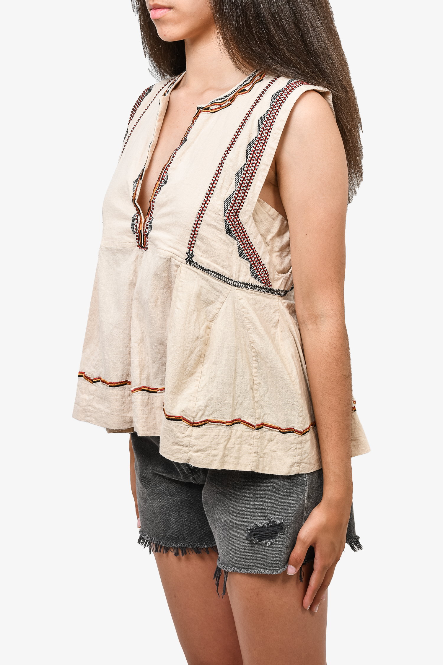 Refresh availabilityIsabel Marant Etoile Beige Cotton Red/Black Embroidered Sleeveless Top. Pullover design. Adjustable V neckline; hook closure. Unlined. Tonal stitching.
