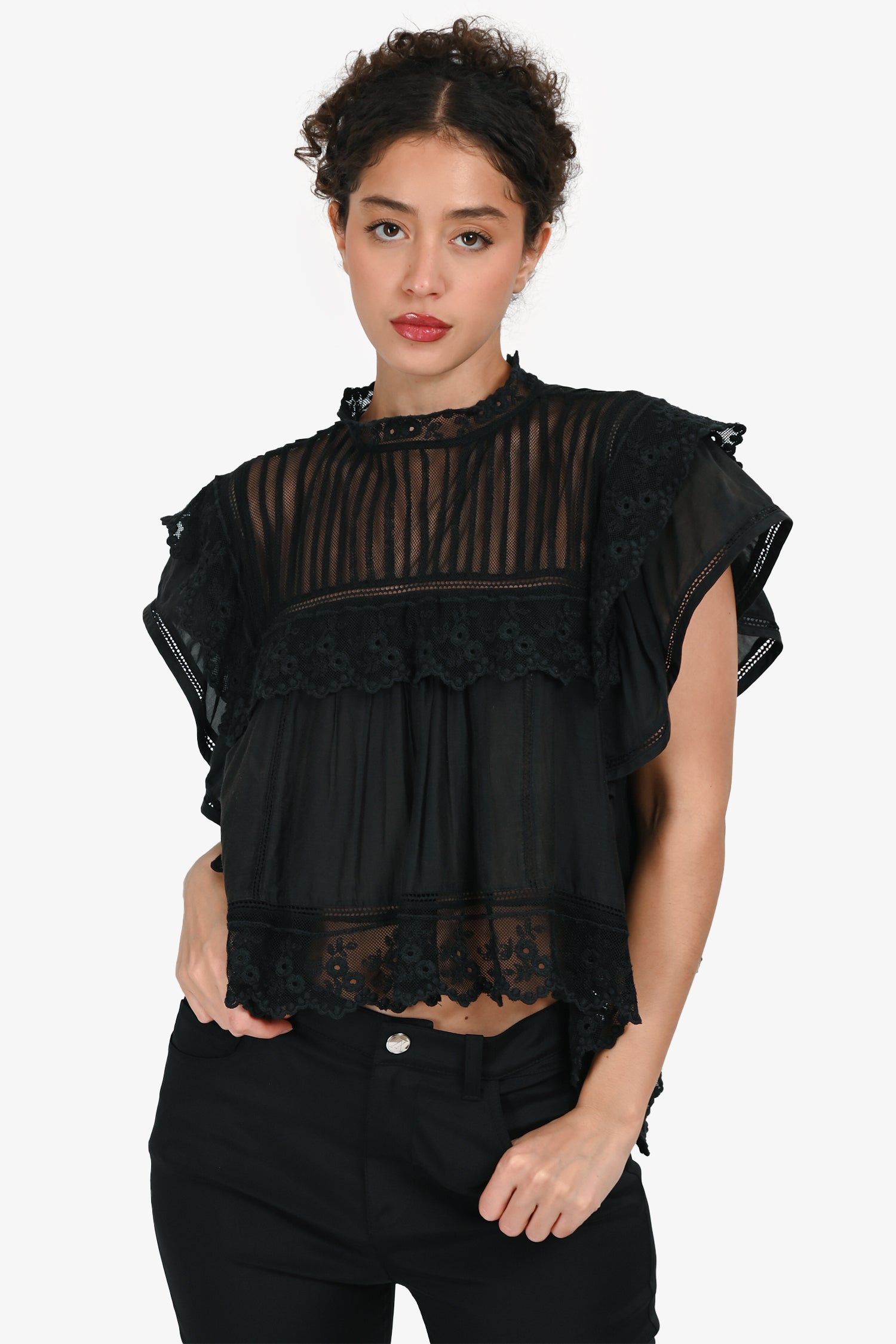 Refresh availabilityIsabel Marant Etoile Black Cotton Frilly Top. Pull-on. Raised neckline with rear button closure. Tonal stitching.