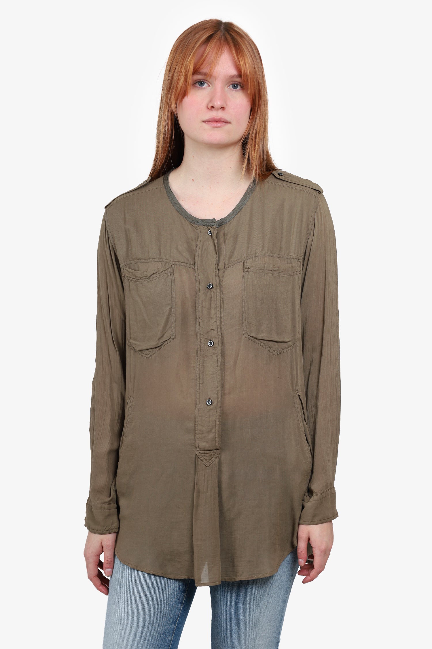 Refresh availabilityIsabel Marant Etoile Green Silk Detail Long-Sleeve Top. Round neckline. Front button closure. 4 Front slip pockets. Unlined. Tonal stitching.