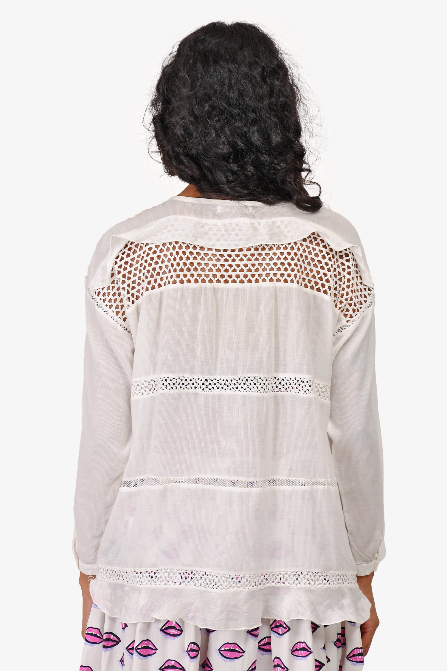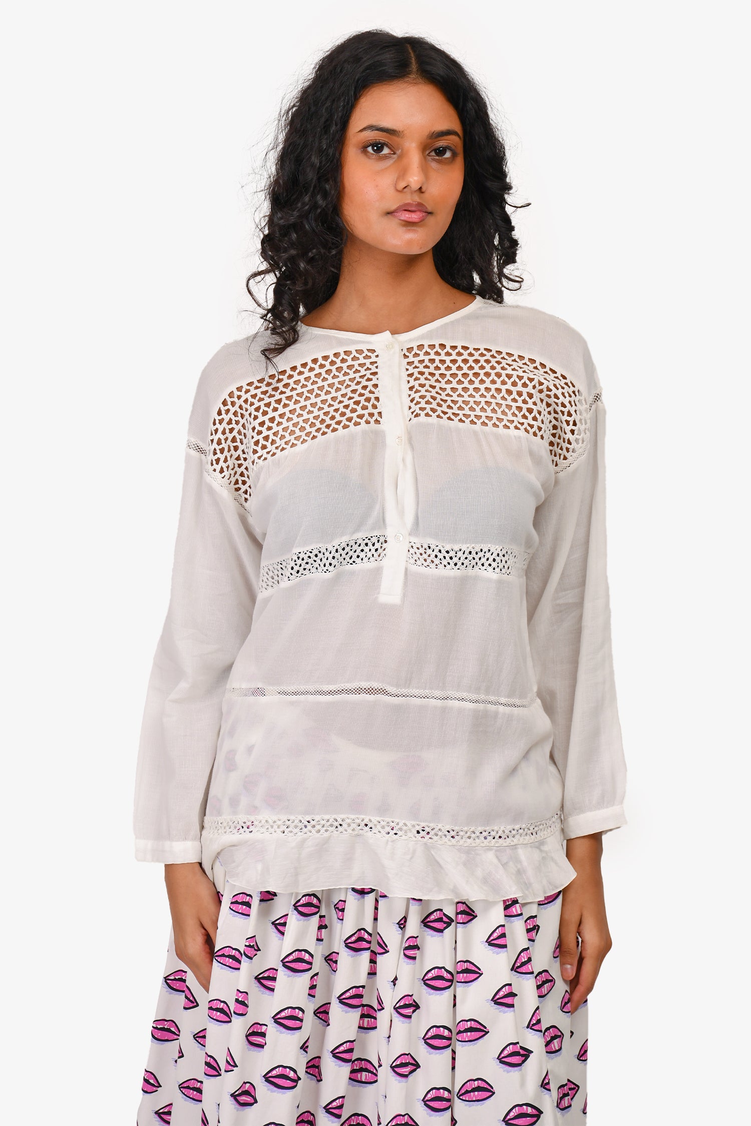 Refresh availabilityIsabel Marant Etoile White Crochet Long-Sleeved Blouse. Front button-up closure. Ruffled hem. Tonal stitching.