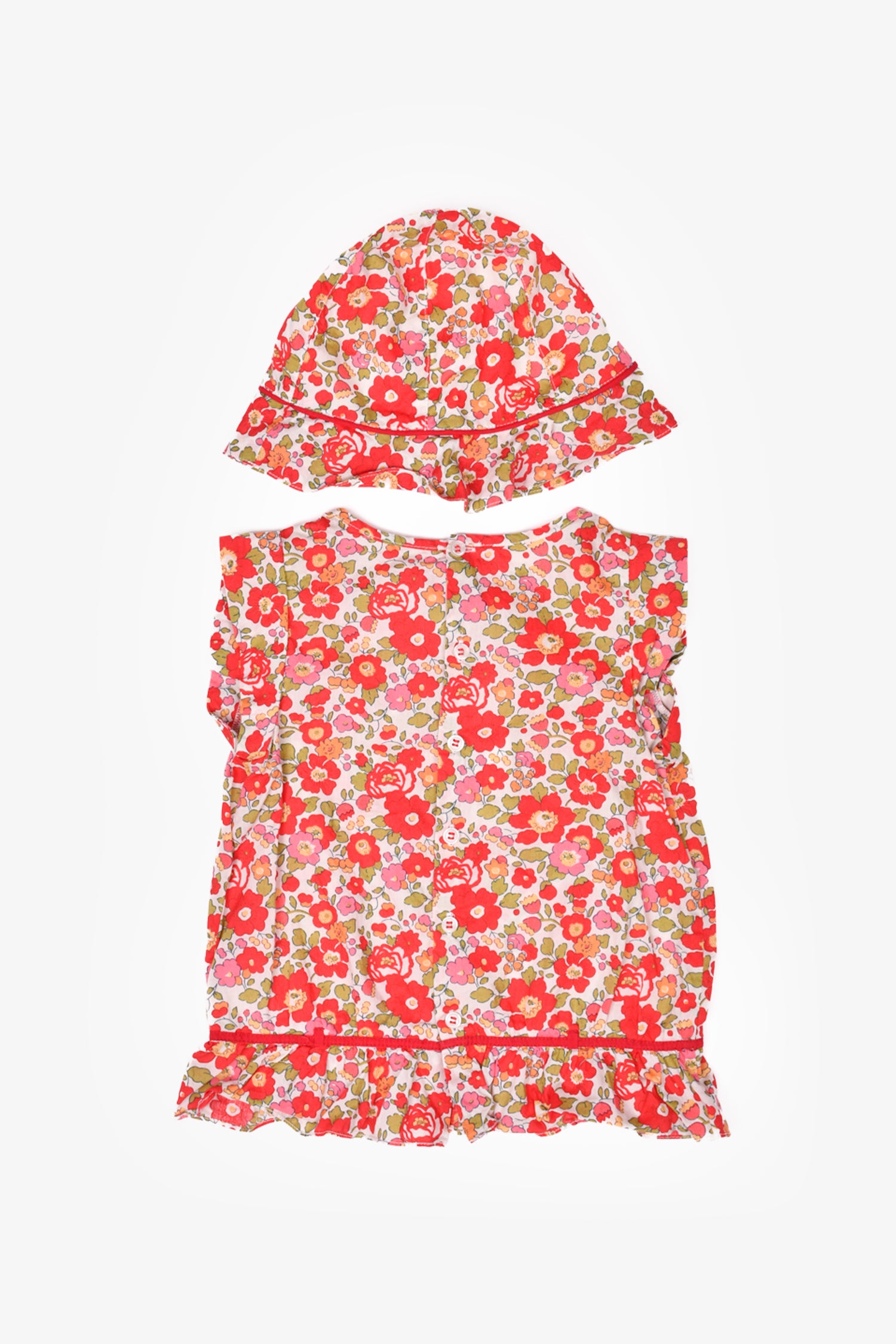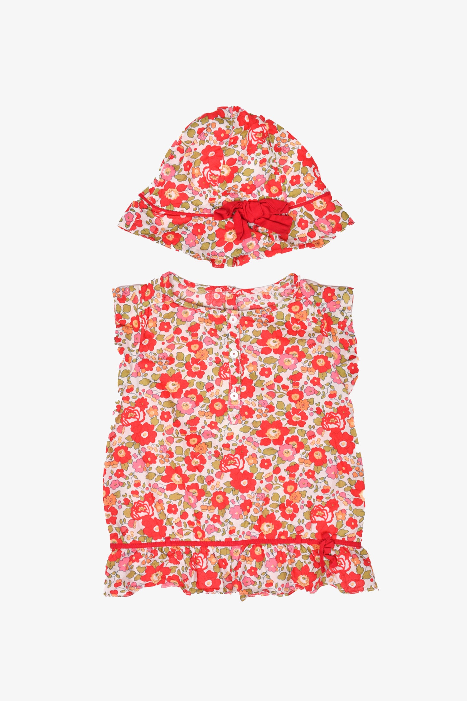 Refresh availabilityJacadi Red/White Floral Printed Ruffle Sleeve Blouse + Sun Hat Set. Pull-on. Tonal stitching.