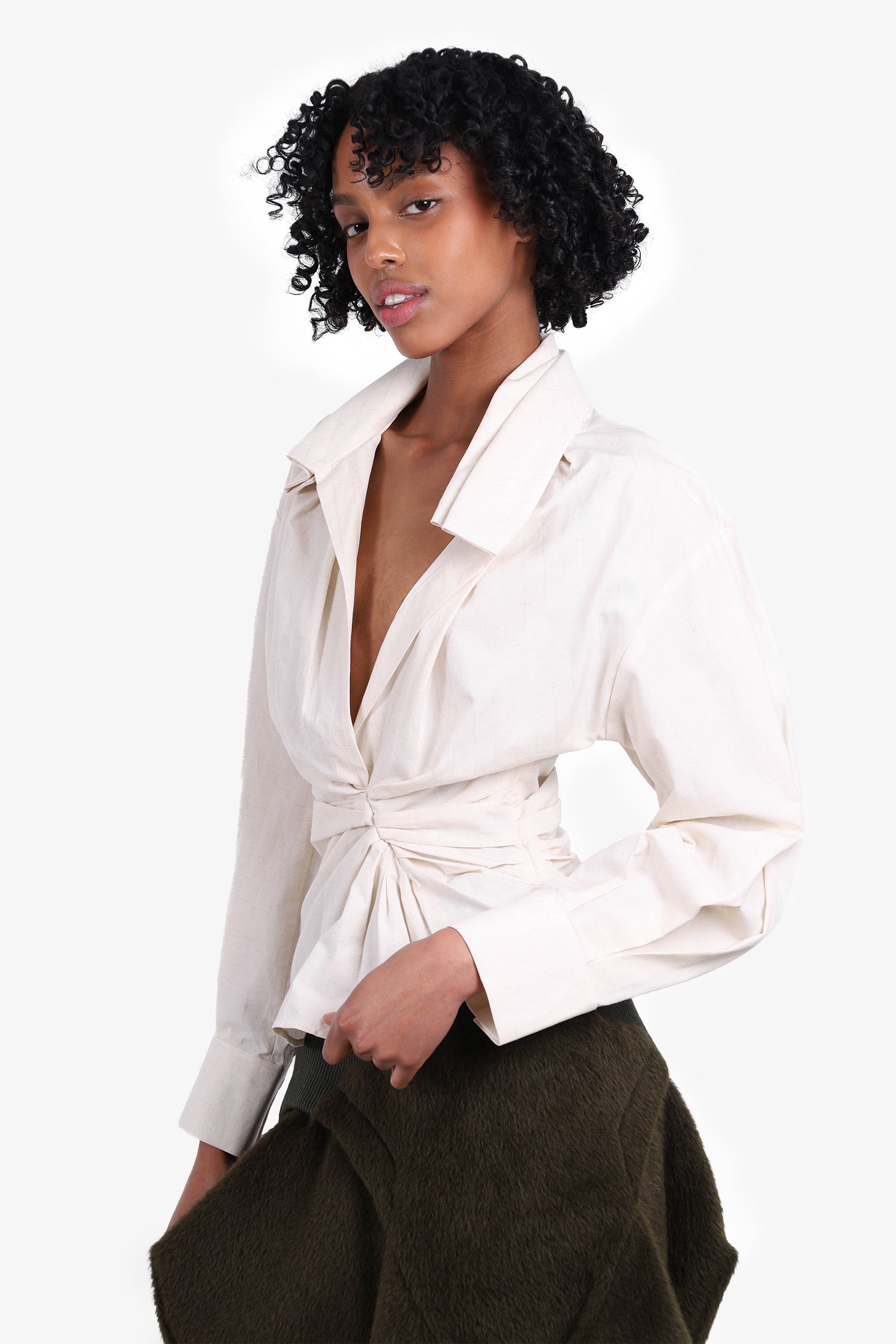 Refresh availabilityJacquemus Beige Linen' La Bomba' Ruched Top. Front v-neckline with collar. Unlined. Tonal stitching.