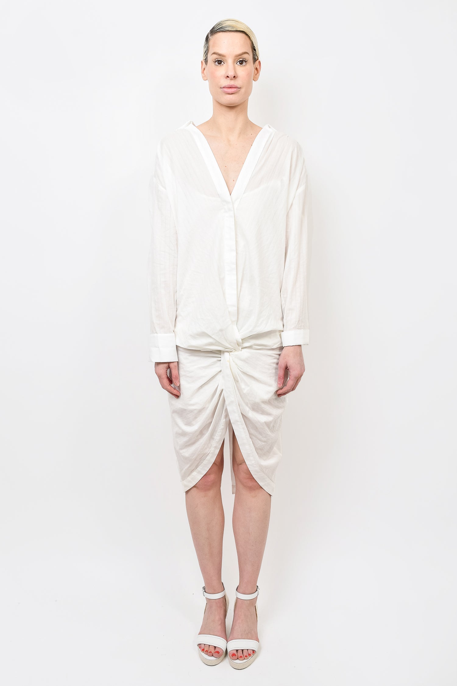 Refresh availabilityJacquemus La Bomba White V-Neck Dress. Slip-on. Front button closures on V neckline. Faux buttons on cuffs. Unlined. Back vent. Tonal stitching.