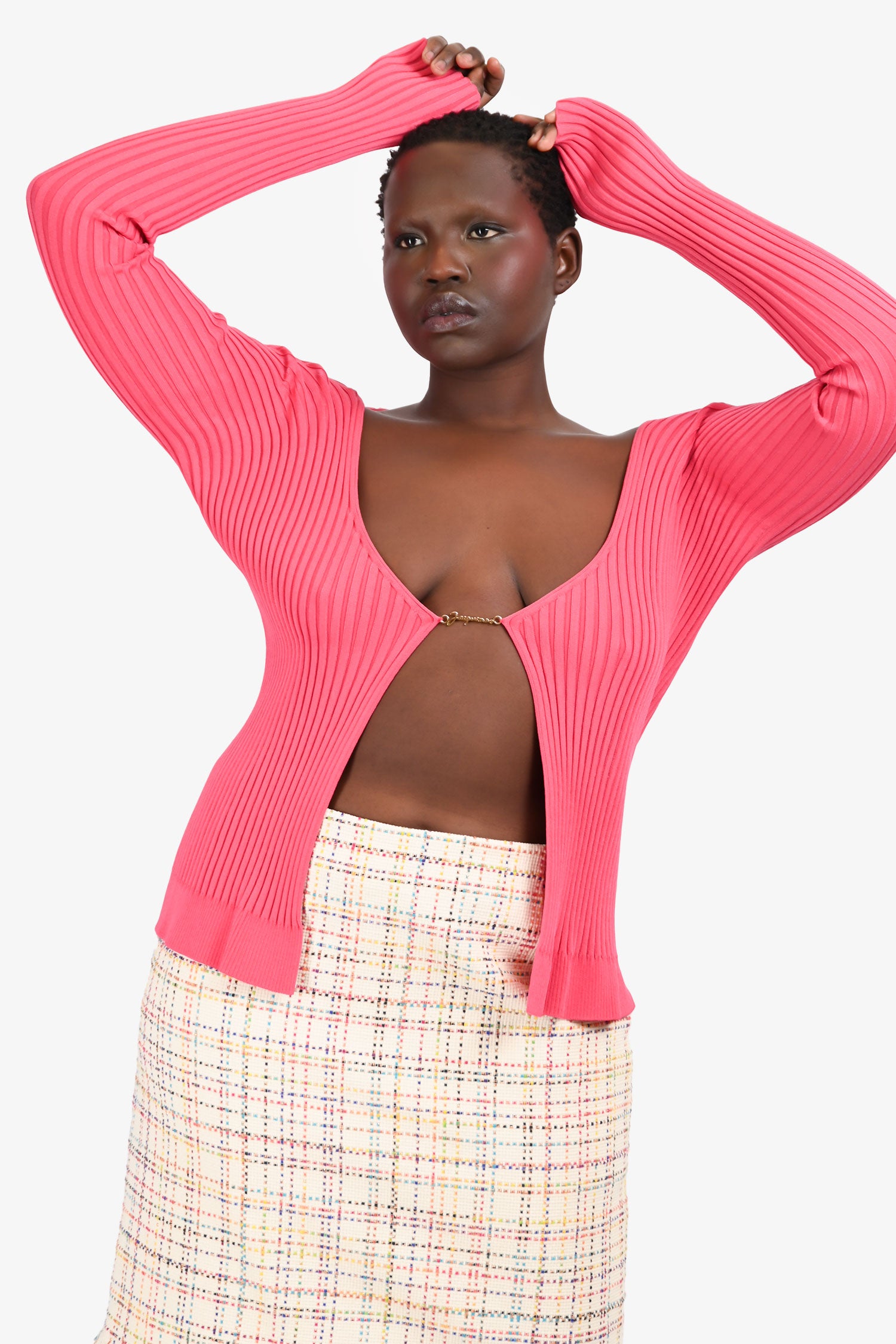 Refresh availabilityJacquemus Pink Le Raphia 'La Maille Pralu Longue' Cardigan. Open front with gold-tone logo detail. Unlined. Tonal stitching.