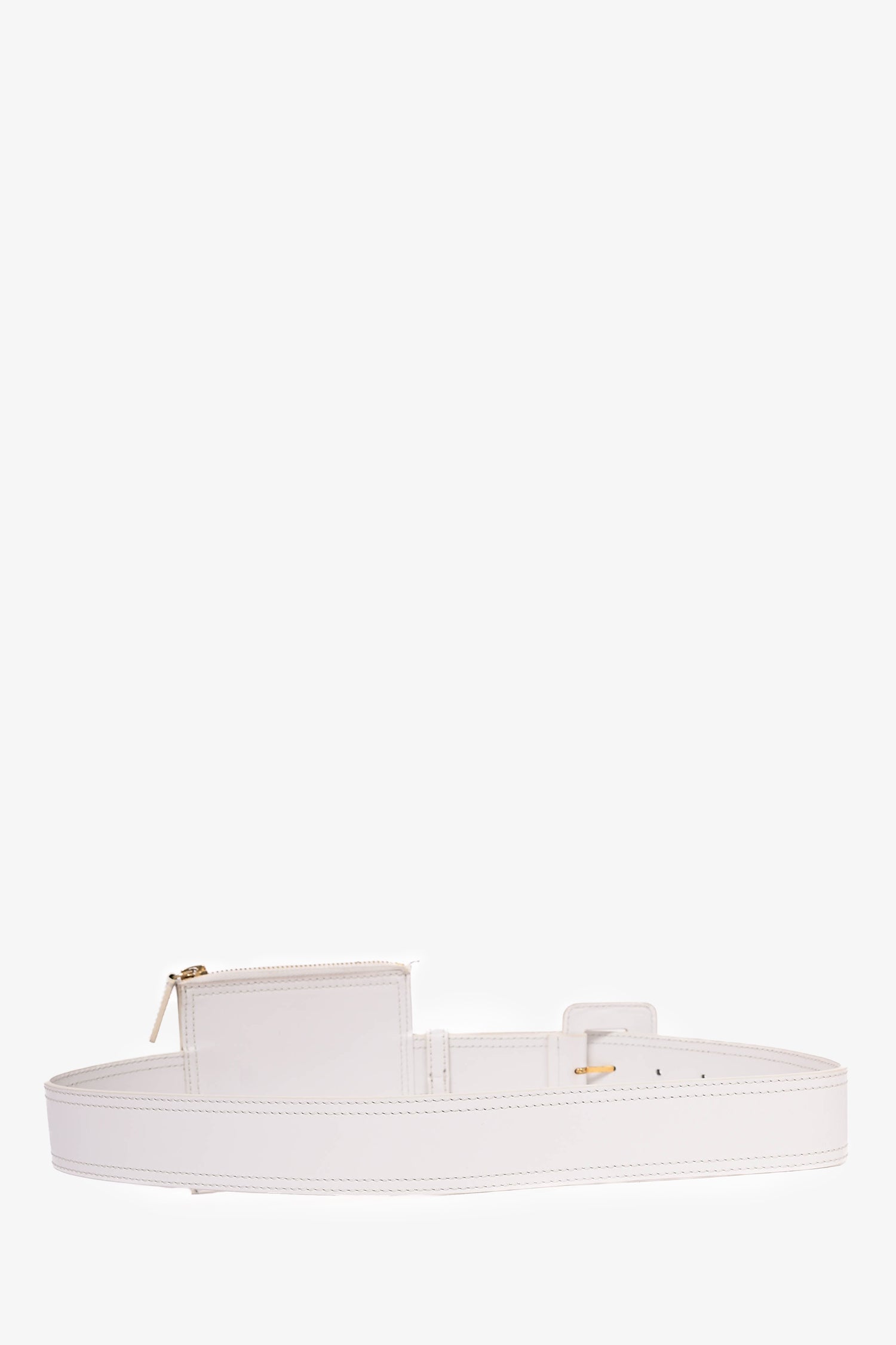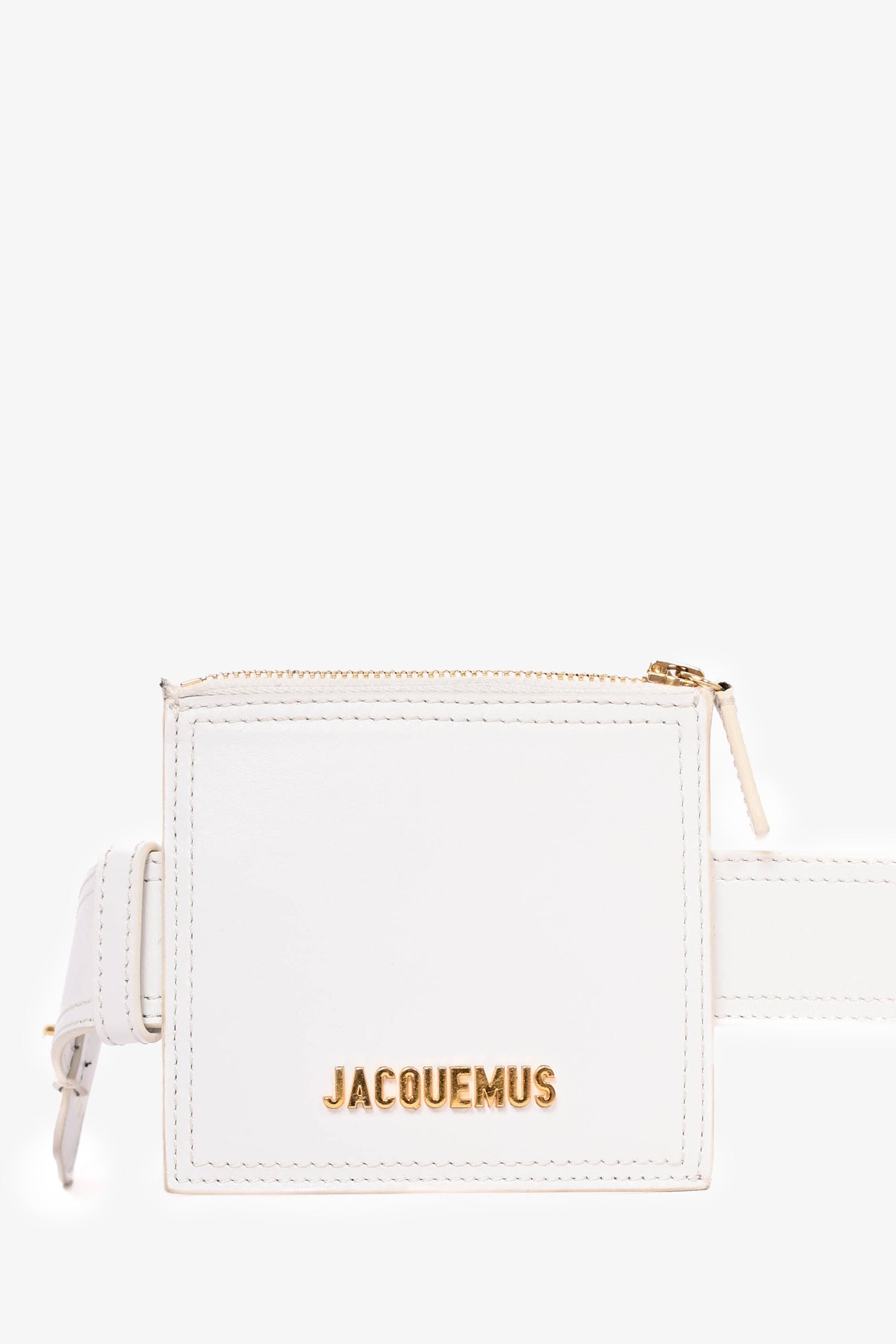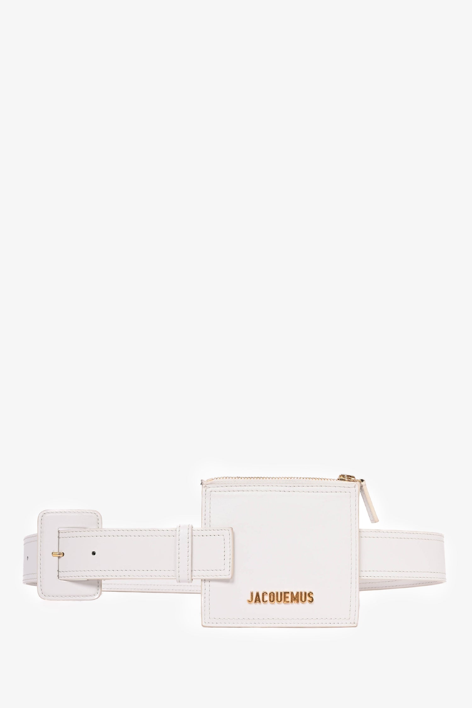 Refresh availabilityJacquemus White Leather Belt with Pouch. Singular interior compartment with zip closure. Gold tone hardware. Tonal stitching.
