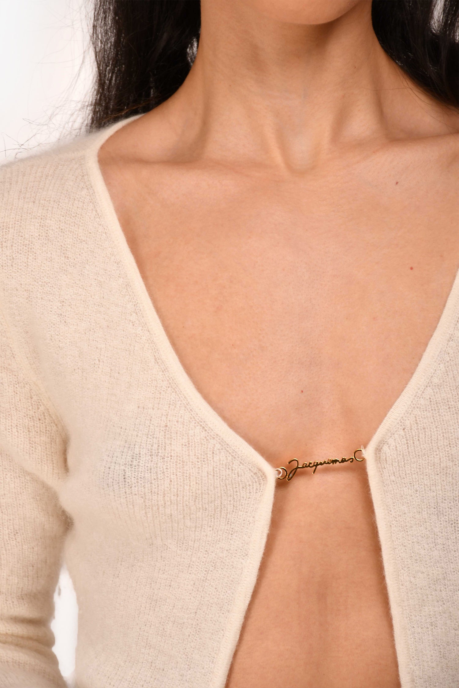 Refresh availabilityJaquemus White Mohair La Maille Pralu Longue Logo Cardigan. Gold-tone hardware. Pull-over design. Tonal stitching.