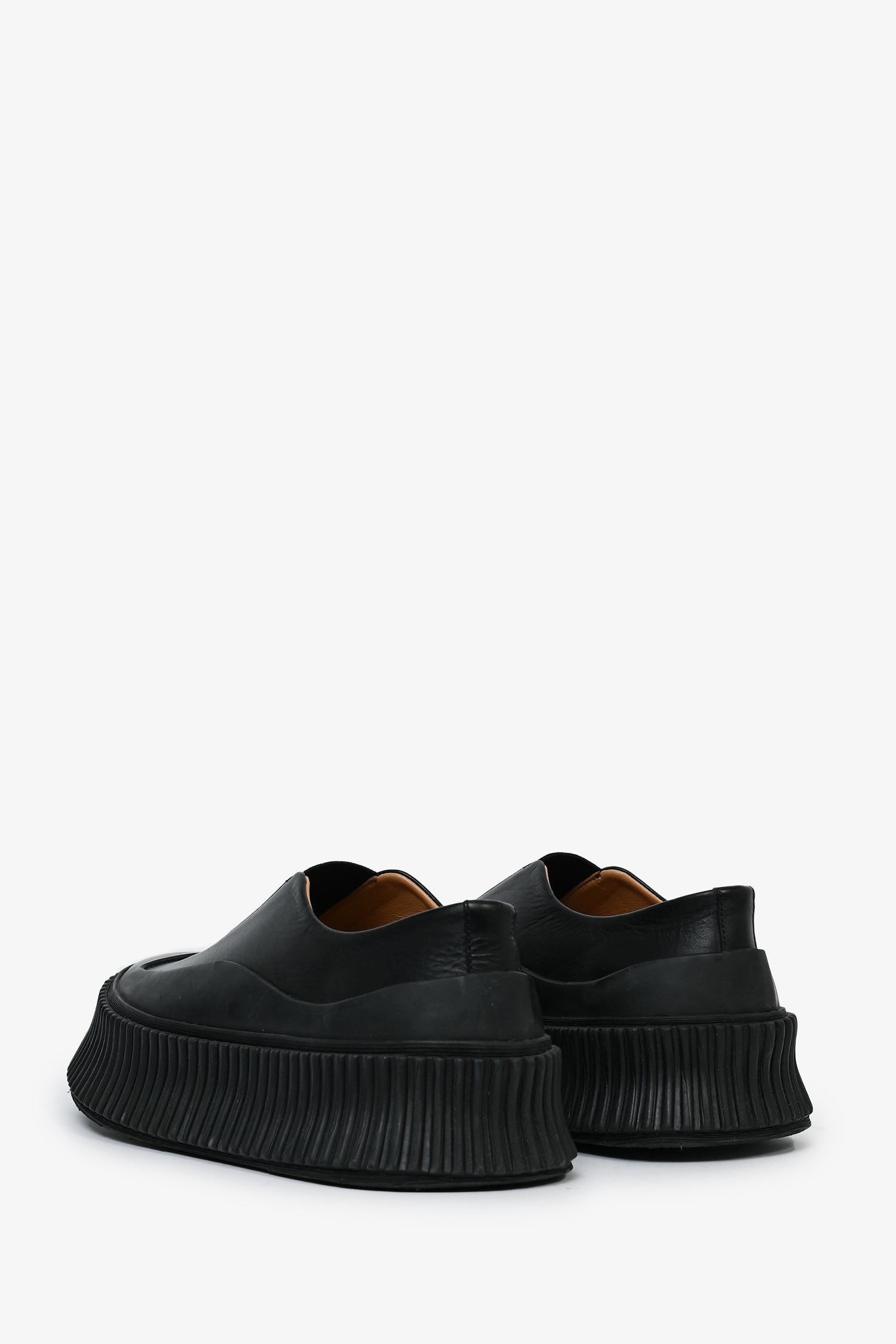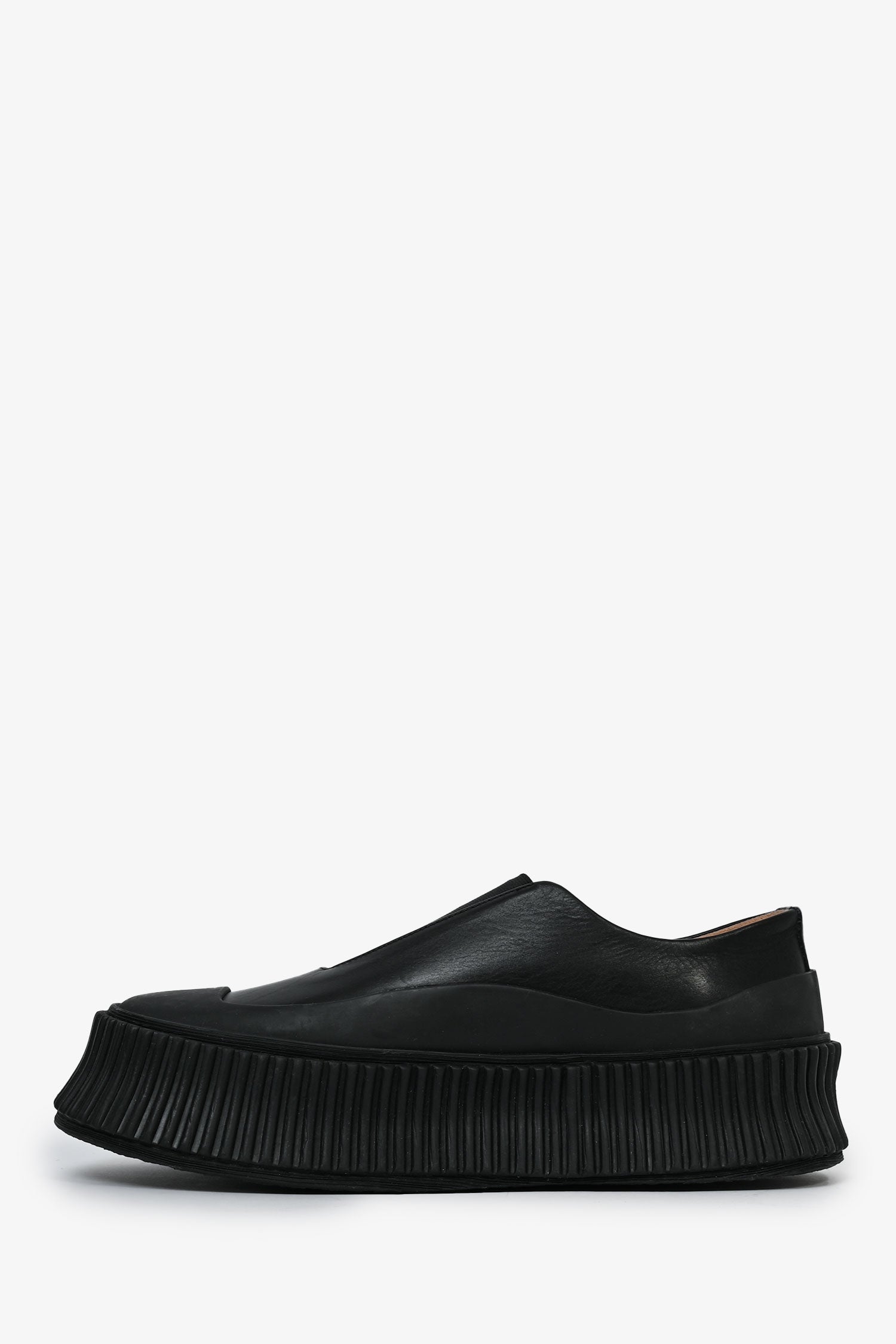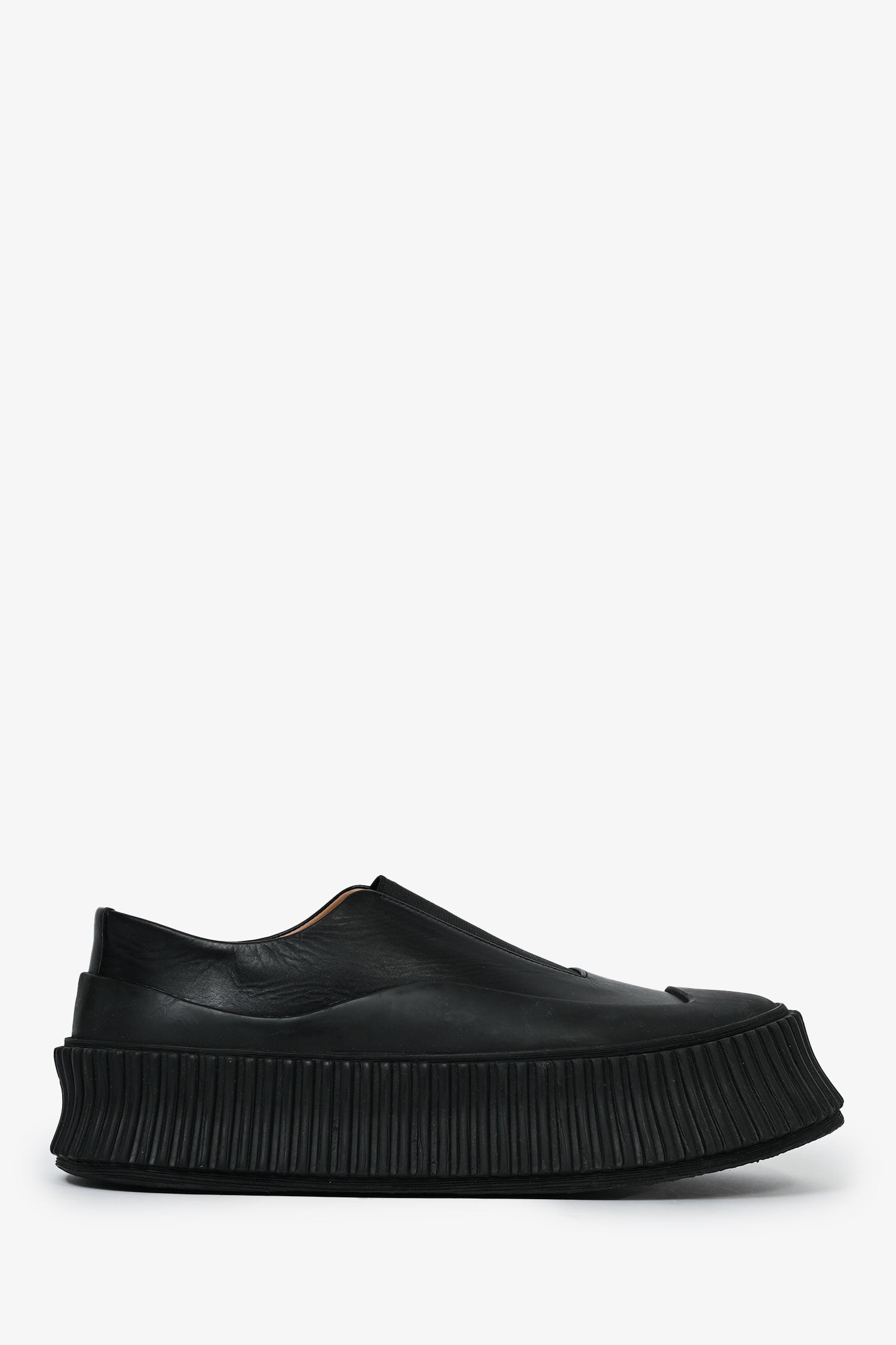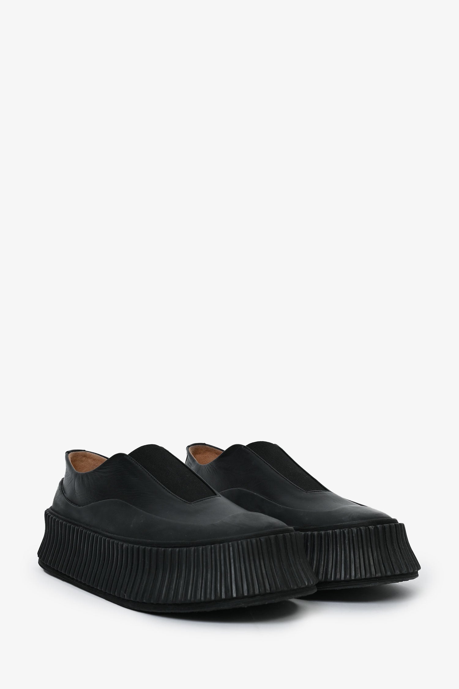 Refresh availabilityJil Sander Black Baby Calfskin 'Agnellato' Slip On Sneakers. Round toe. Slip-on. Ribbed platform detailed soles. Tonal stitching.