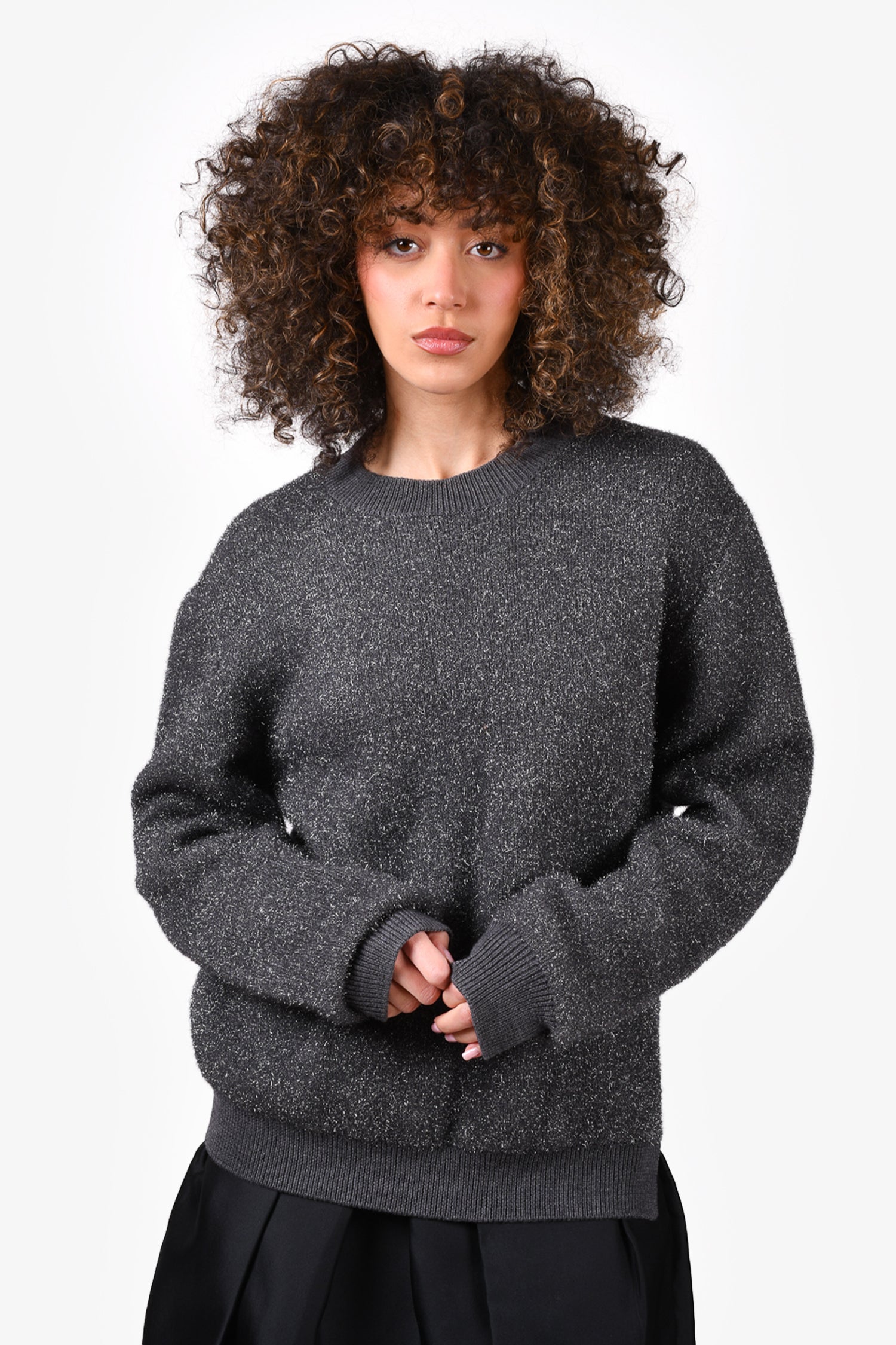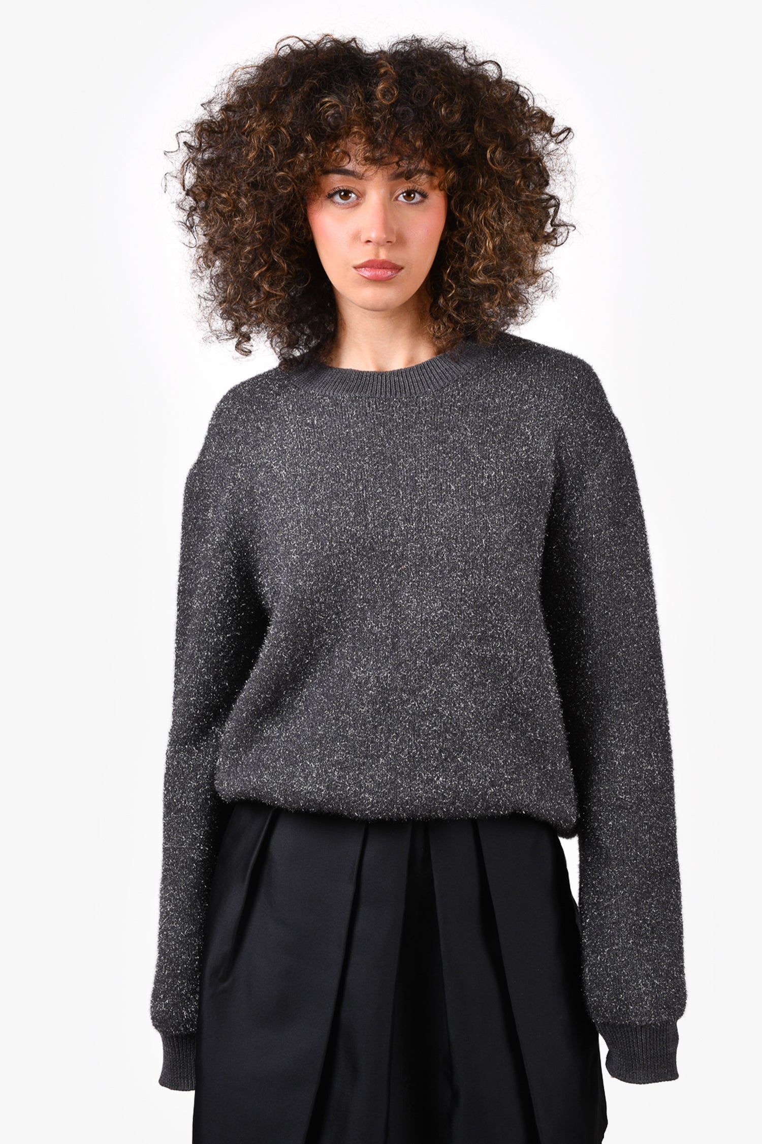 Refresh availabilityJil Sander Grey Sparkle Wool Blend Crewneck Sweater. Round neck. Pull-on. Ribbed neck, cuffs and hem. Tonal stitching.