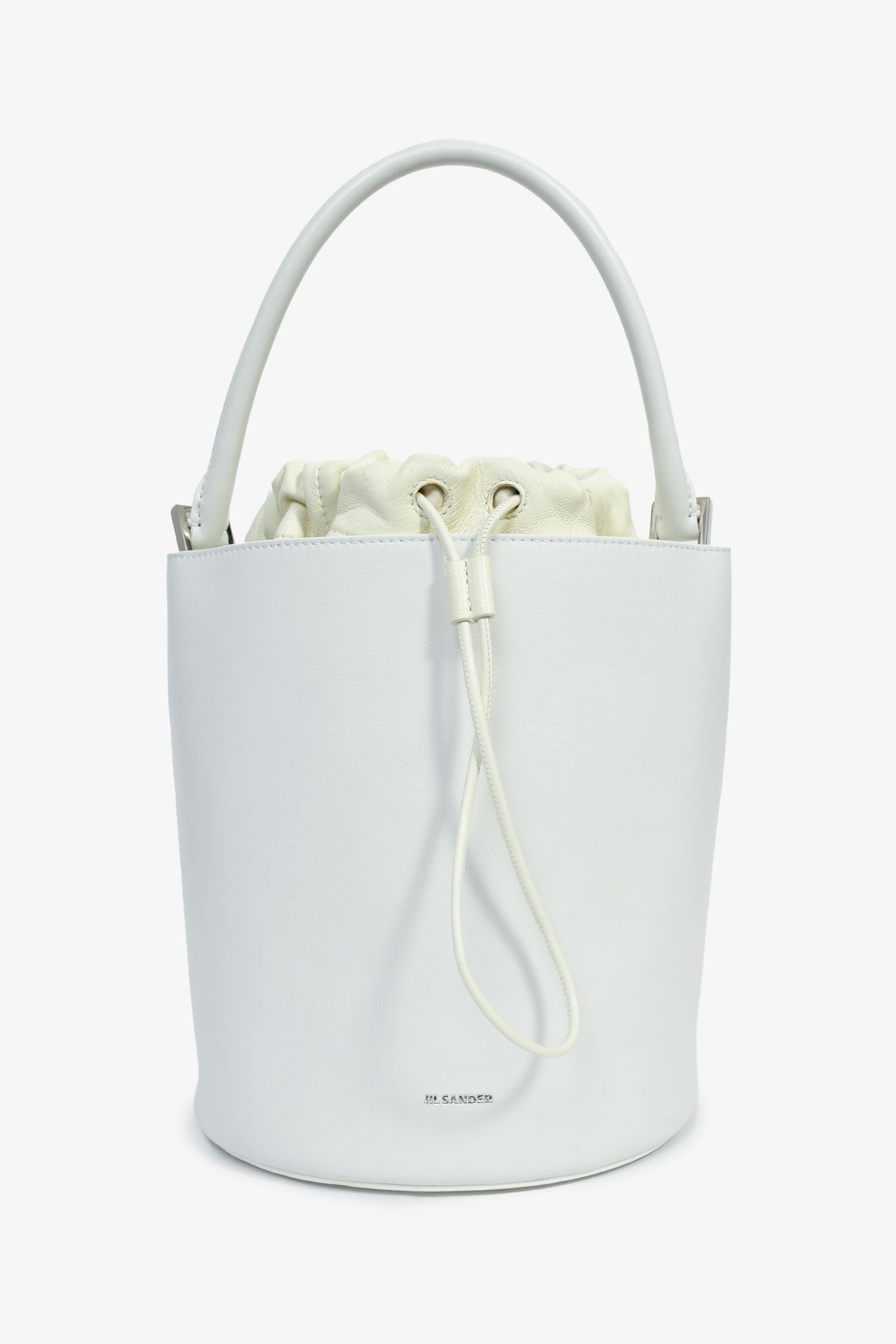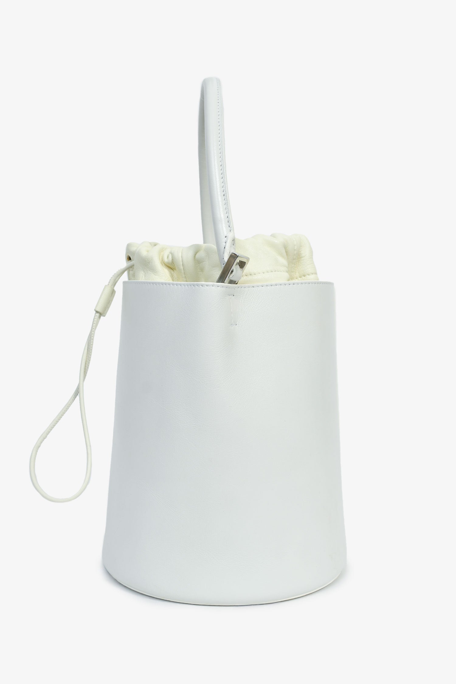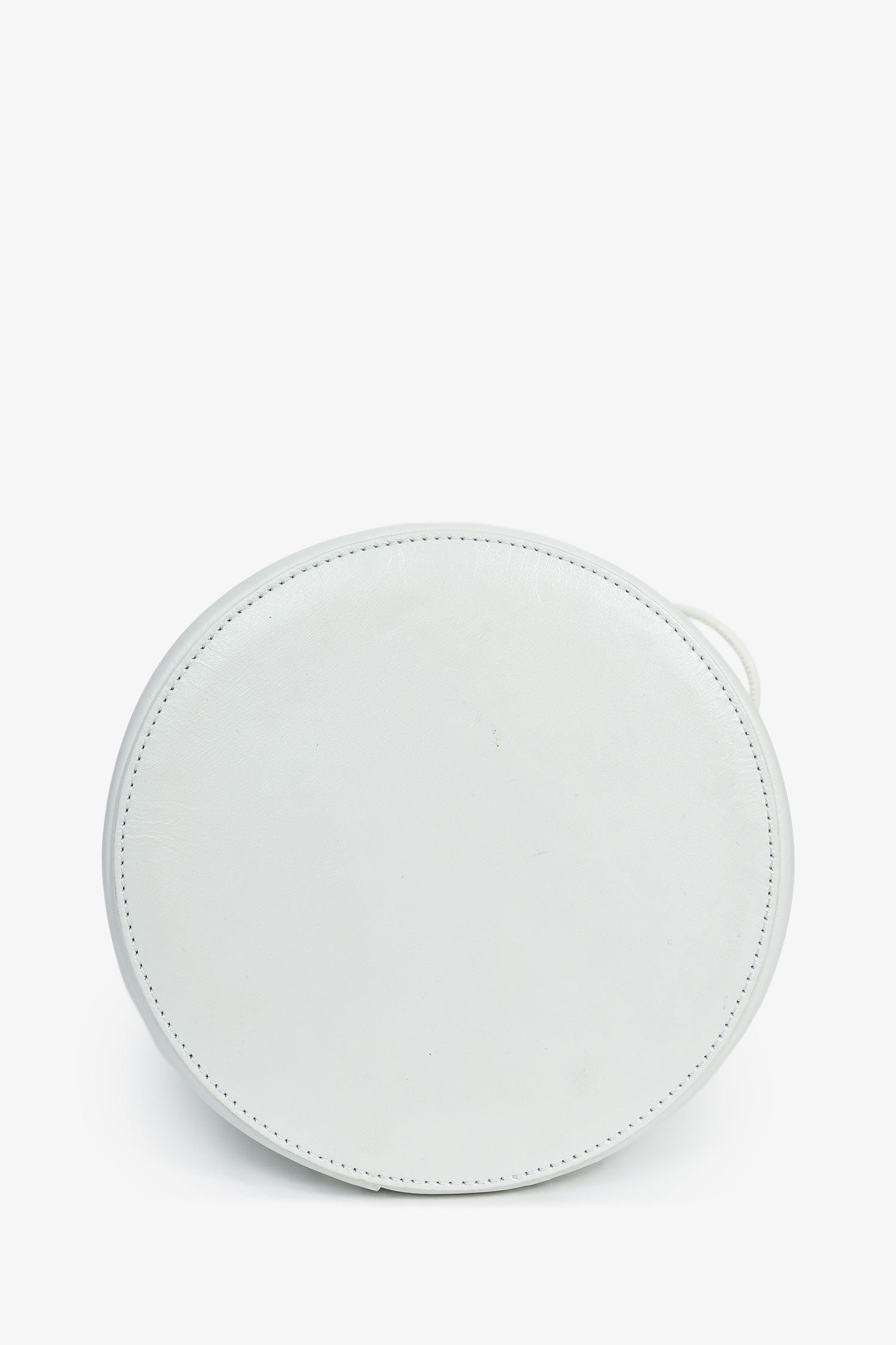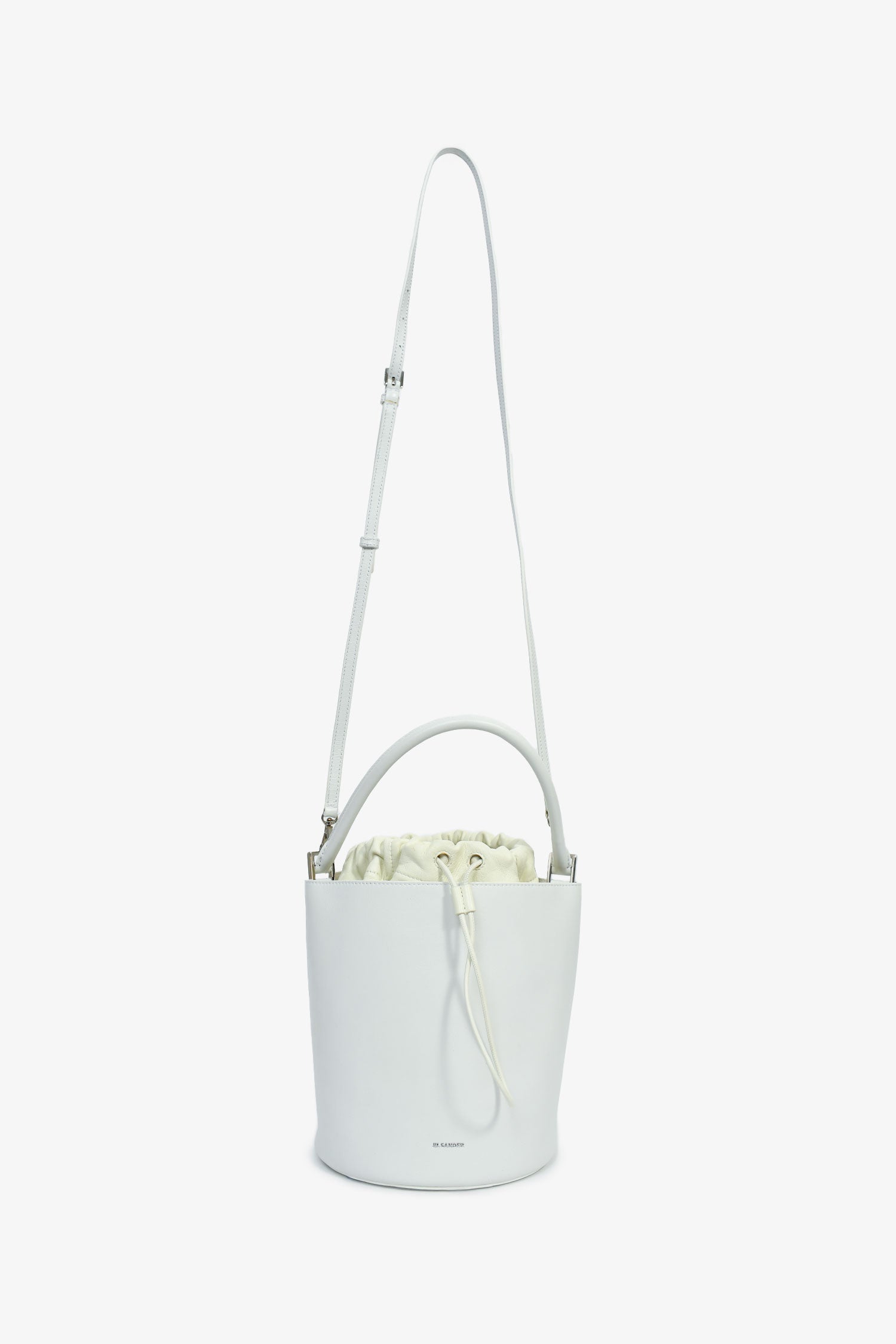Refresh availabilityJil Sander White Leather Drawstring Bucket Crossbody Bag. Silver-tone hardware. Adjustable interior pull-tab. Textile-lined interior. Tonal stitching.