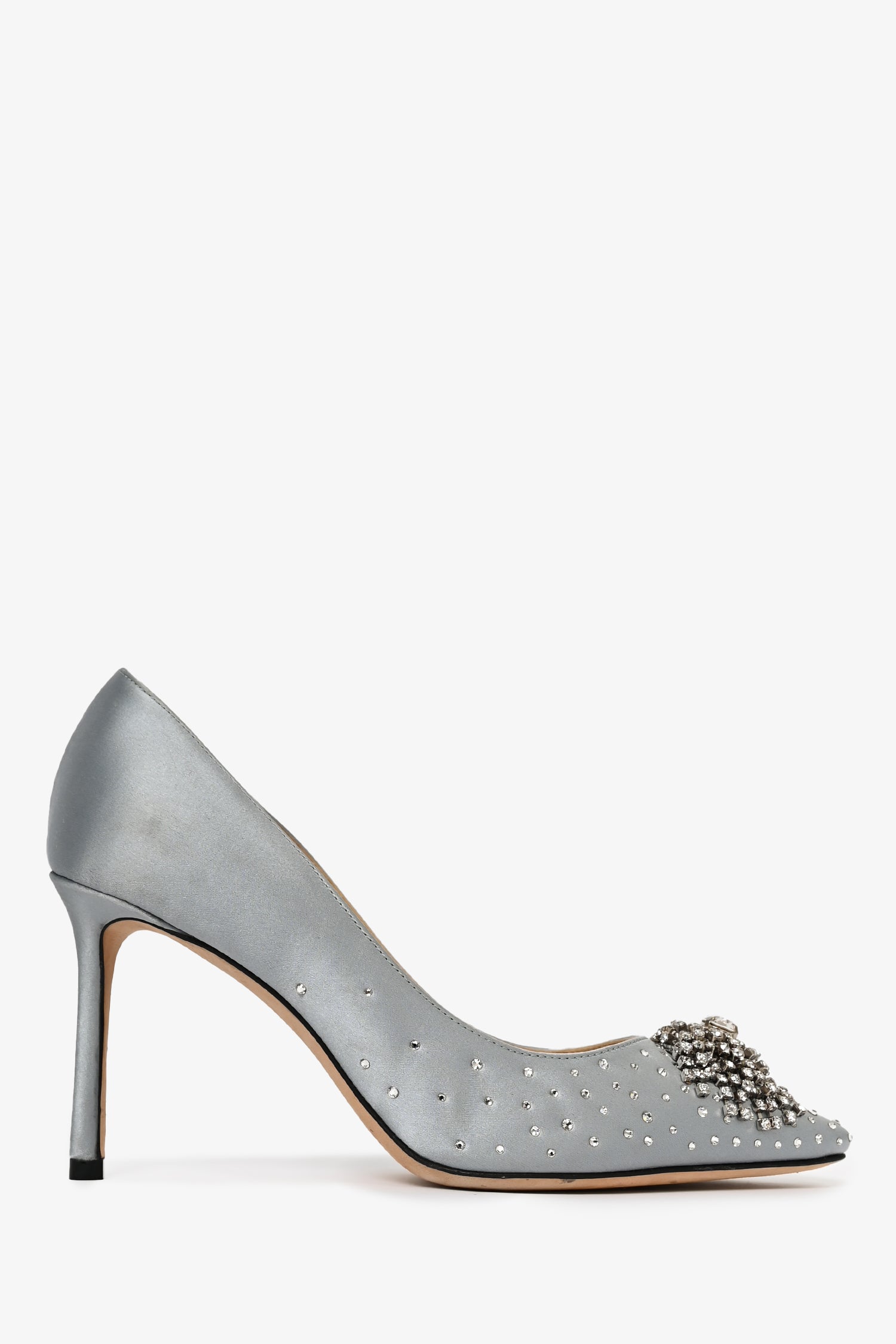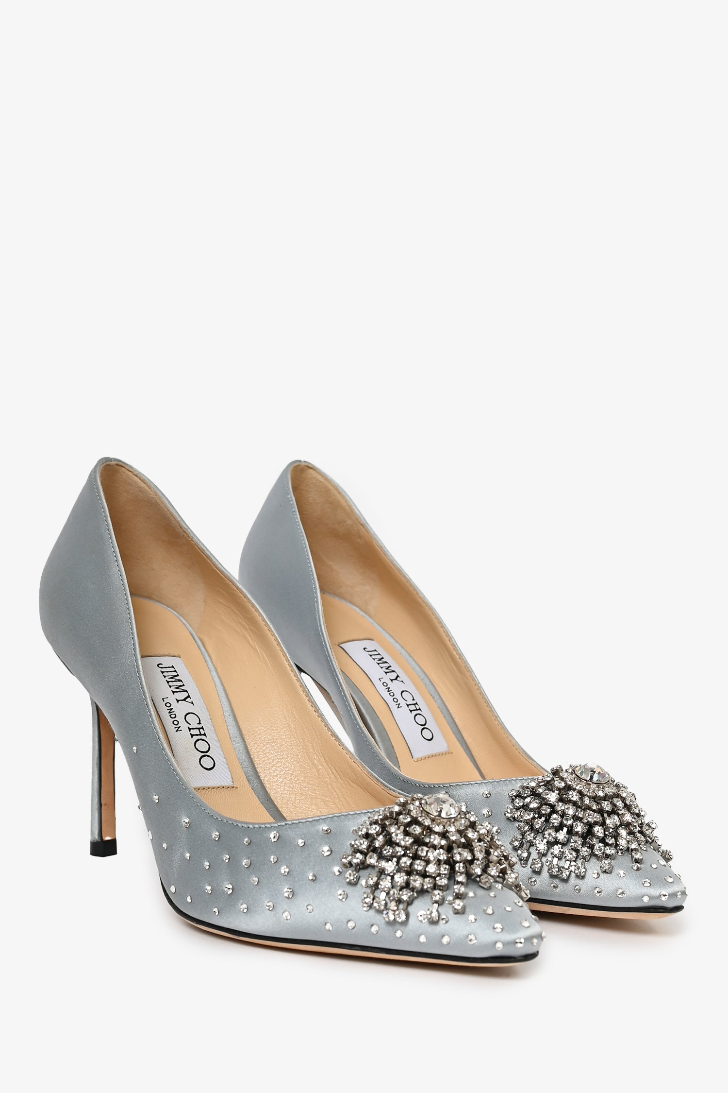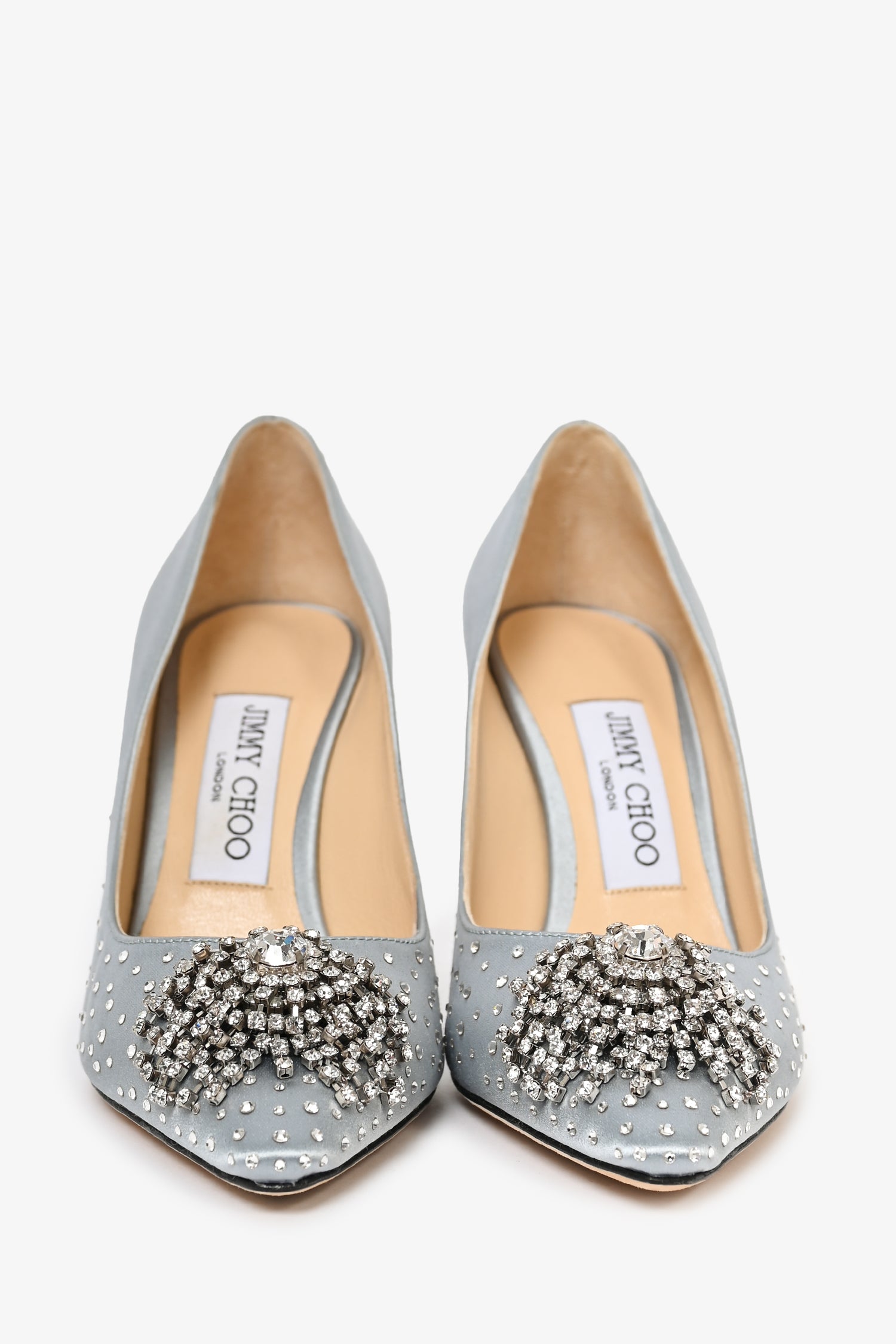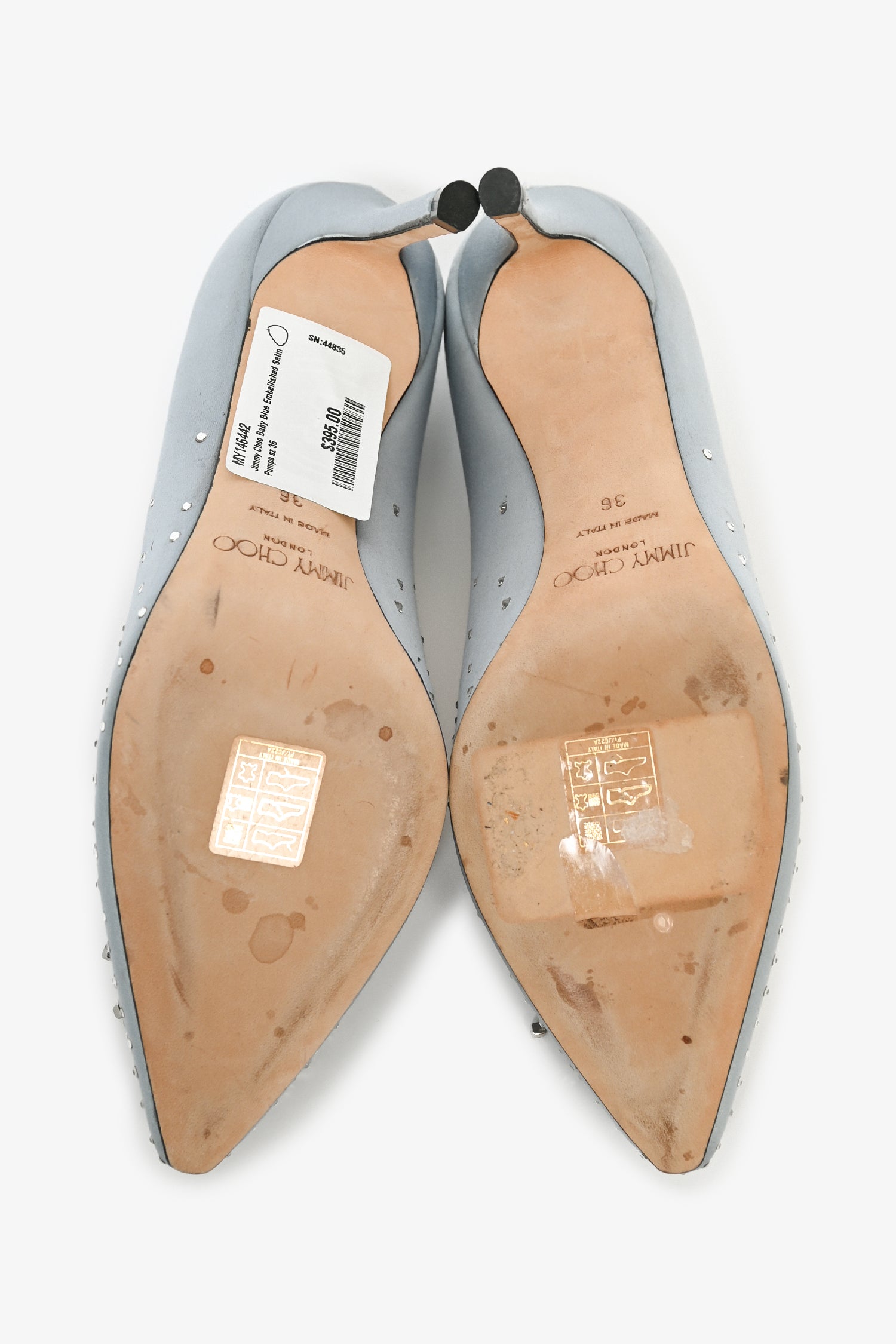 Refresh availabilityJimmy Choo Baby Blue Embellished Satin Pumps. Pointed toe front. Crystal embellishment throughout. Leather lined interior. Tonal stitching.