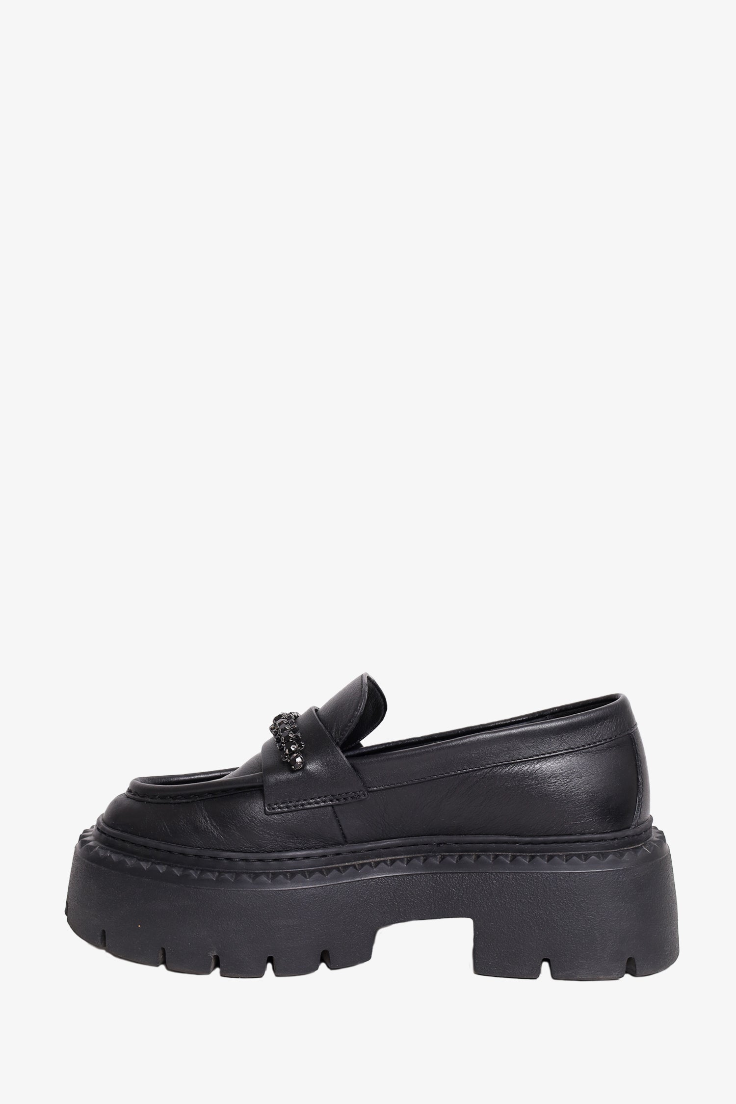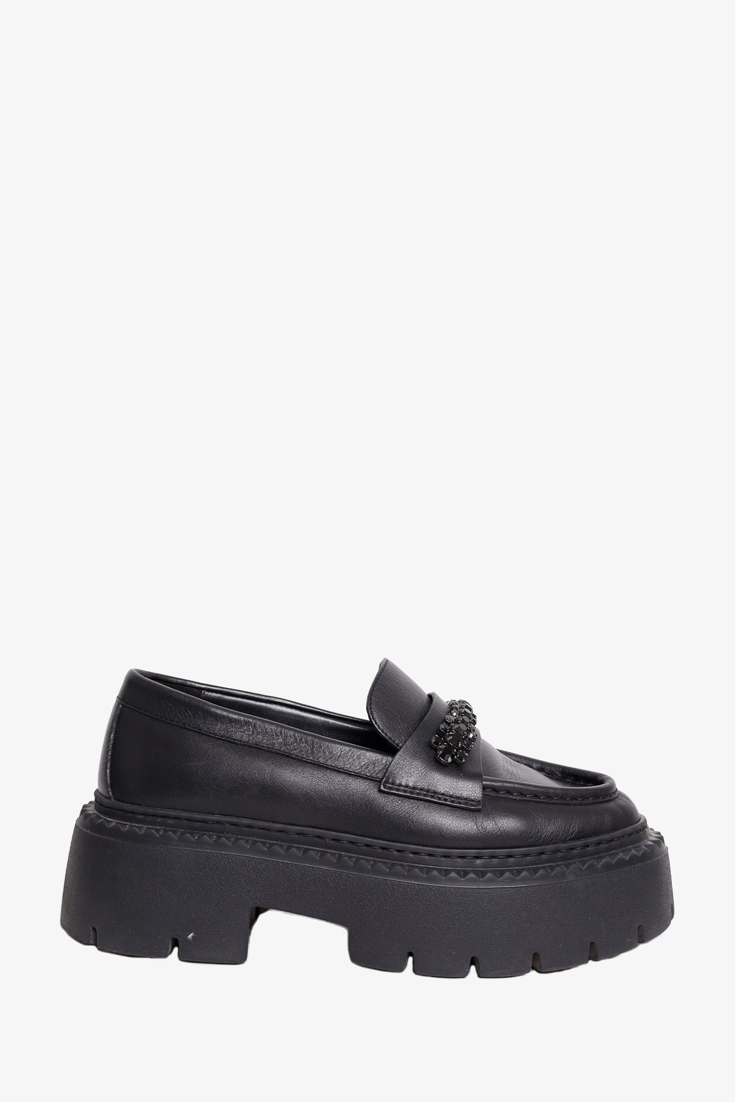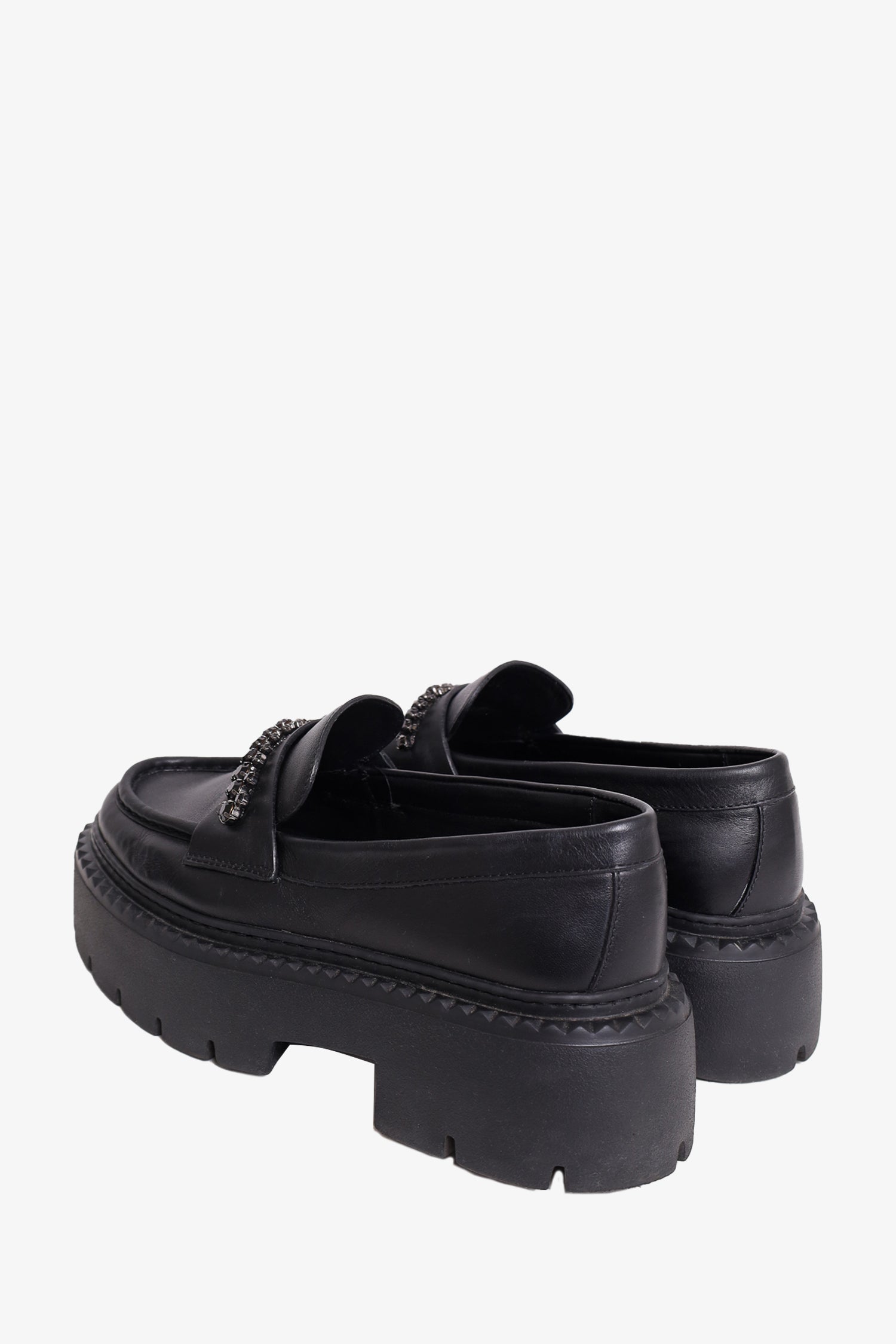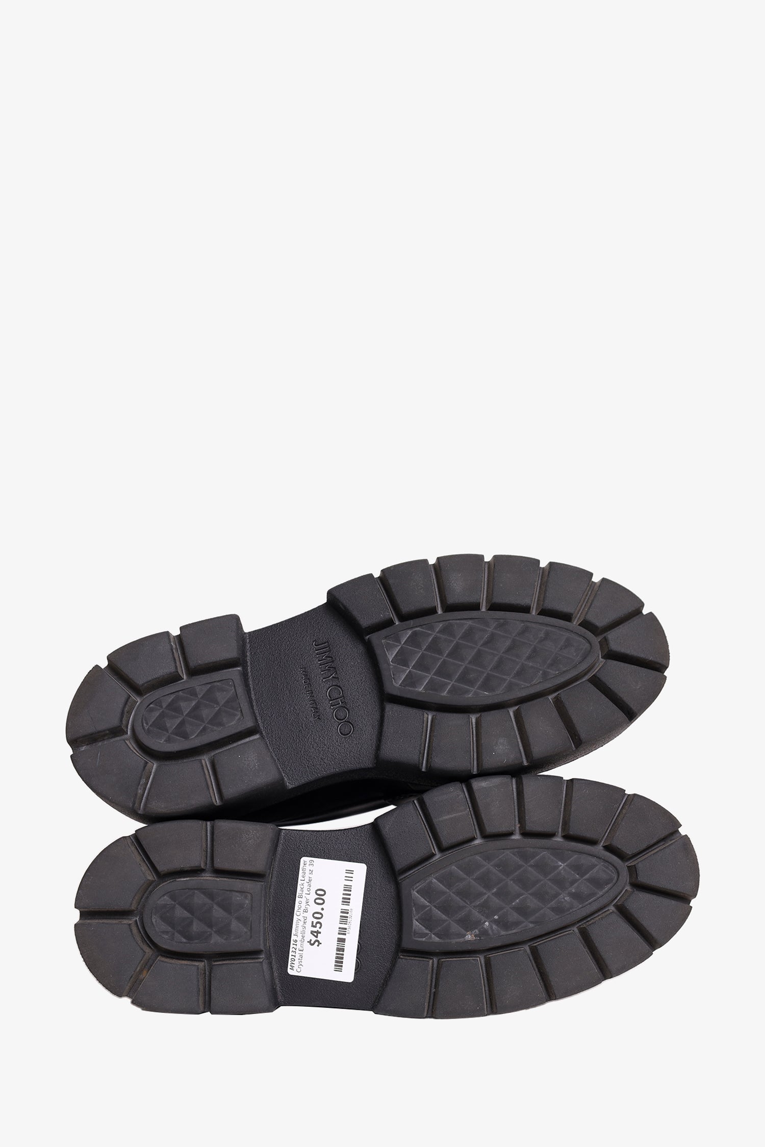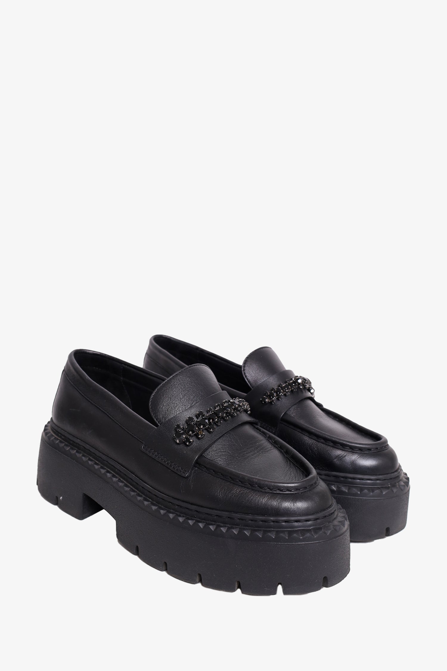 Refresh availabilityJimmy Choo Black Leather Crystal Embellished 'Bryer' Loafers. Rounded Toe. Slip-on. Tonal Stitching. Platform.