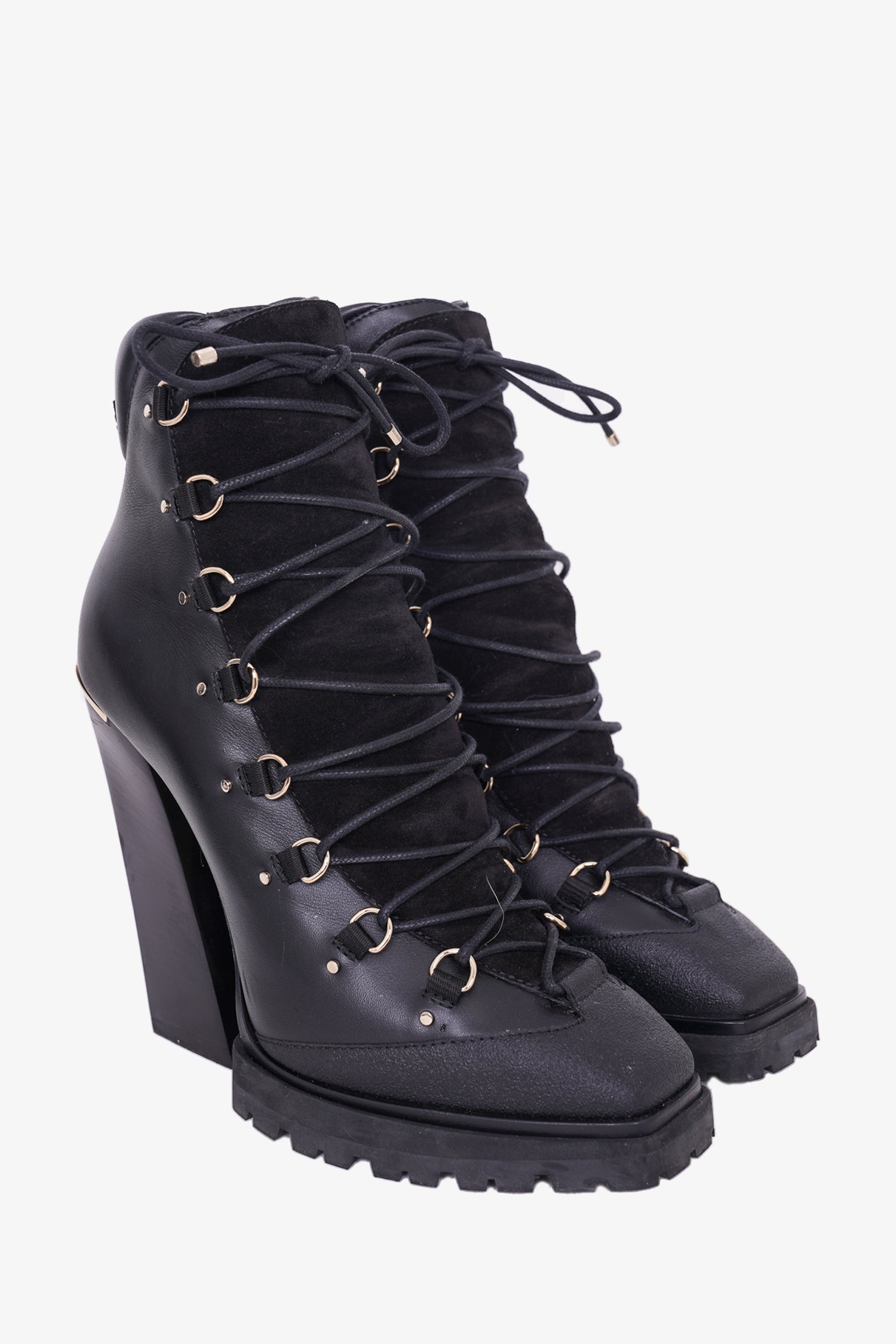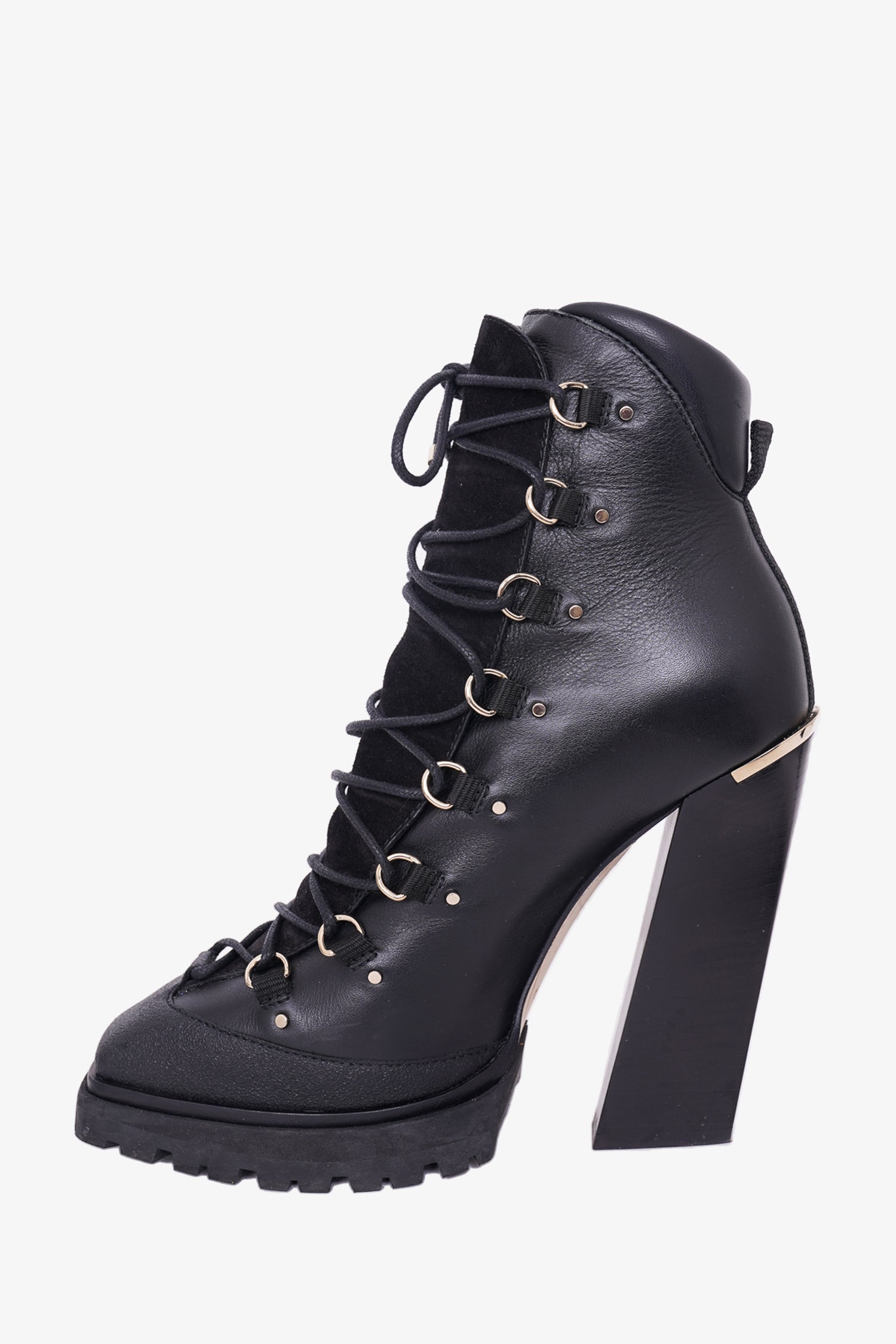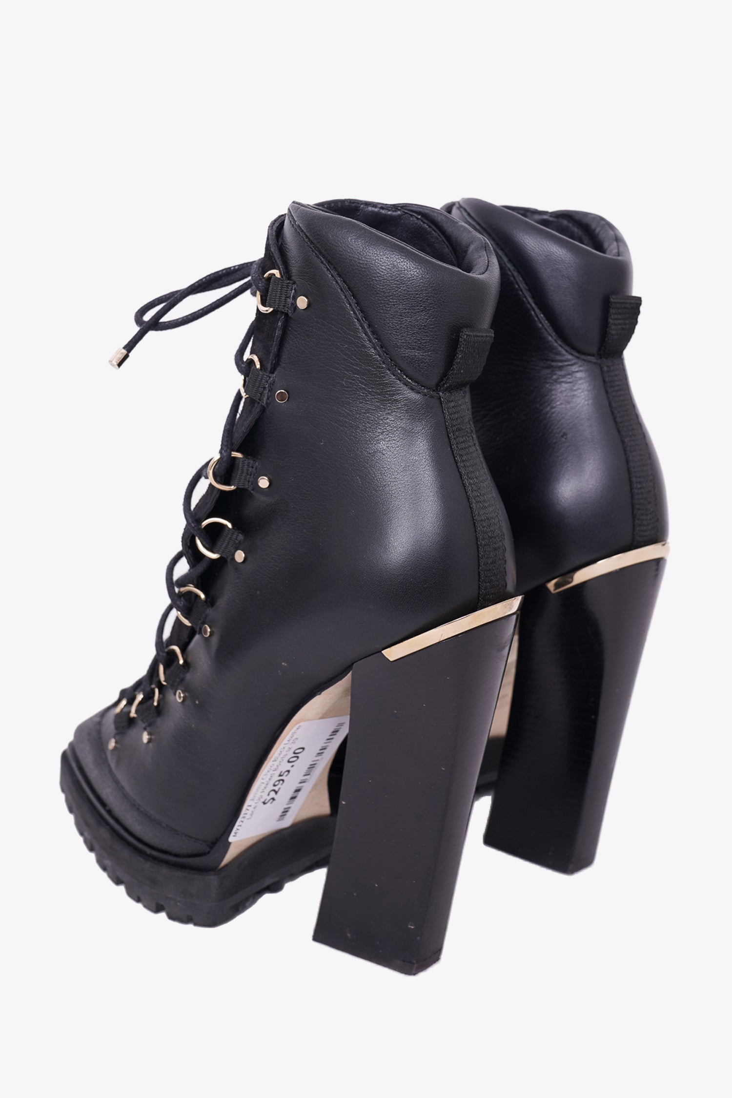 Jimmy Choo Black Leather Lace-Up Heeled Boots. Lace up closure. Square-toe. Gold-tone hardware. Tonal stitching.