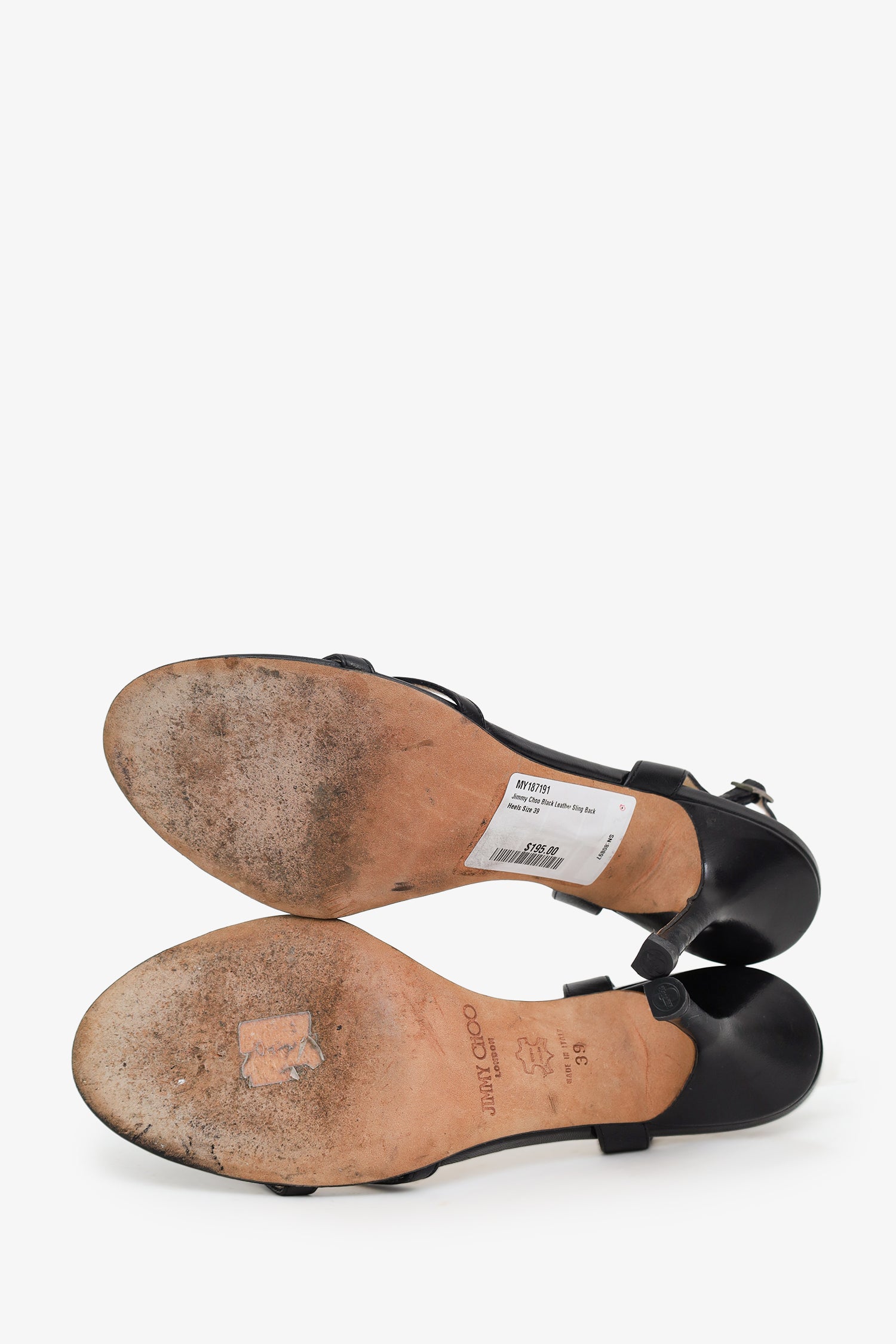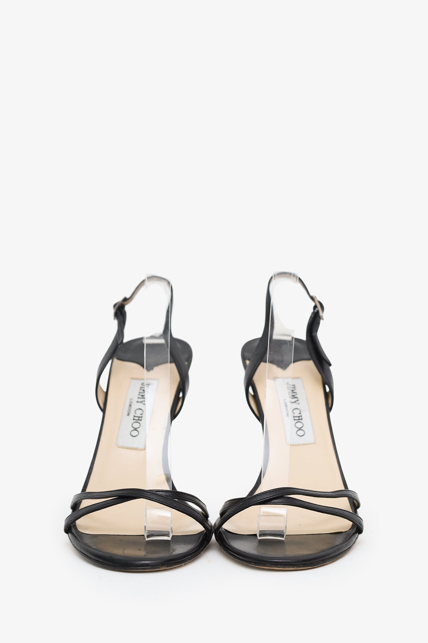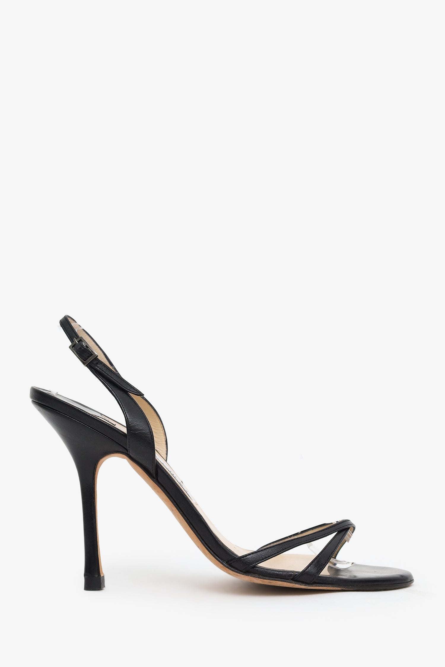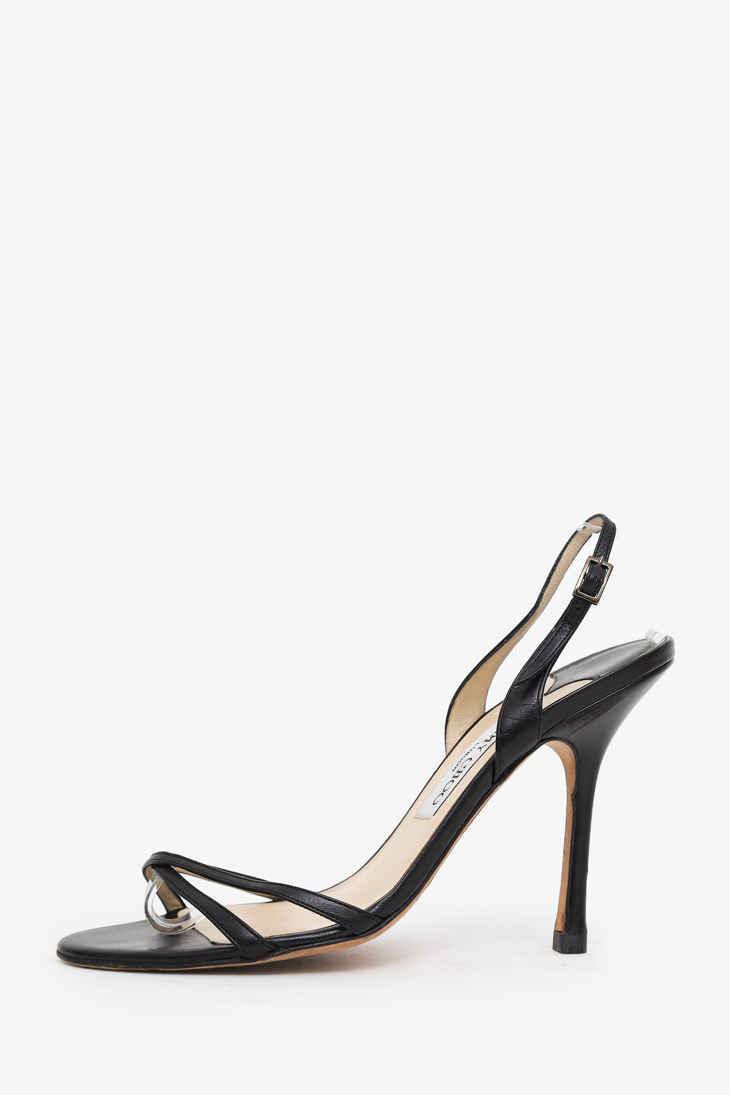 Refresh availabilityJimmy Choo Black Leather Sling Back Heels. Round open toe. Adjustable ankle strap with push-pin buckle closure. Tonal stitching.