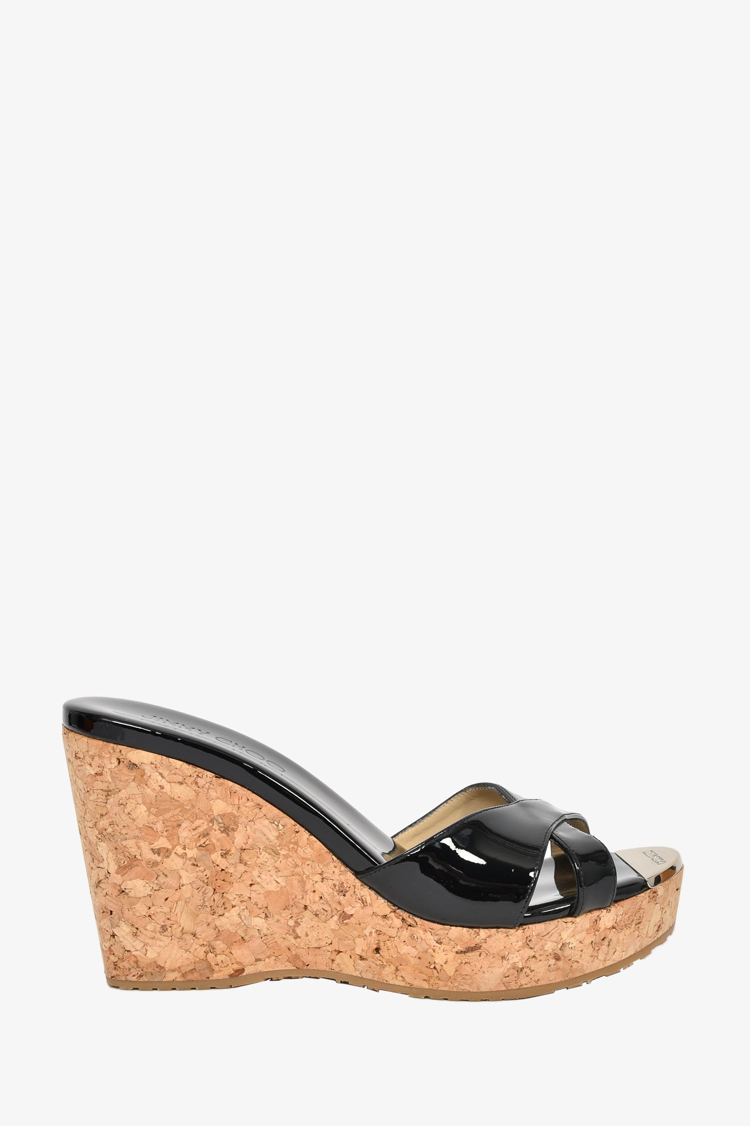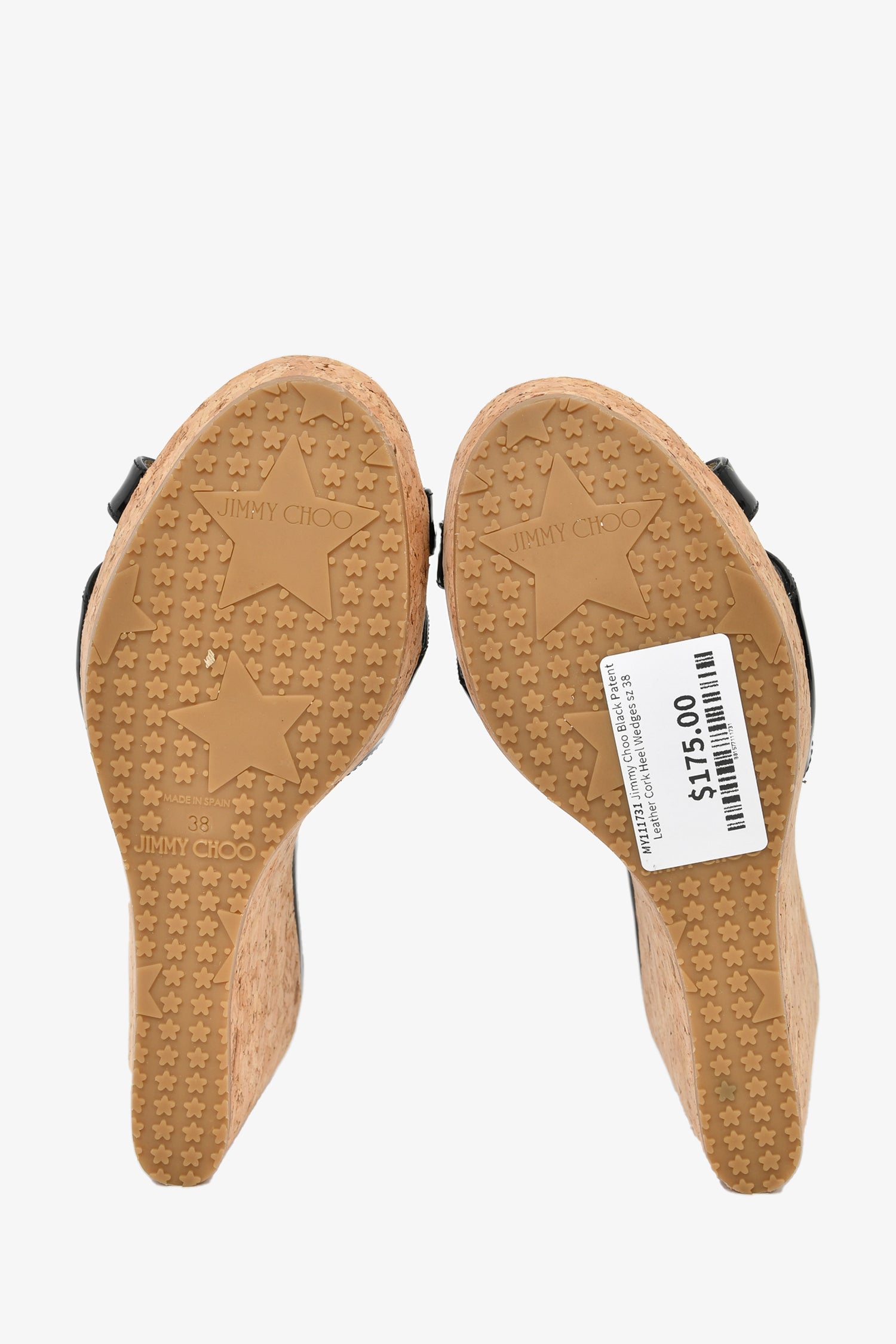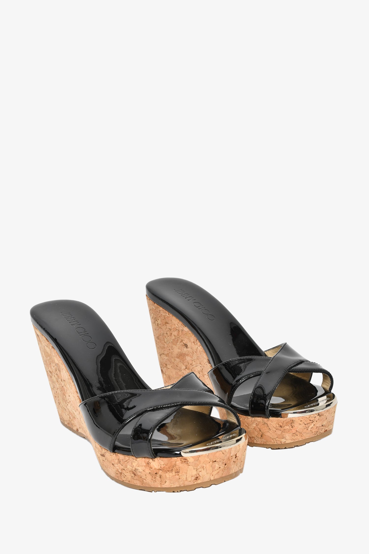 Refresh availabilityJimmy Choo Black Patent Leather Cork Heel Wedges. Slip-on. Open toe. Tonal stitching.