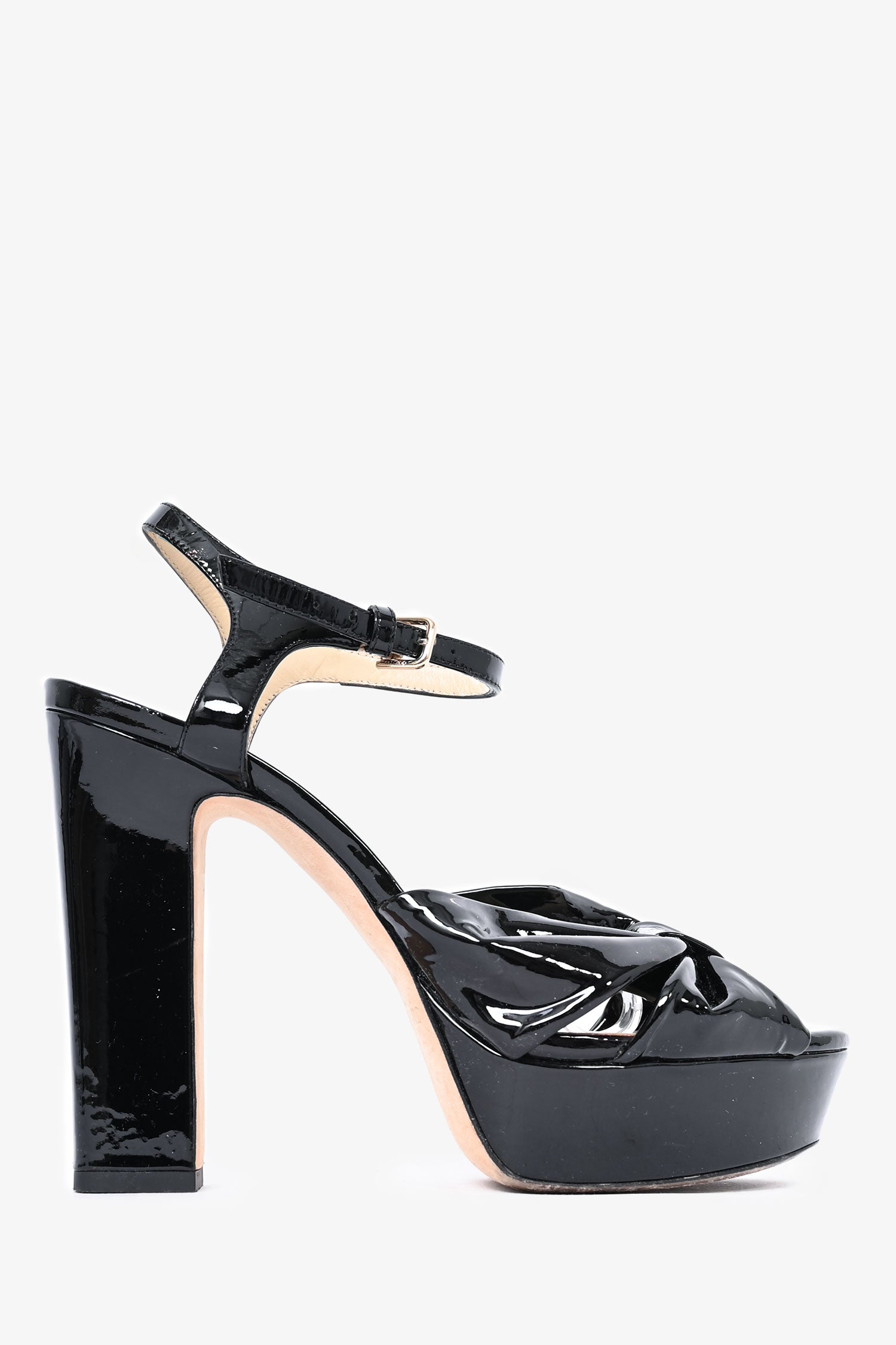 Refresh availabilityJimmy Choo Black Patent Platform Bow Heeled Sandals. Slip-on. Open toe. Ankle strap with buckle closure. Glossy finish.