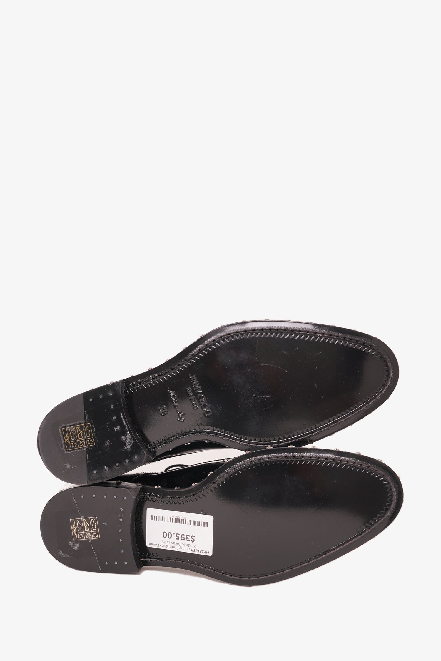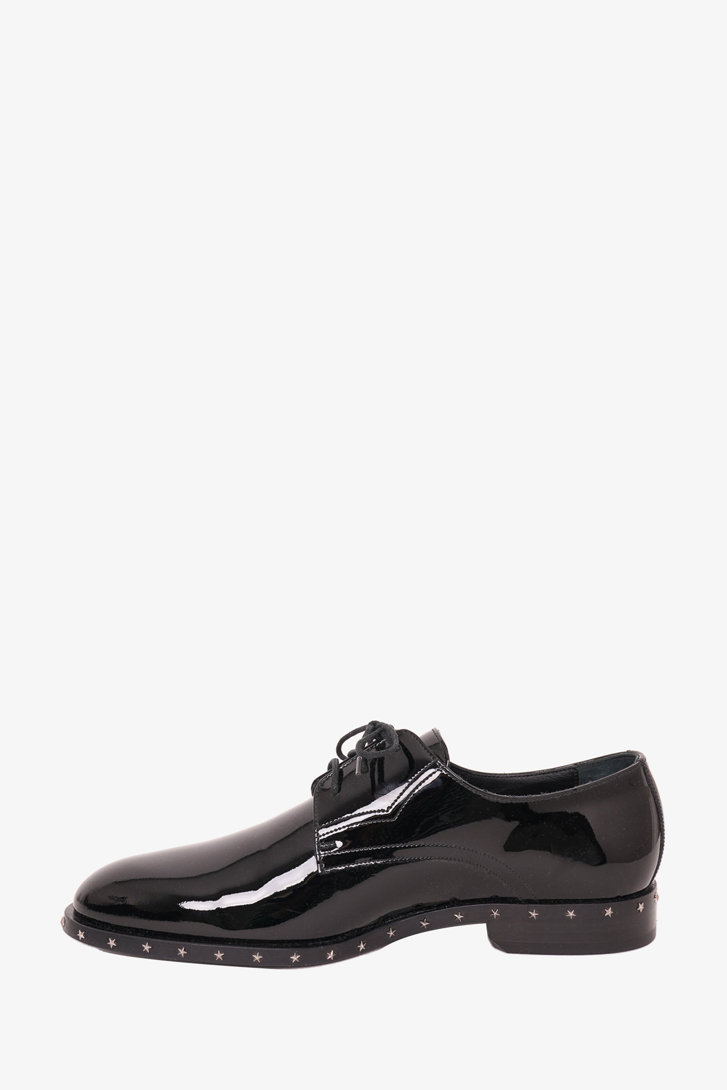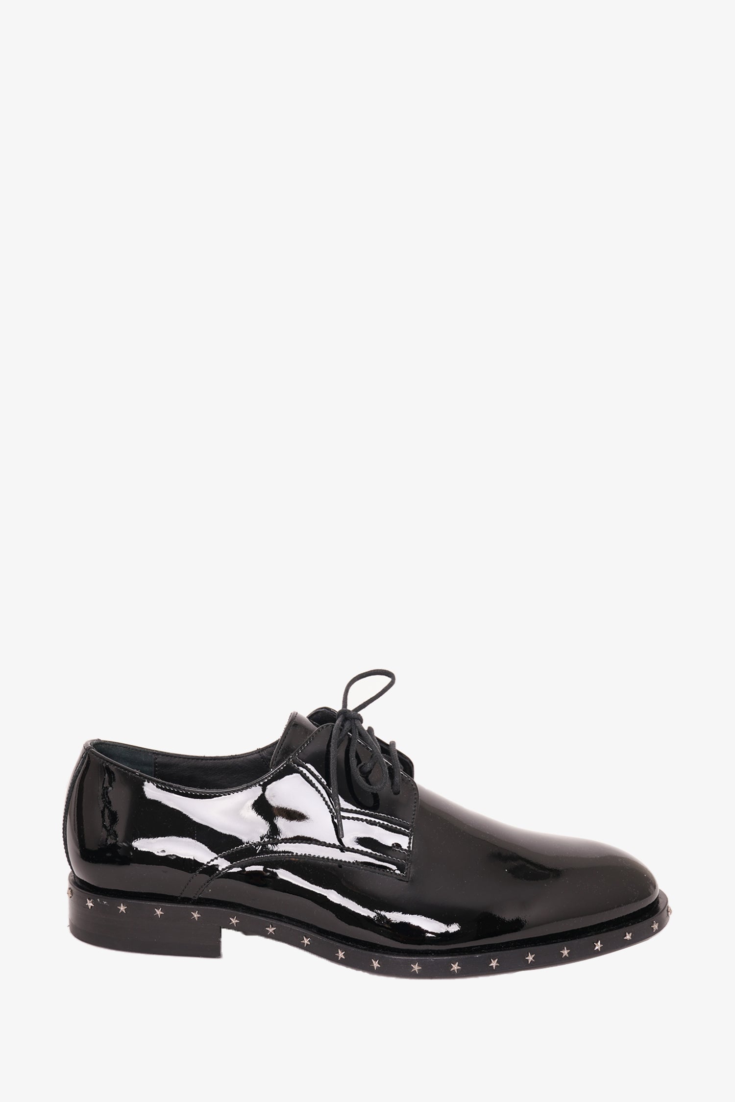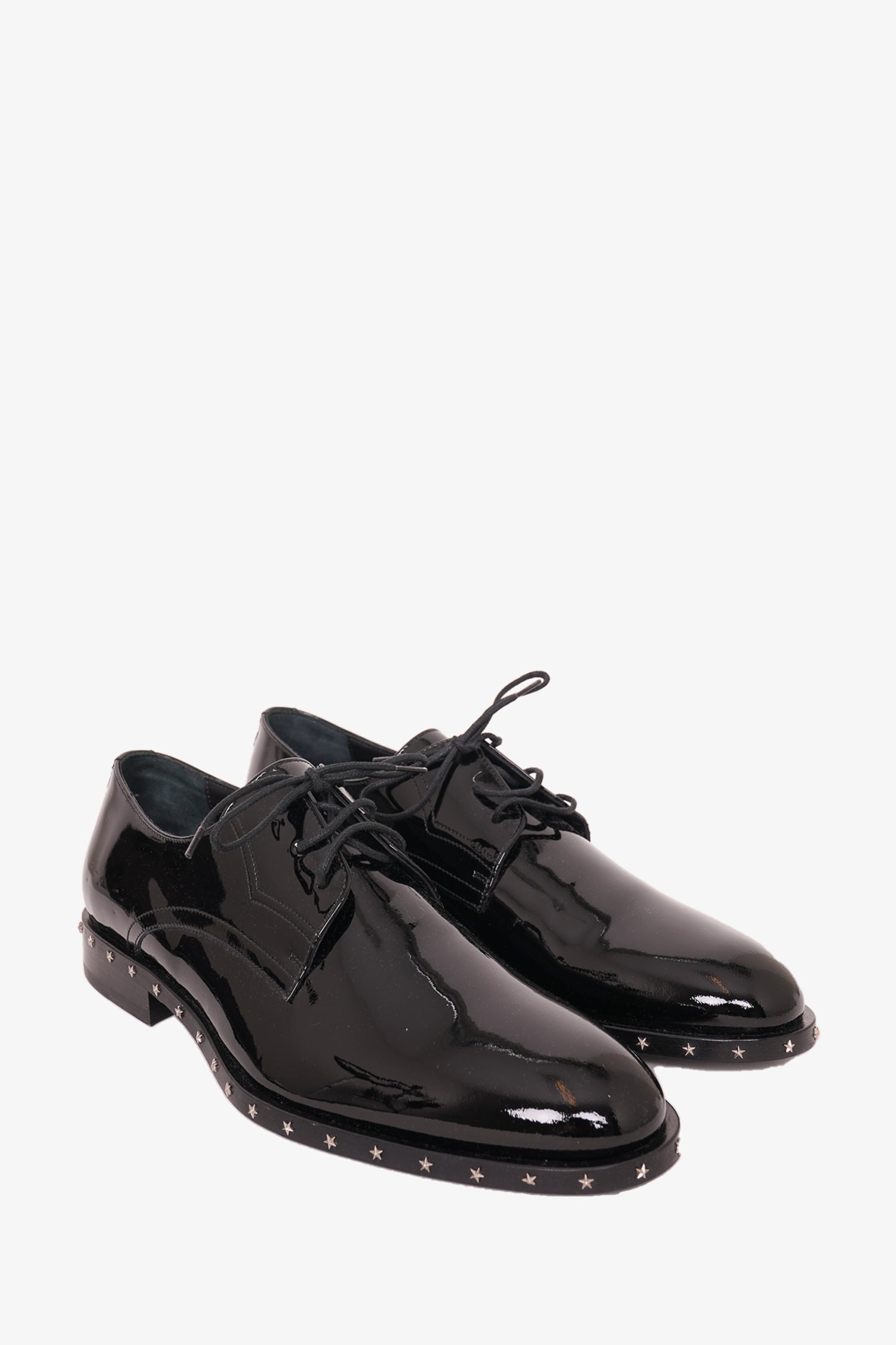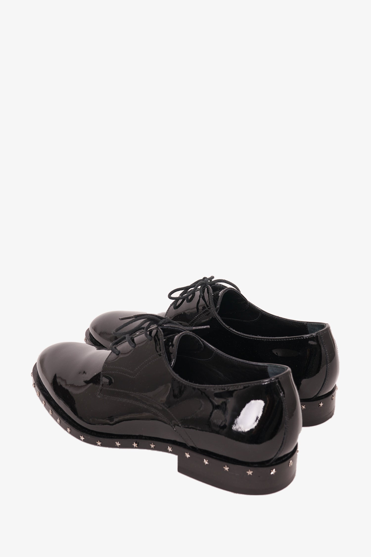 Refresh availabilityJimmy Choo Black Patent Studded Derby. Round toe. Lace-up front closure. Tonal stitching.