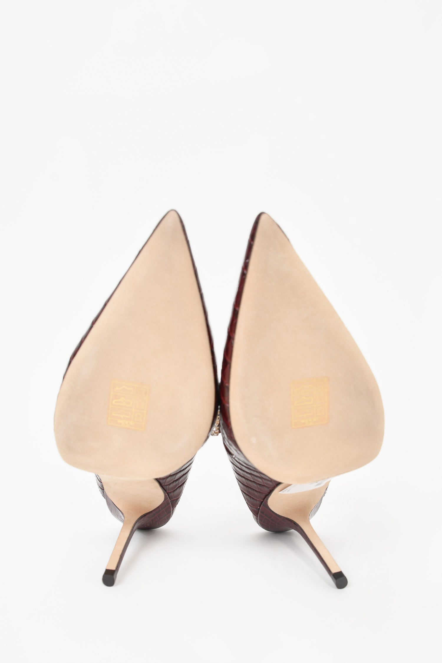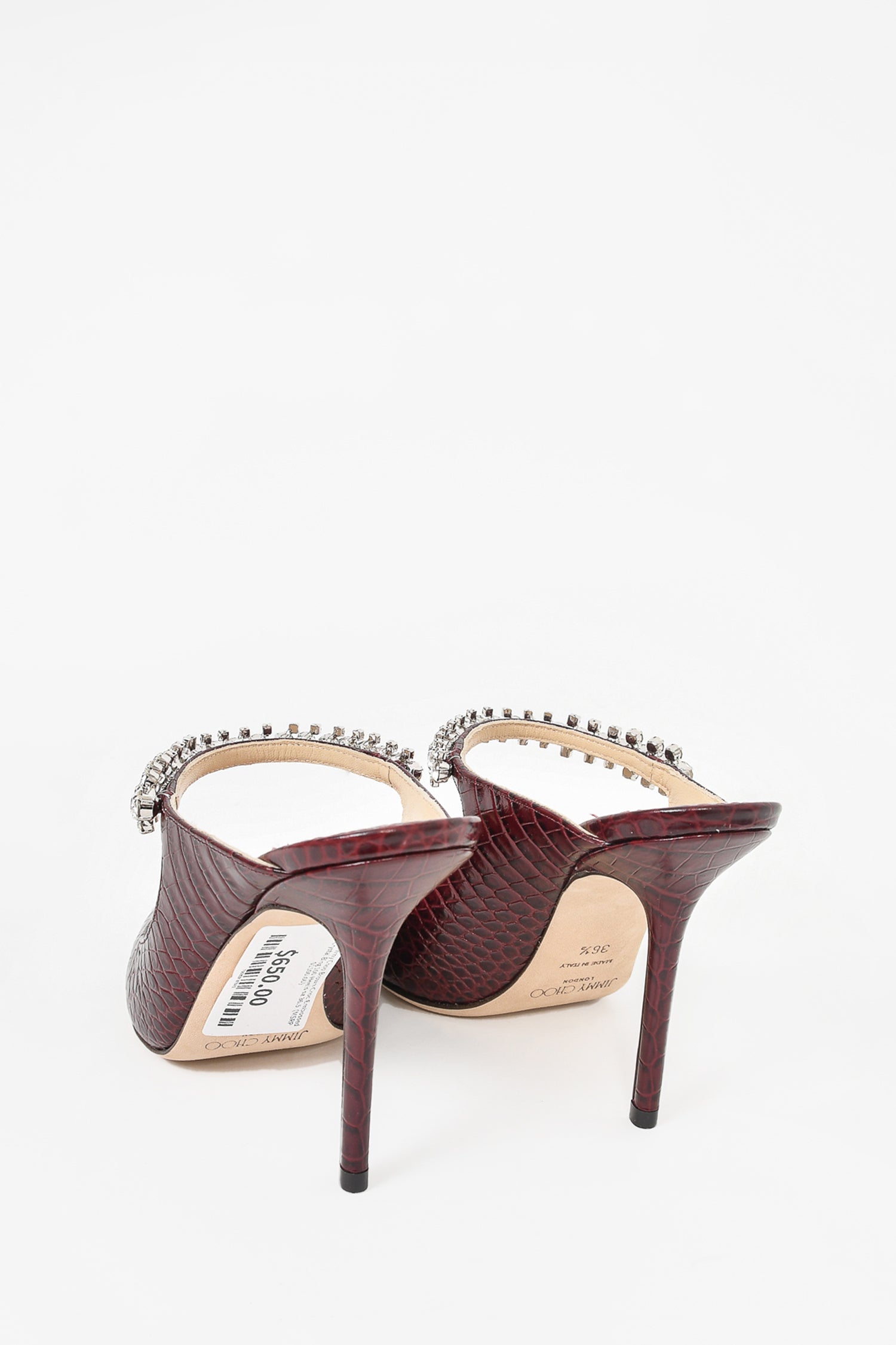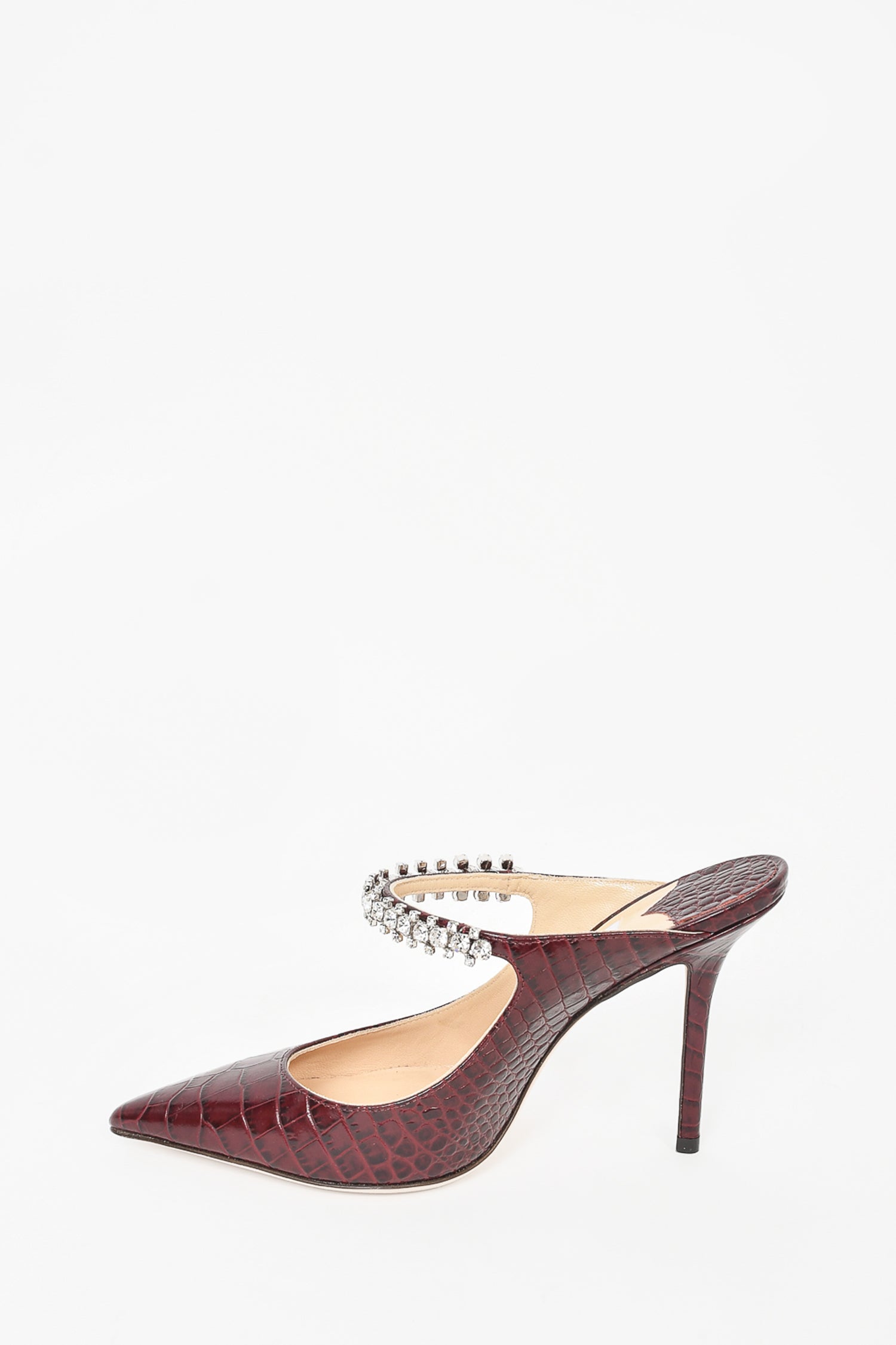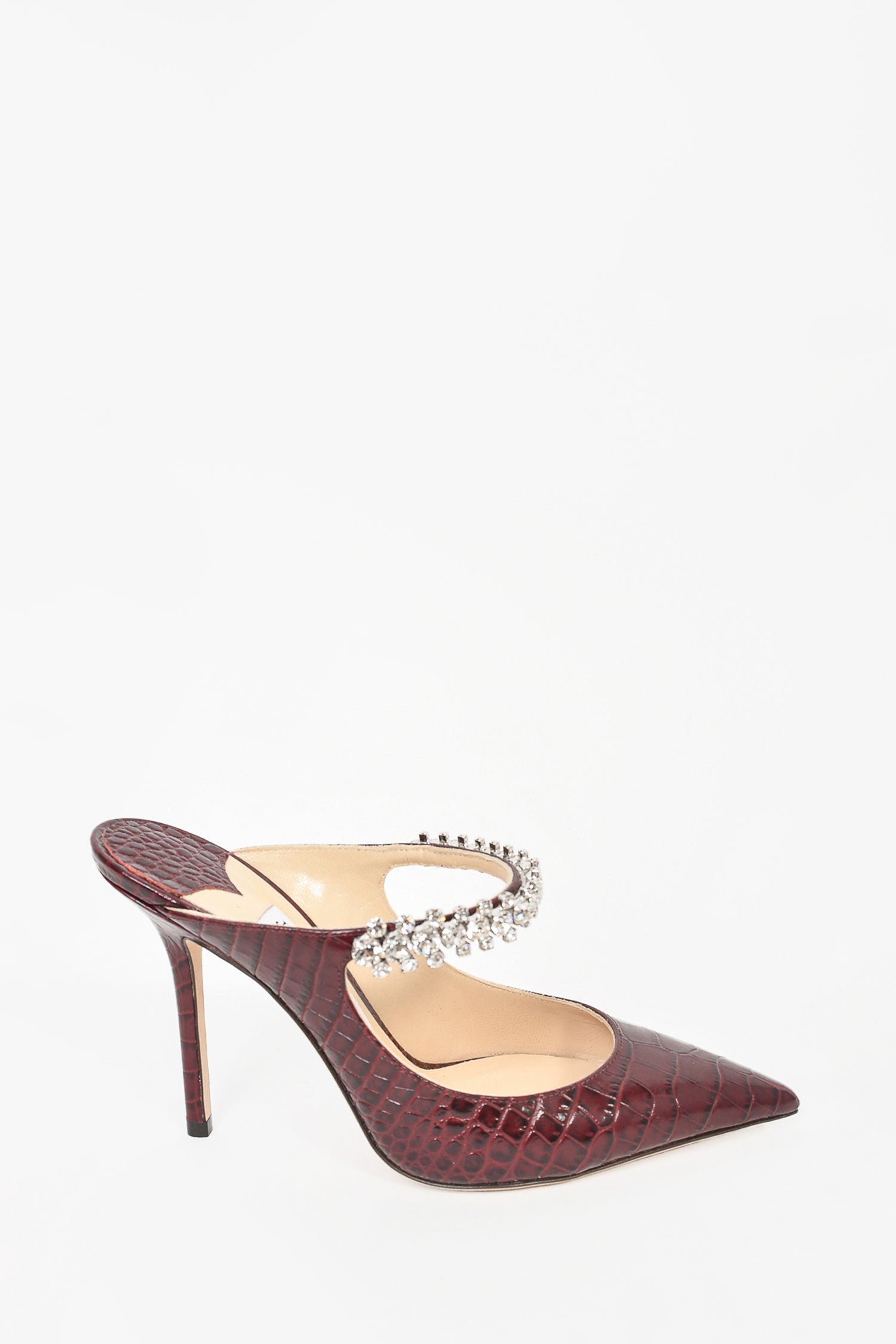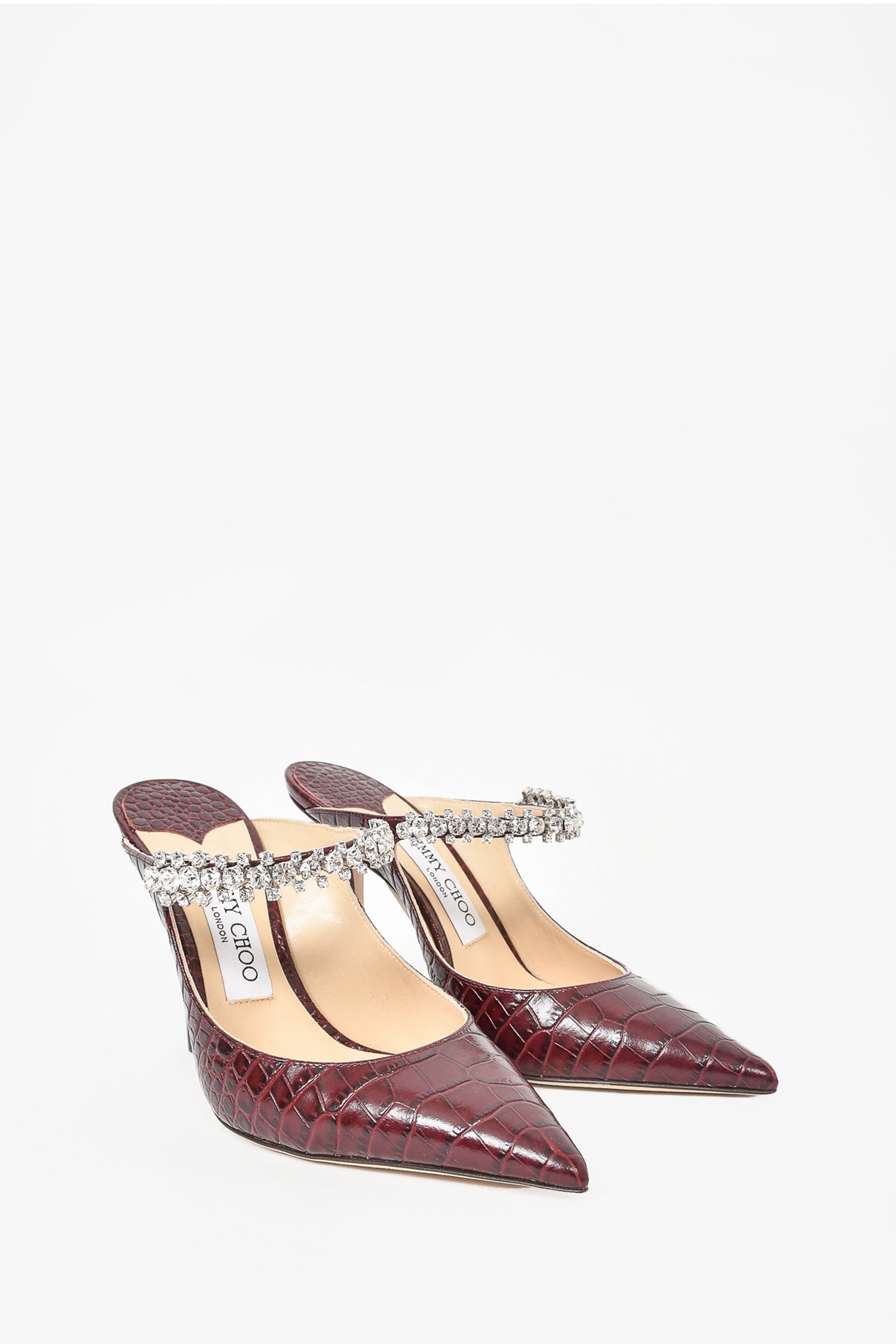 Refresh availabilityJimmy Choo Brown Croc Embossed Leather Crystal Bing 100 Heels. Slip on. Pointed toe. Top strap with crystal details. Skinny heel. Tonal stitching.