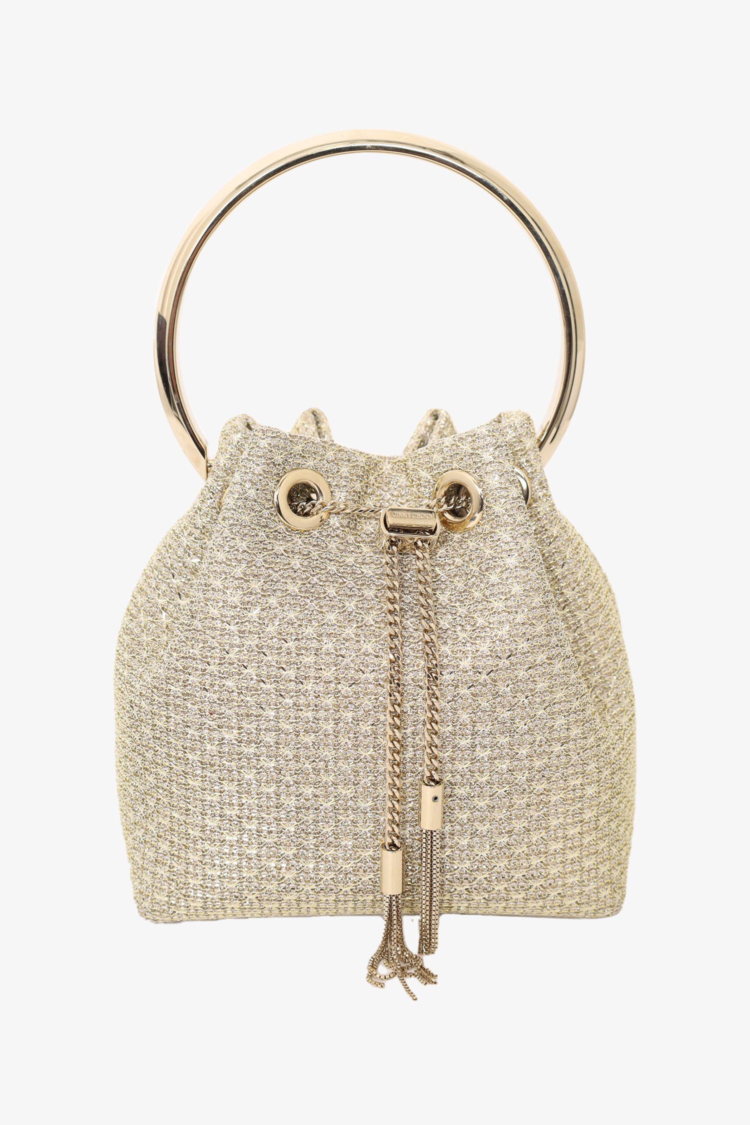 Refresh availabilityJimmy Choo Gold Glitter Bon Bon Ring Handle Bucket Bag. Hardware top handle. Hardware drawstring closure with fringe detailing. Silk interior lining. Gold-toned hardware. Tonal stitching.
