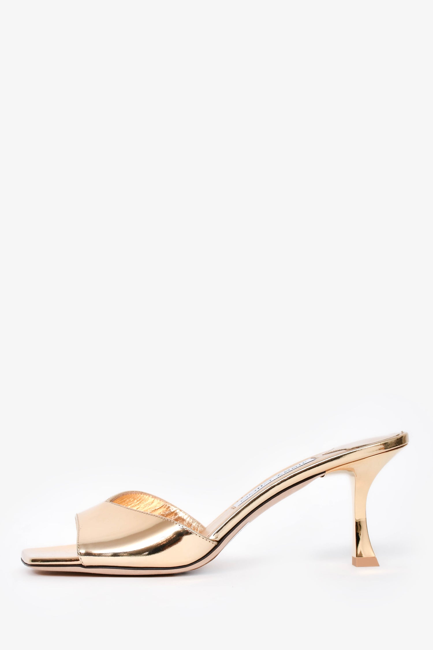 Jimmy Choo Gold Metallic Leather Skye 70 Mules. Open-square toe. Tonal stitching.