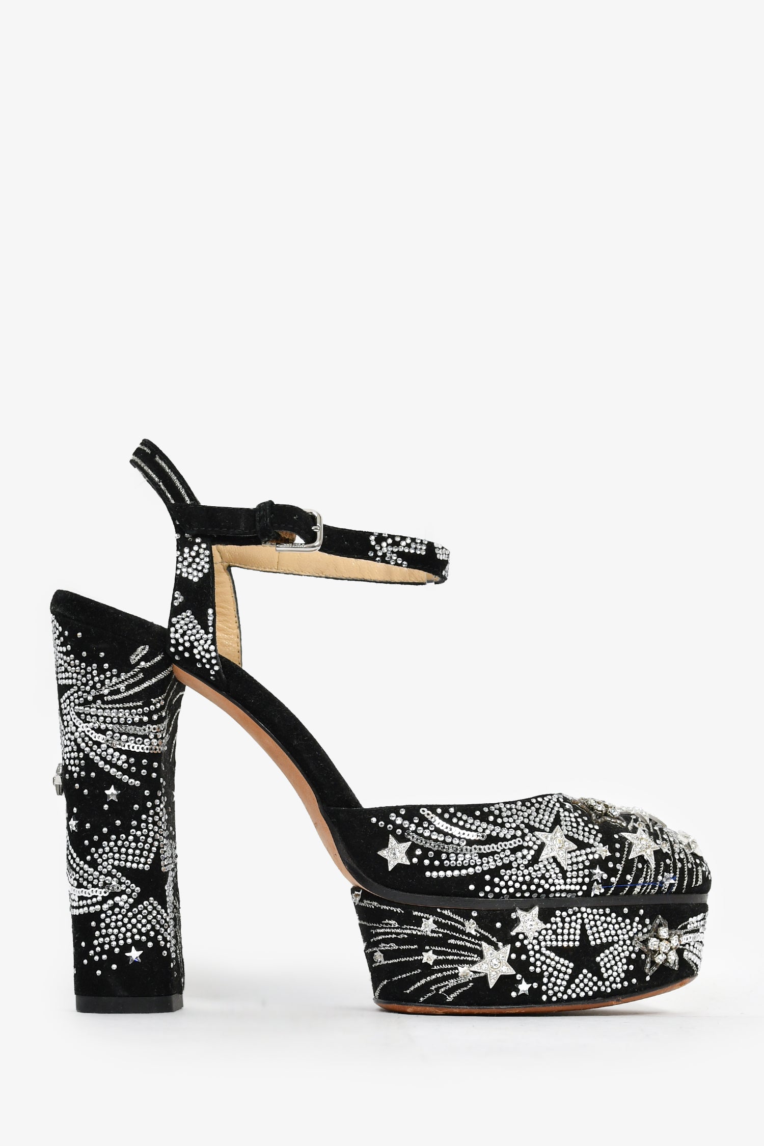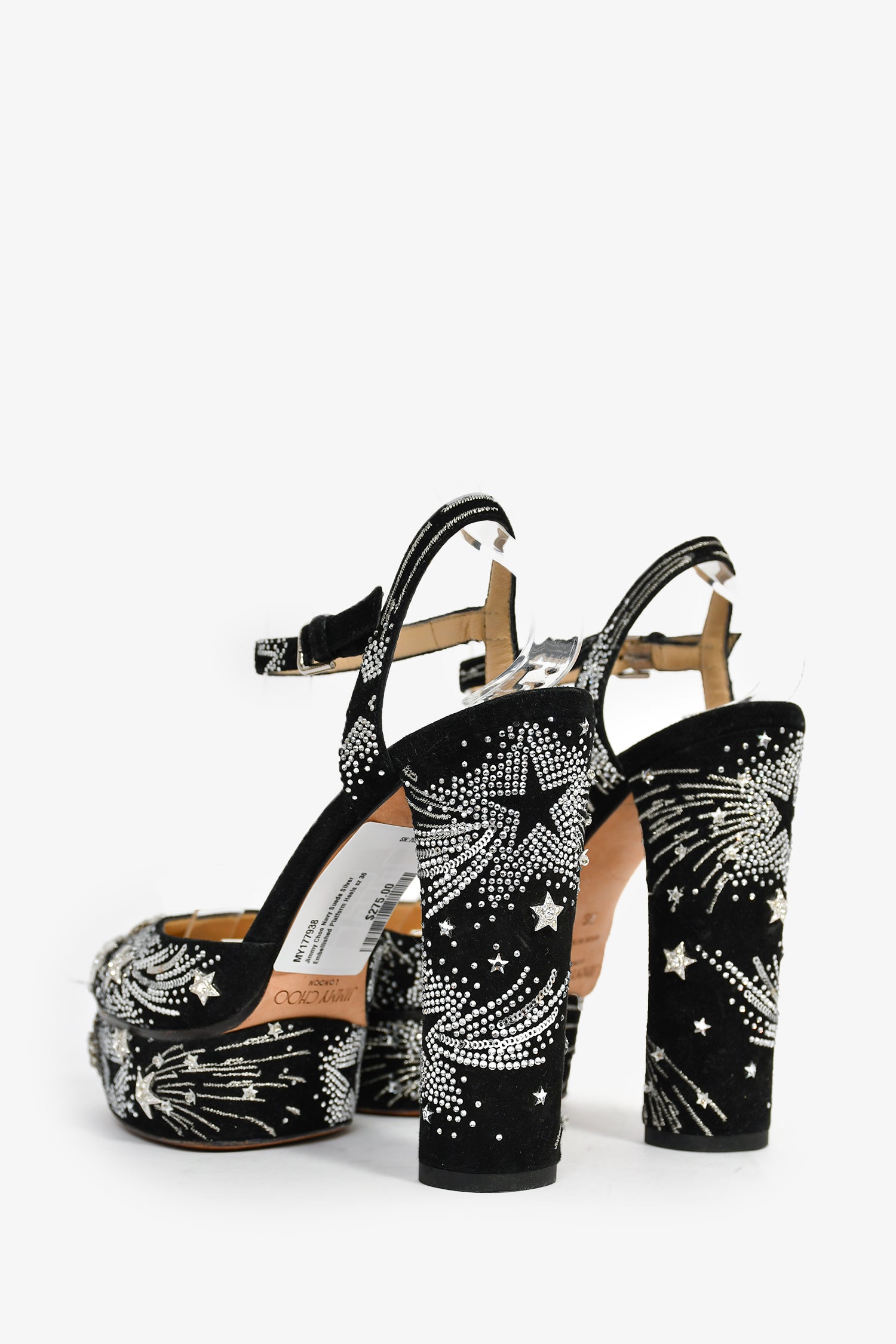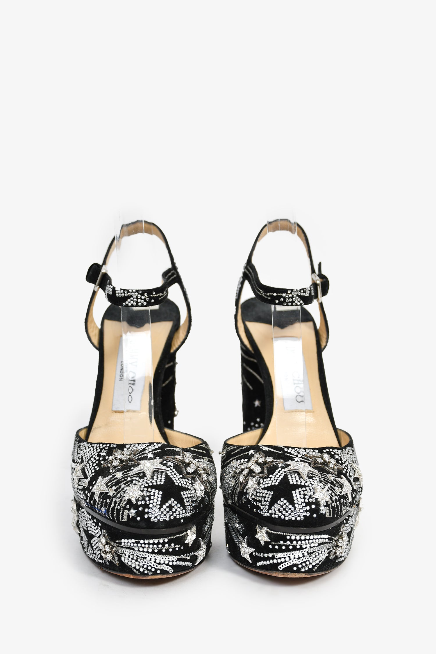 Refresh availabilityJimmy Choo Navy Suede Silver Embellished Platform Heels. Rounded pointed front. Pin buckle. Suede ankle strap. Tonal stitching.