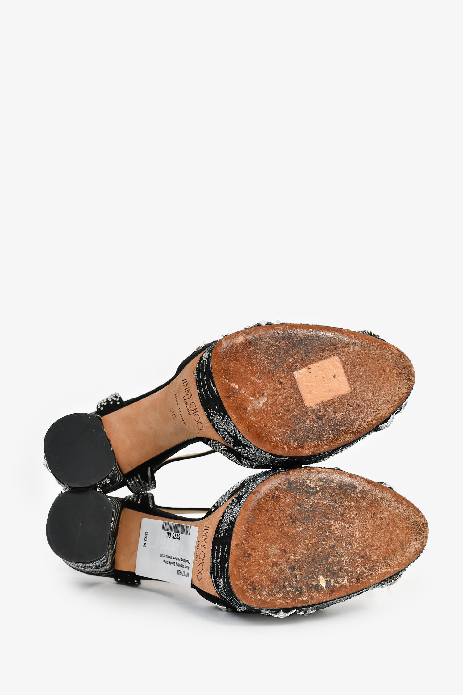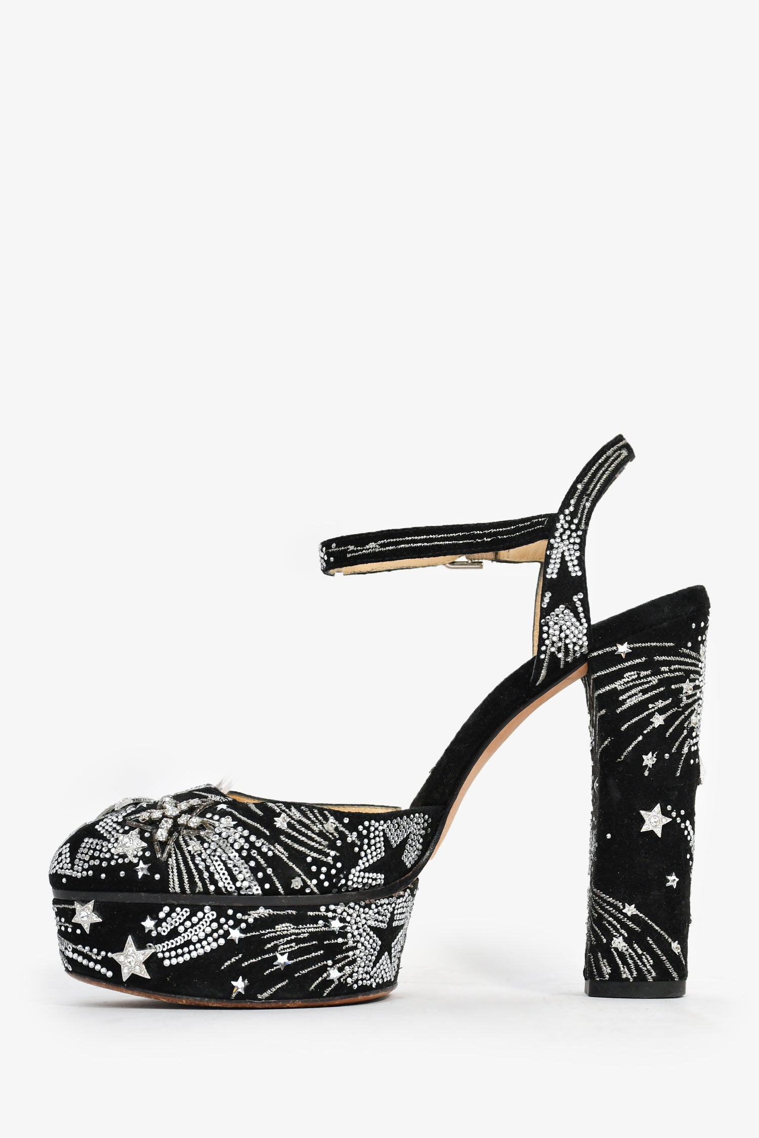 Size: 36 (US 6)Heel Height: 5"Condition: This item is in fair pre-loved condition with missing embellishments. Visible wear on the bottoms, interior, and straps.