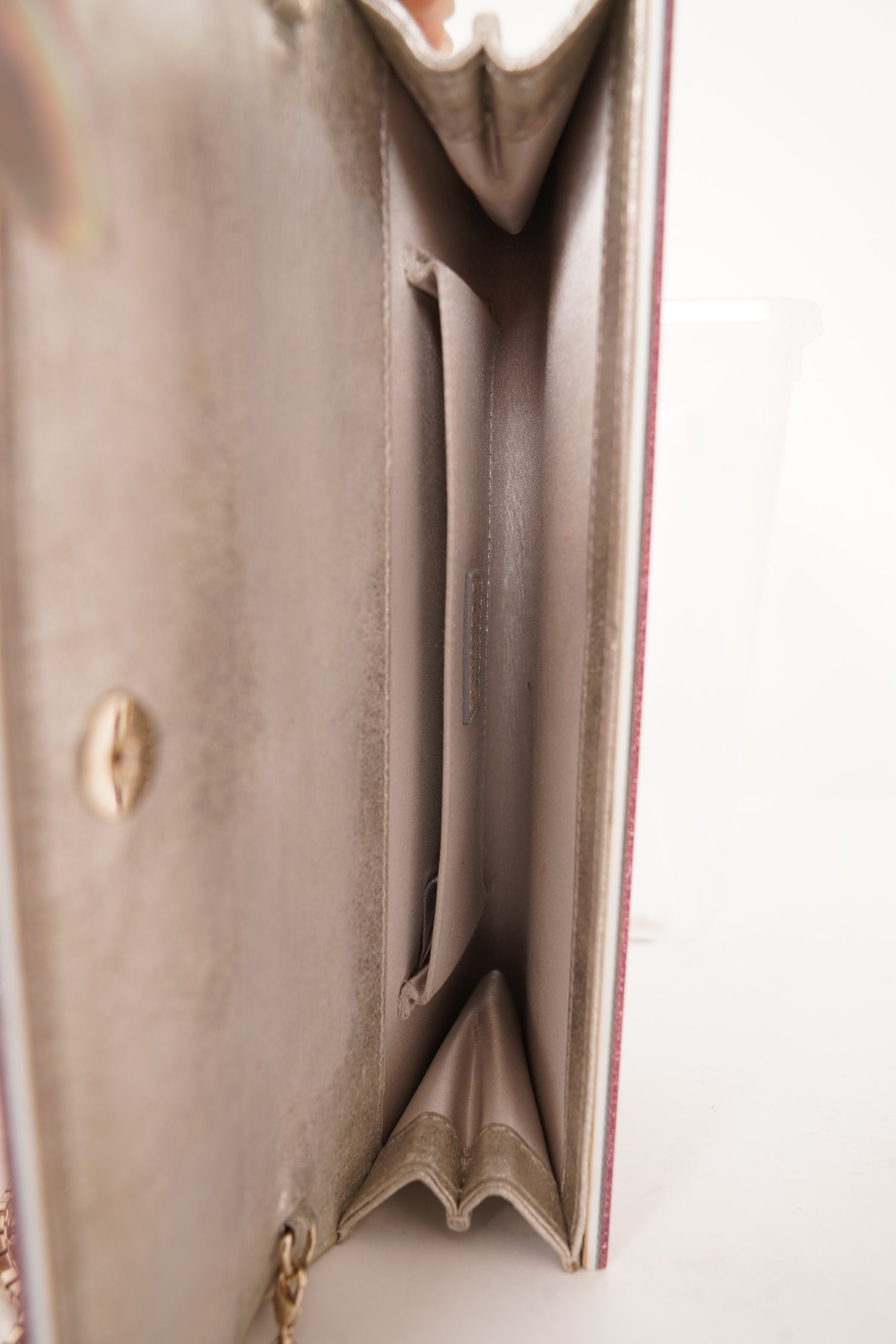 Jimmy Choo Silver/Pink 'Sweetie' Glitter Acrylic Clutch with Chain. Front fold-over flap with magnetic closure. 1 interior slip pocket. Removable chain strap. Tonal stitching.