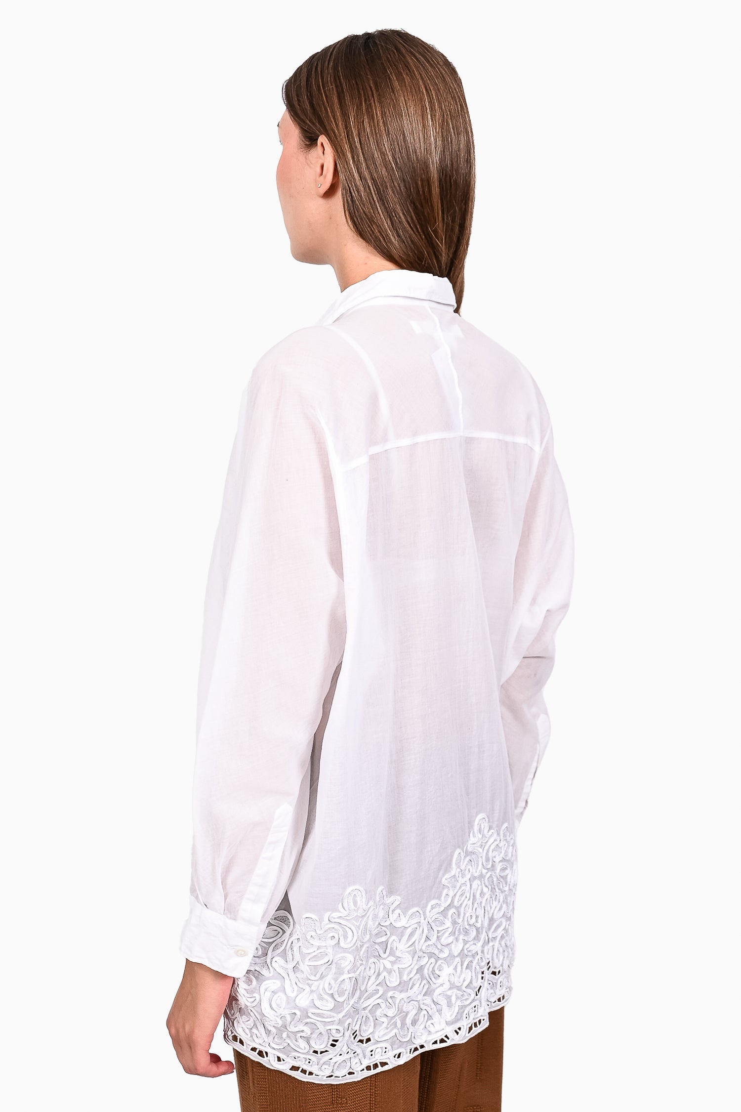 Refresh availabilityJunya Watanabe White Cotton Poplin Embroidered Button Down Shirt. Sheer. Button closure on the cuffs. Tonal stitching.