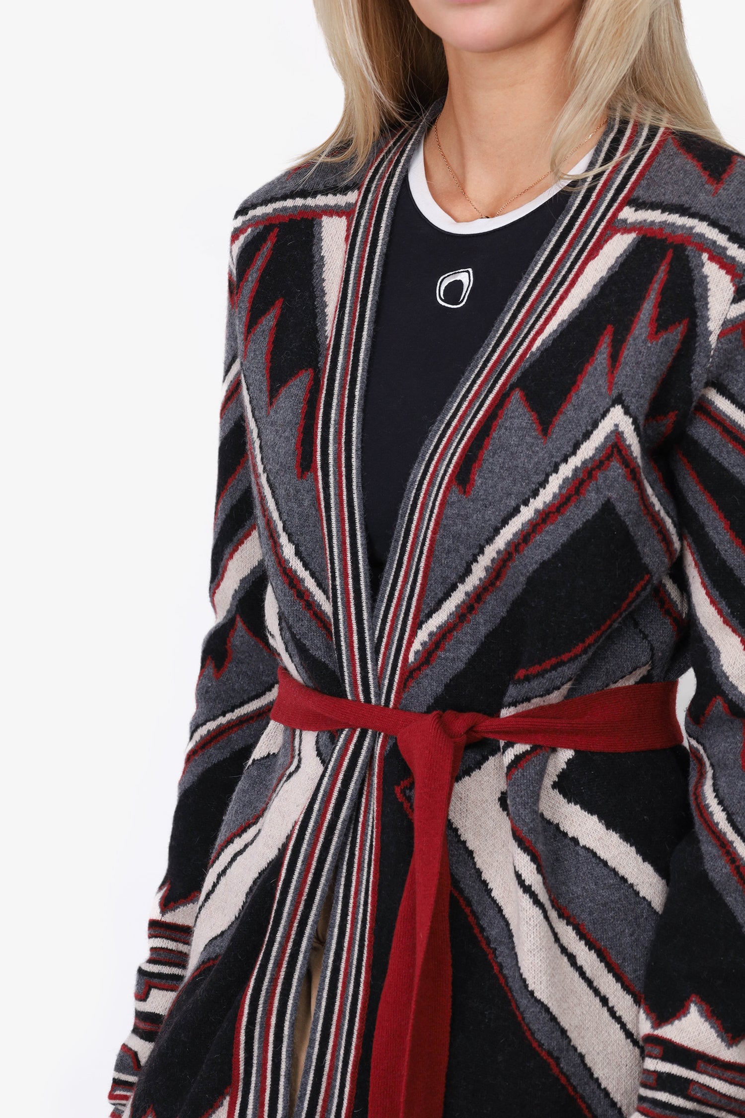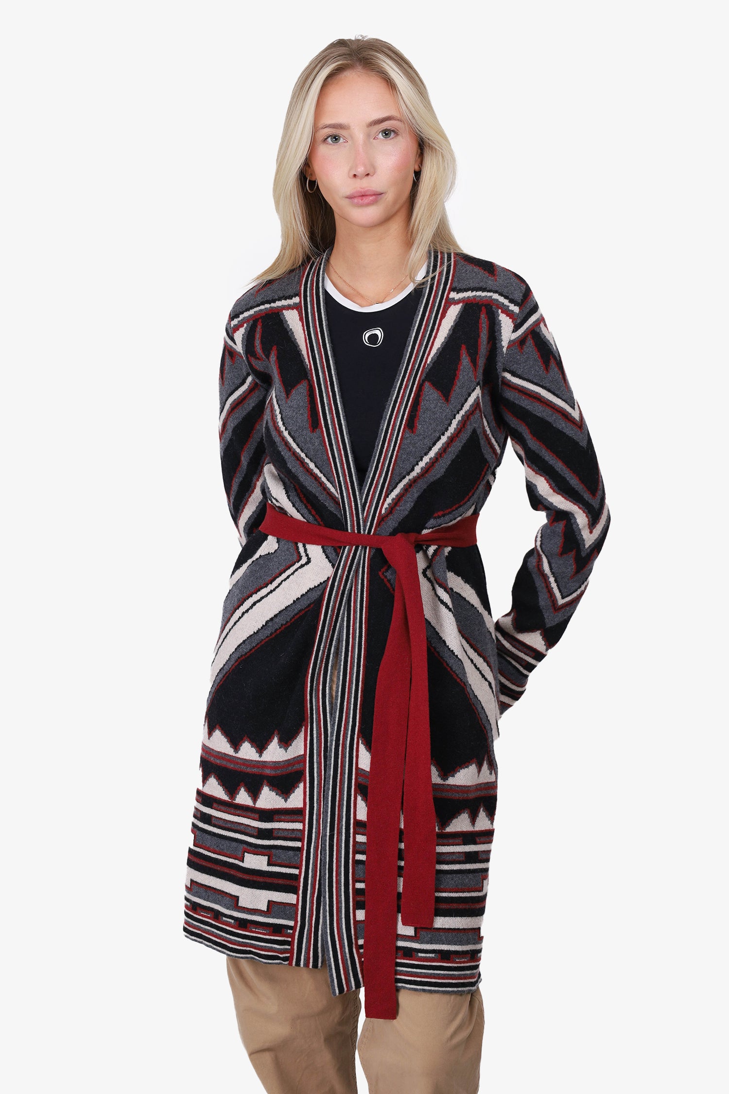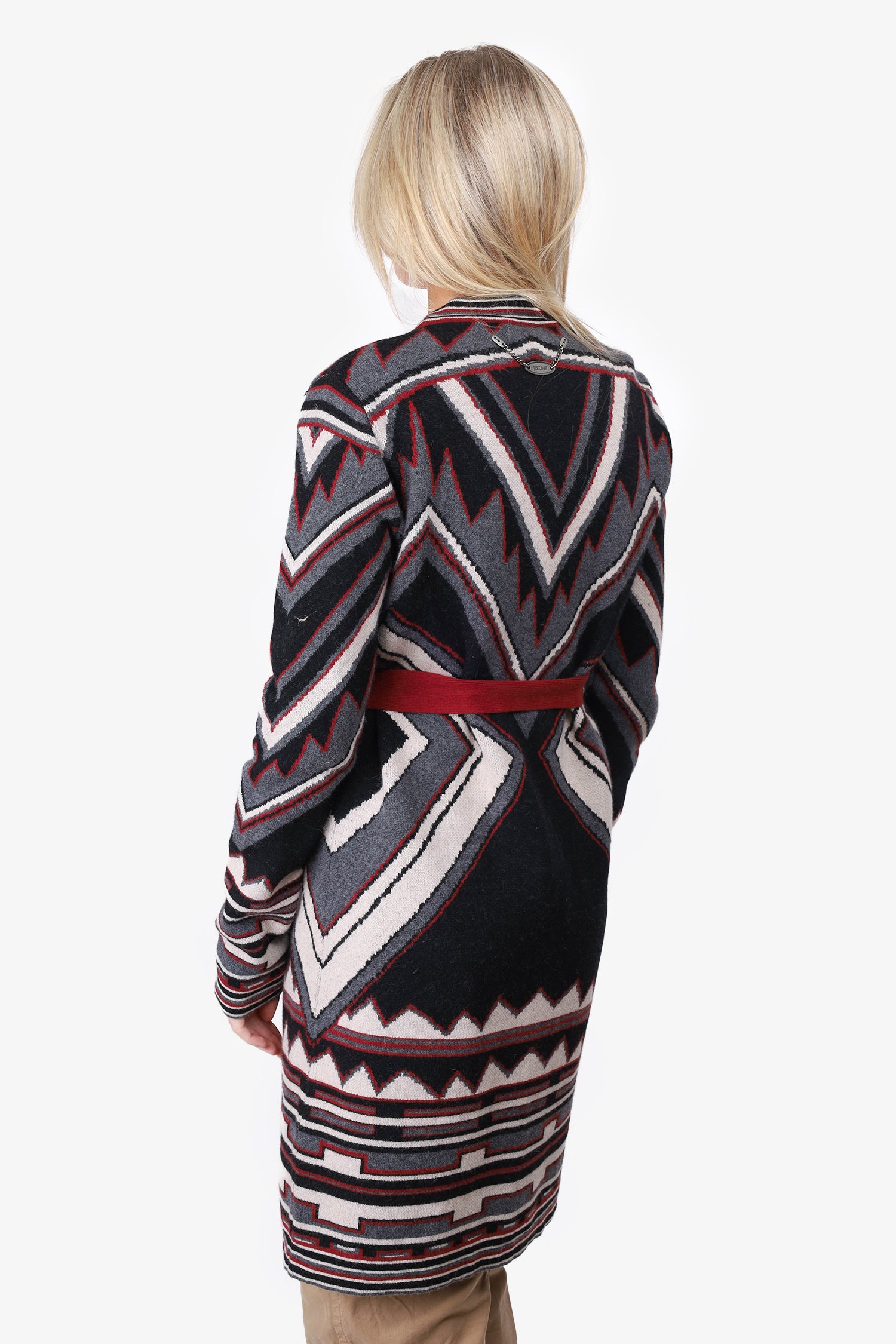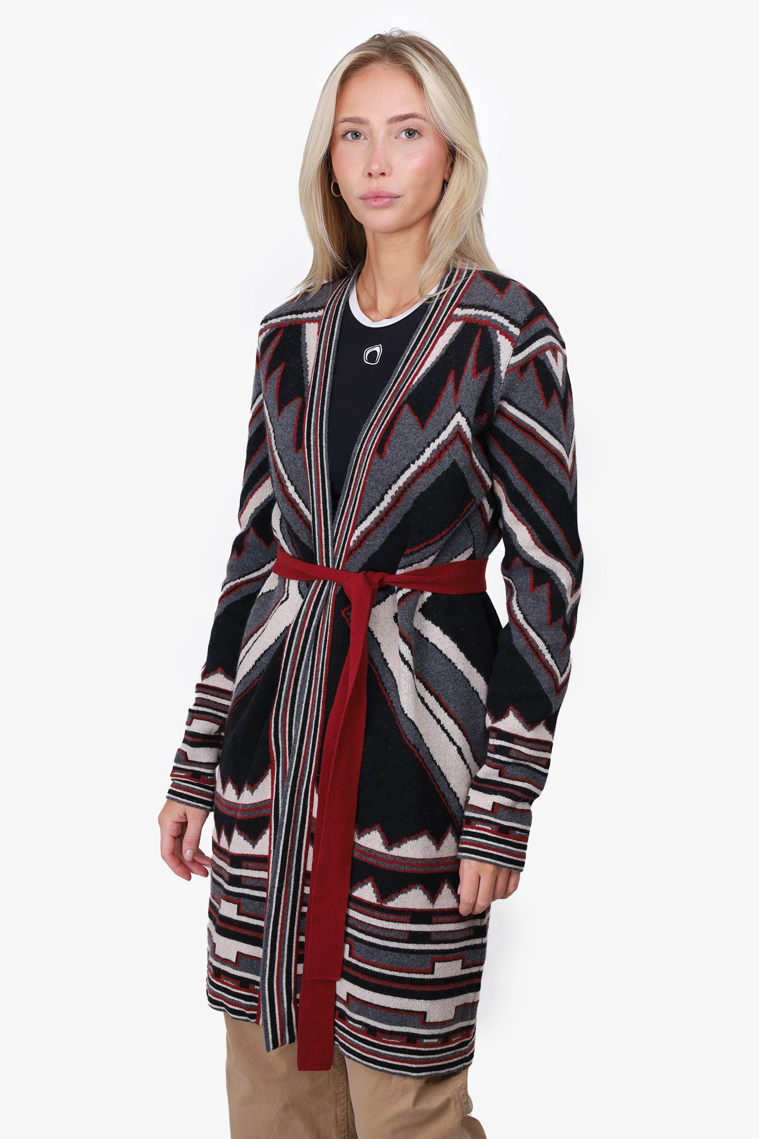 Refresh availabilityJust Cavalli Black/White/Red Wool Pattern Cardigan with Belt. Rear logo embellishment. Silver-tone hardware. Unlined. Tonal stitching.