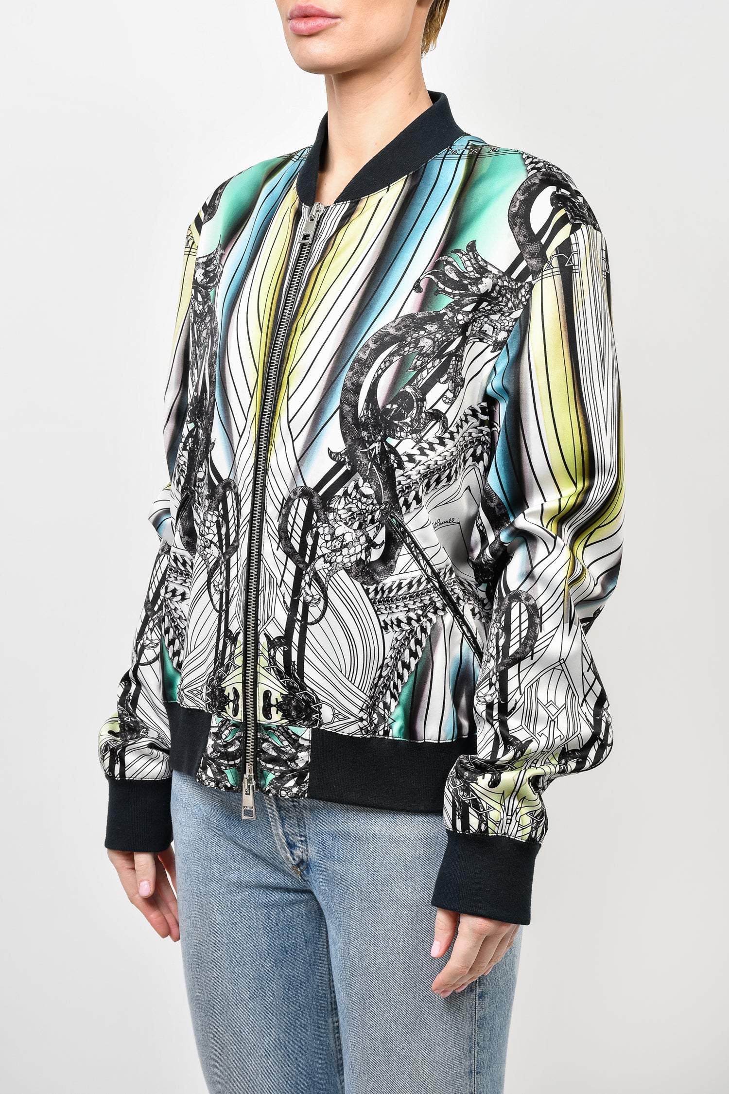 Refresh availabilityJust Cavalli Mens White/Multicolour Pattern Bomber Jacket. Full front zip closure. Ribbed trims. 2 hand pockets with button closures. Silver-tone hardware. Tonal stitching.