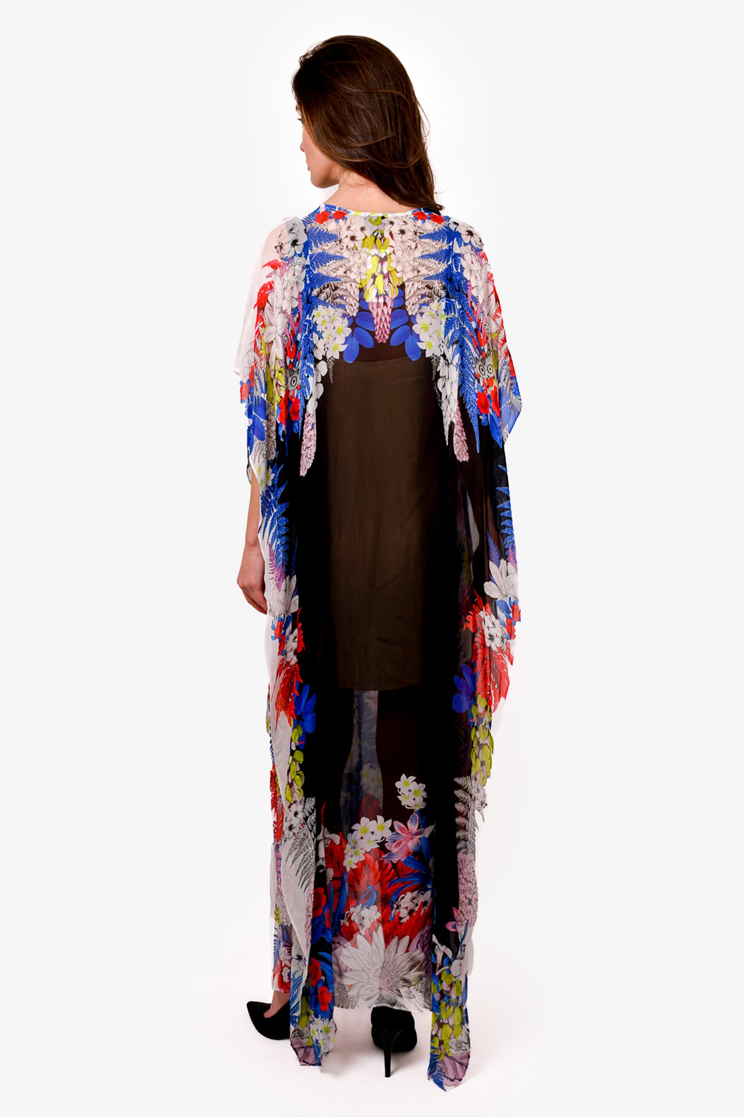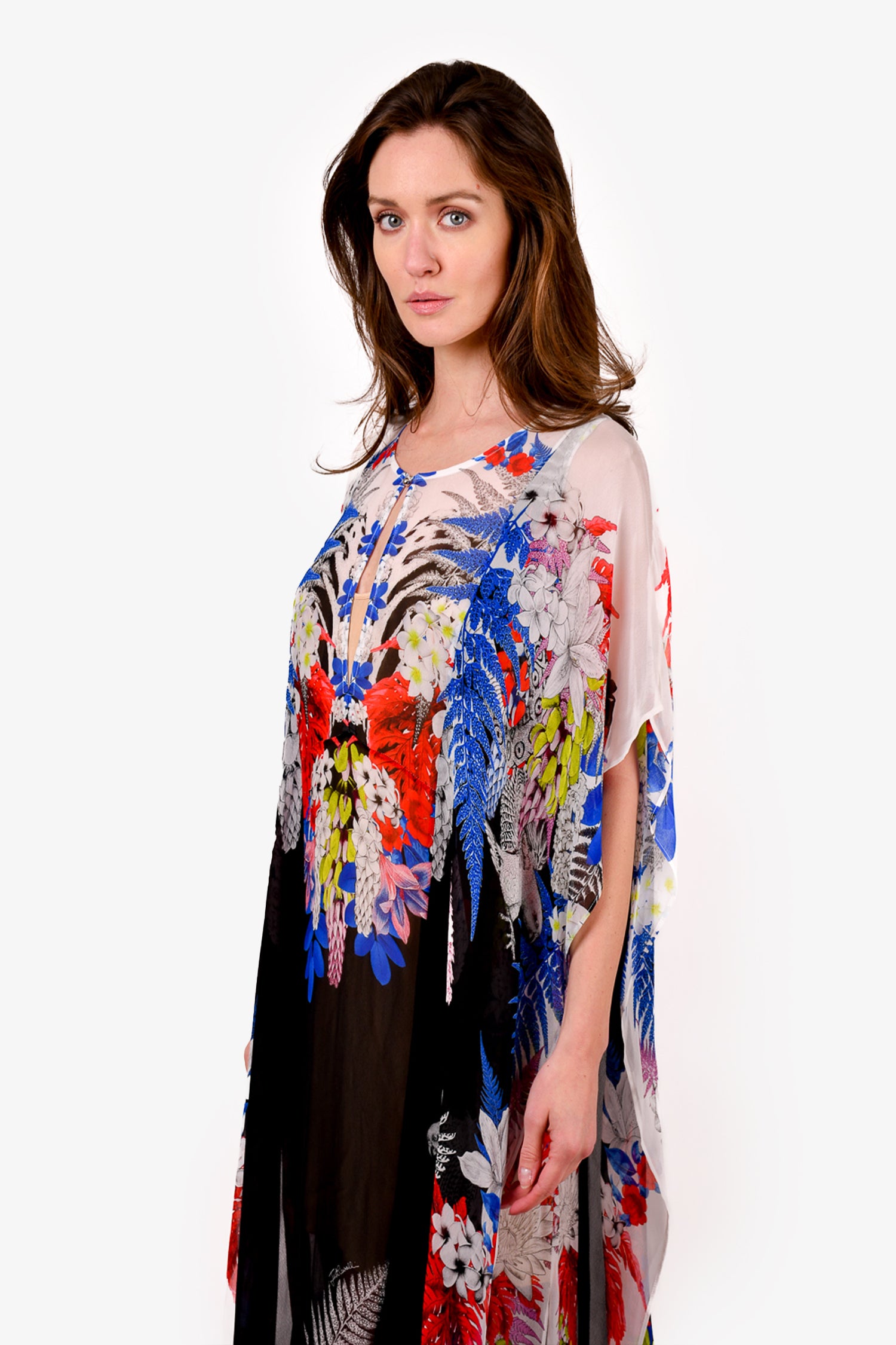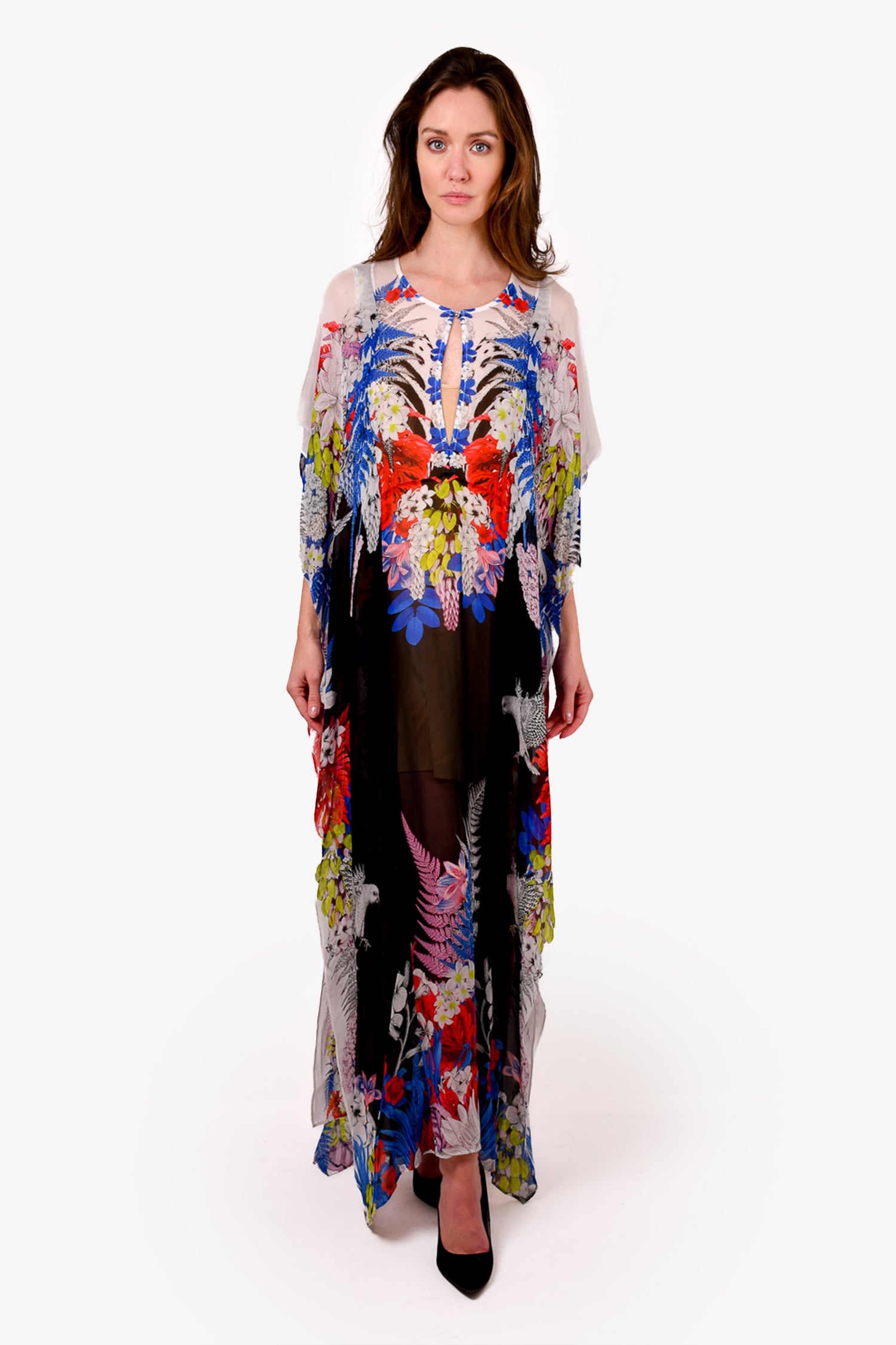 Refresh availabilityJust Cavalli White/Blue Patterned Sheer Maxi Dress. Single front button closure on the neckline. Tonal stitching. Slip not included.