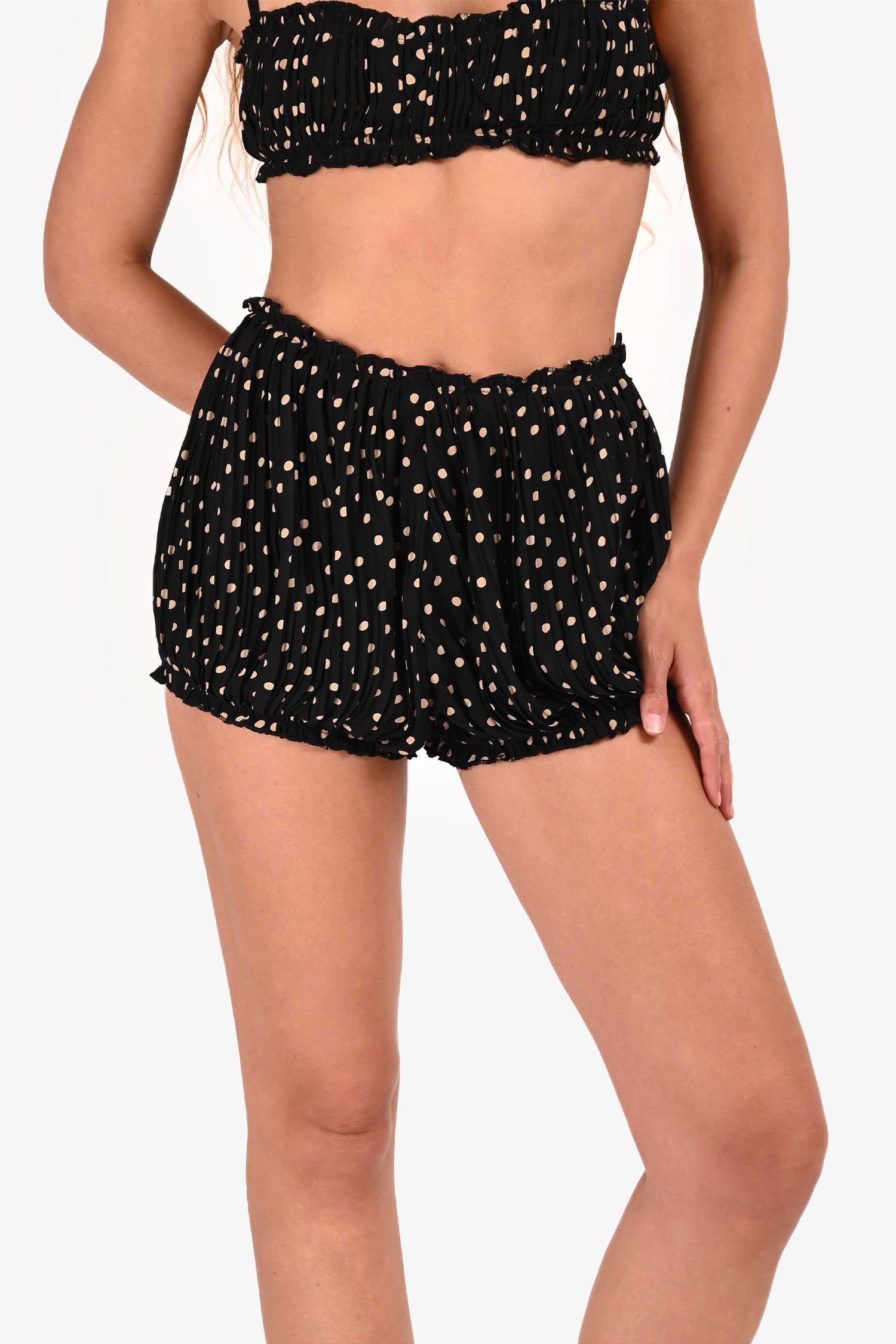 Refresh availabilityKhaite Black/Nude Polka Dot Pleated 'Indira' Bra + Hot Pant Set. Bralette: Lined. Spaghetti straps. Polka dot overlay. Shorts: Lined. Side seam closure. Tonal stitching.