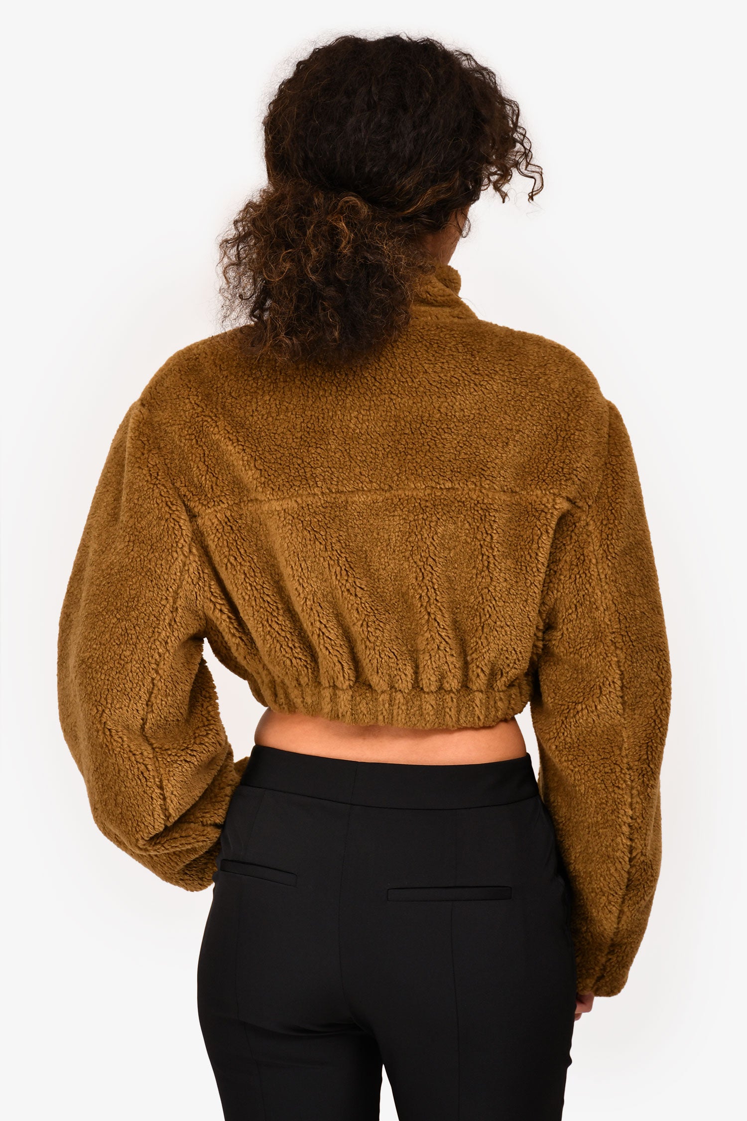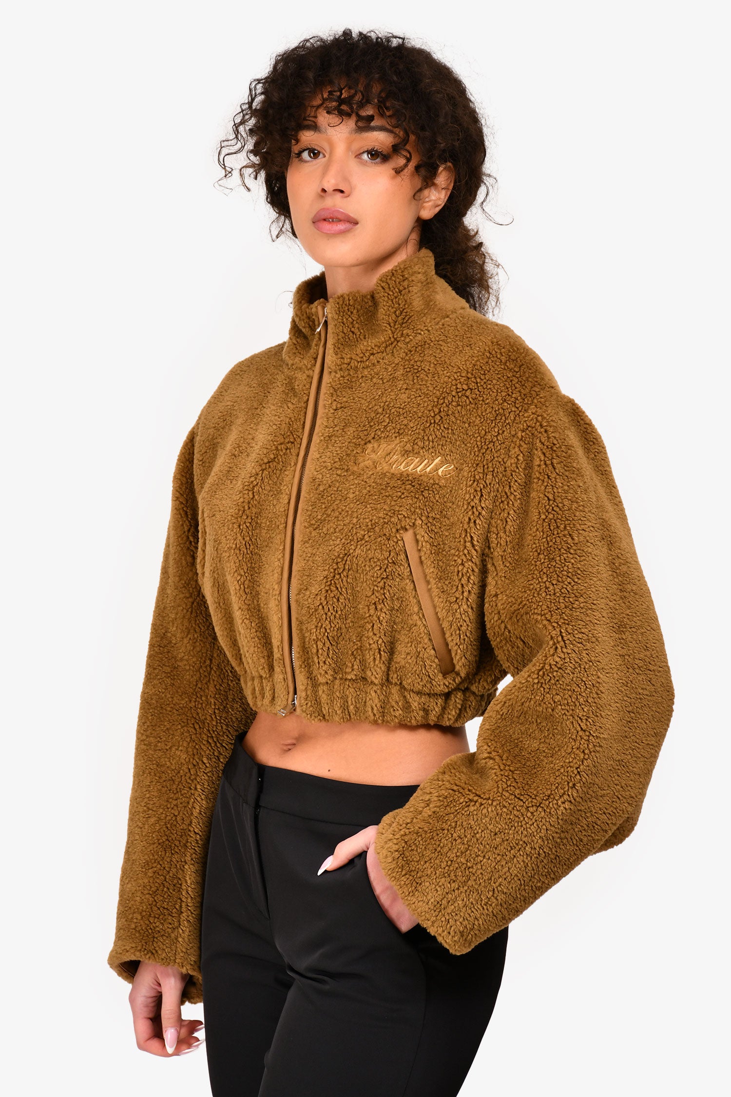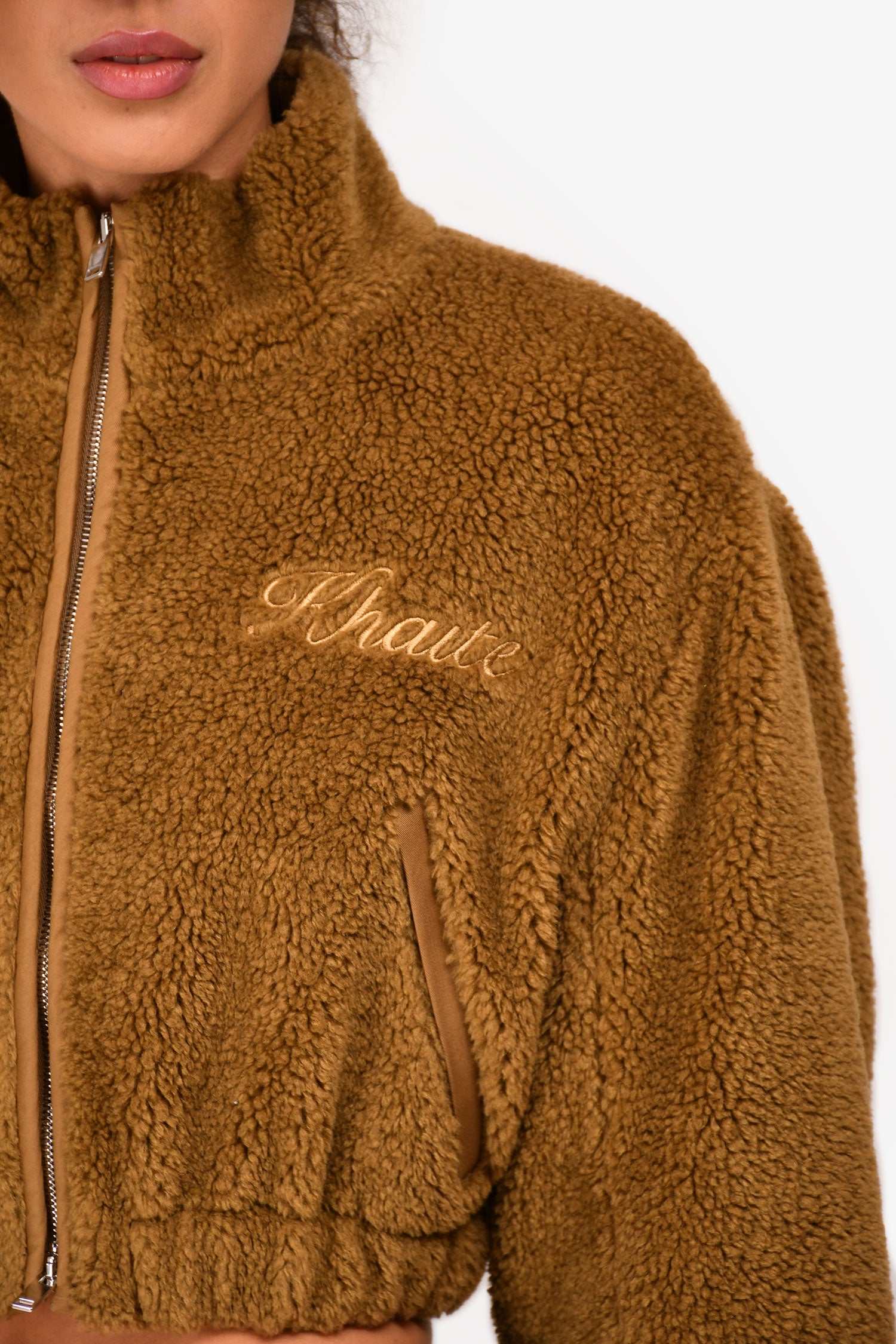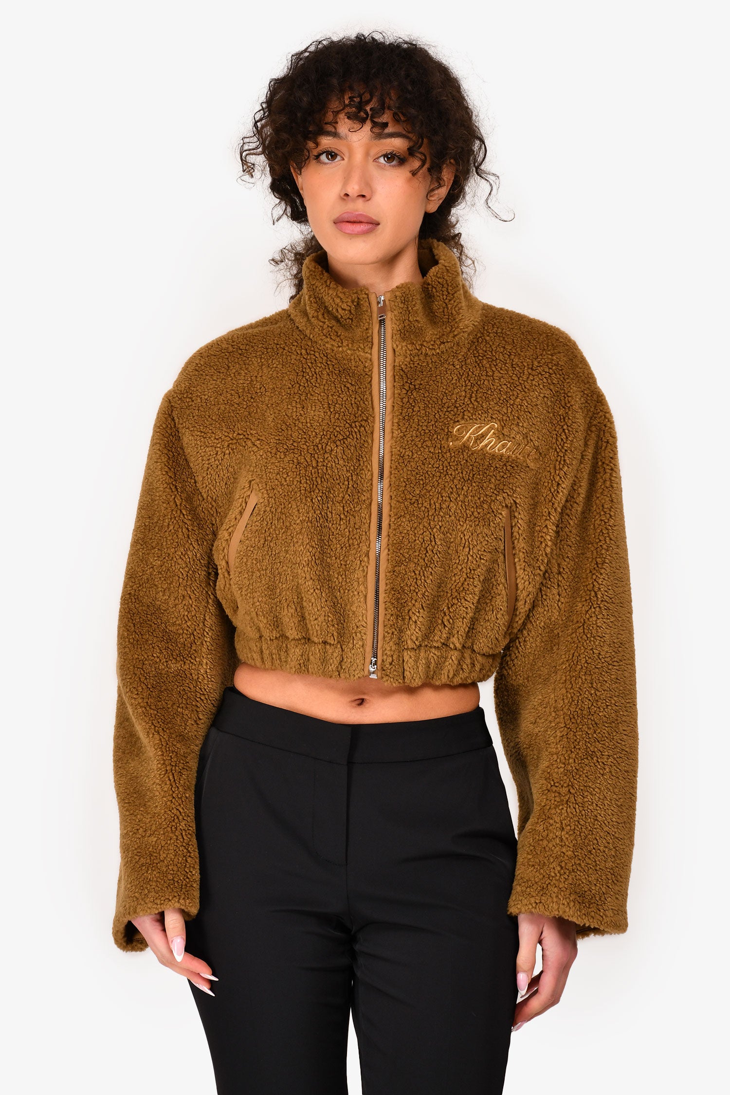 Refresh availabilityKhaite Green Faux Shearling 'Persha' Cropped Jacket. Front zip-up closure. Front pockets with zip-up closure. Embroidered logo detail on left chest. Elasticized waistband. Silver-tone hardware. Lined. Tonal stitching.