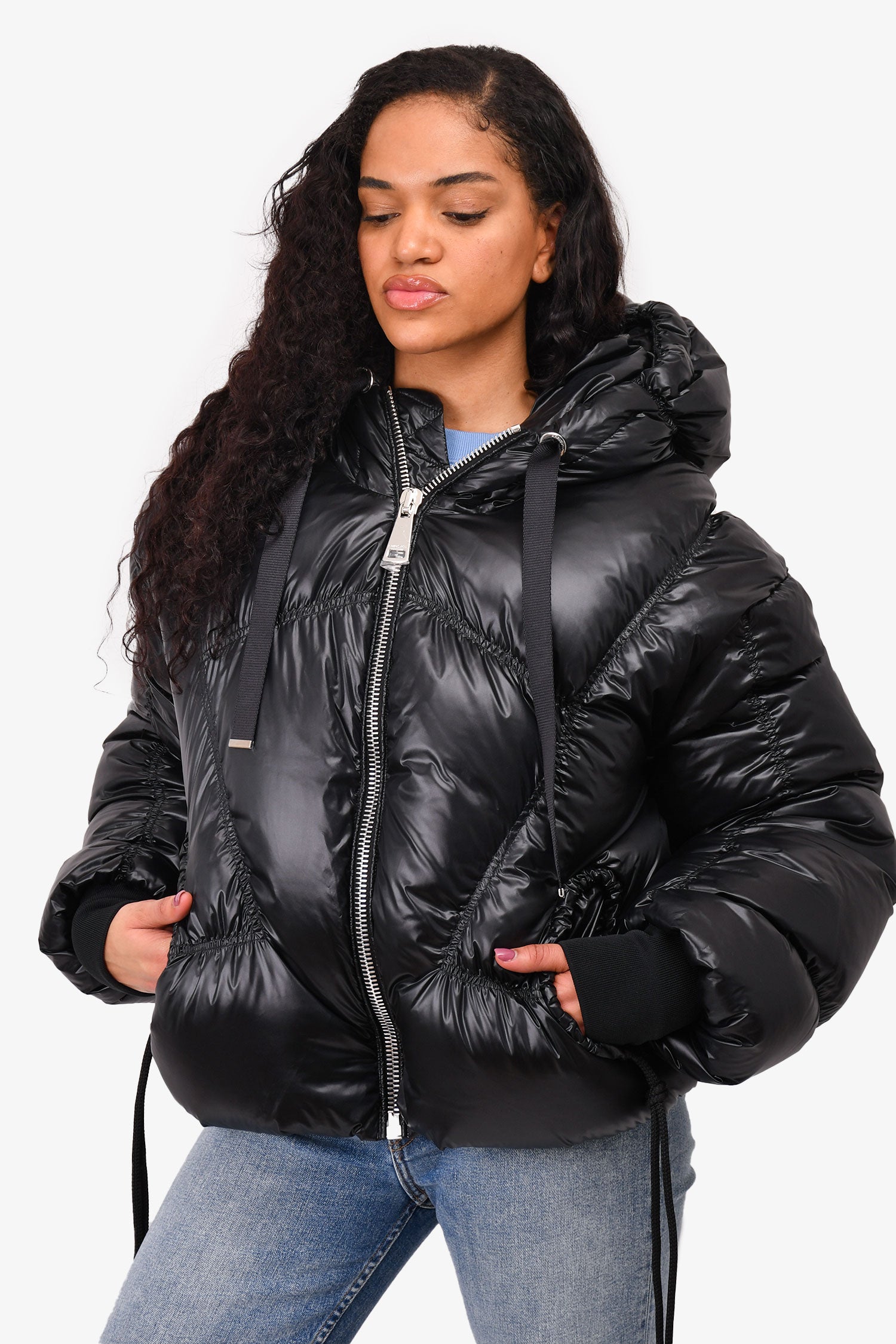 Refresh availabilityKHRISJOY Black Down Drawstring Puffer Oversized Jacket. Down filled. Front zipped closure. Elasticated pockets. Silver-tone hardware. Elasticated hood. Ribbed cuffs. Tonal stitching.