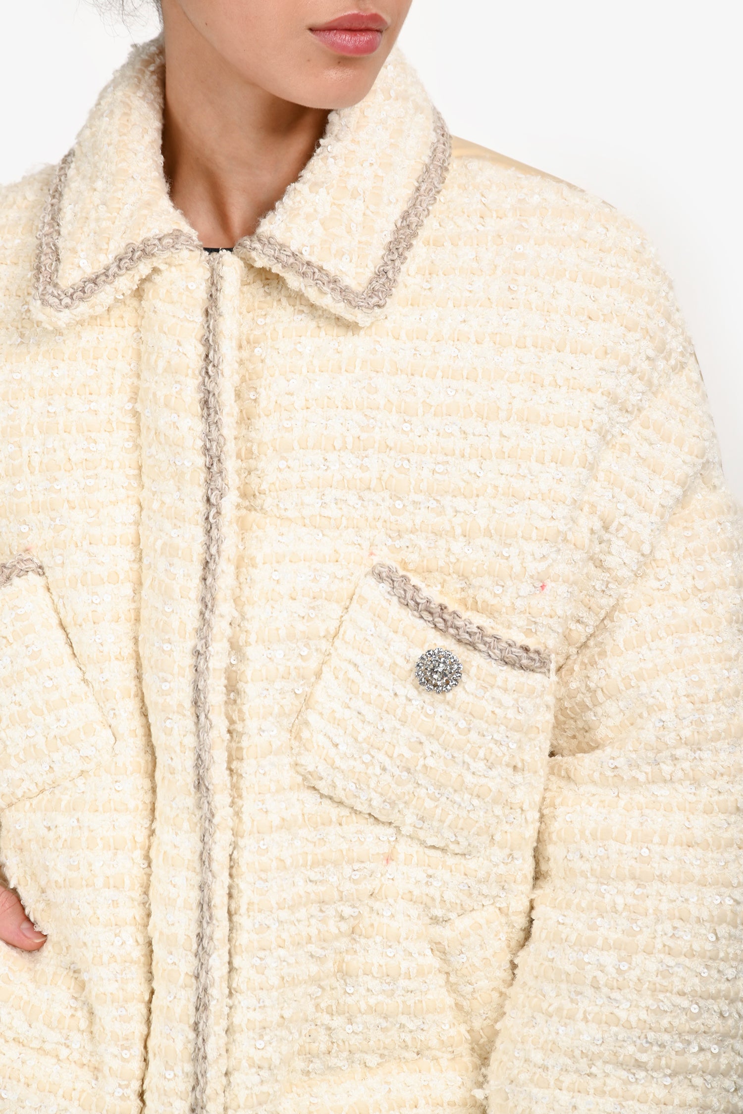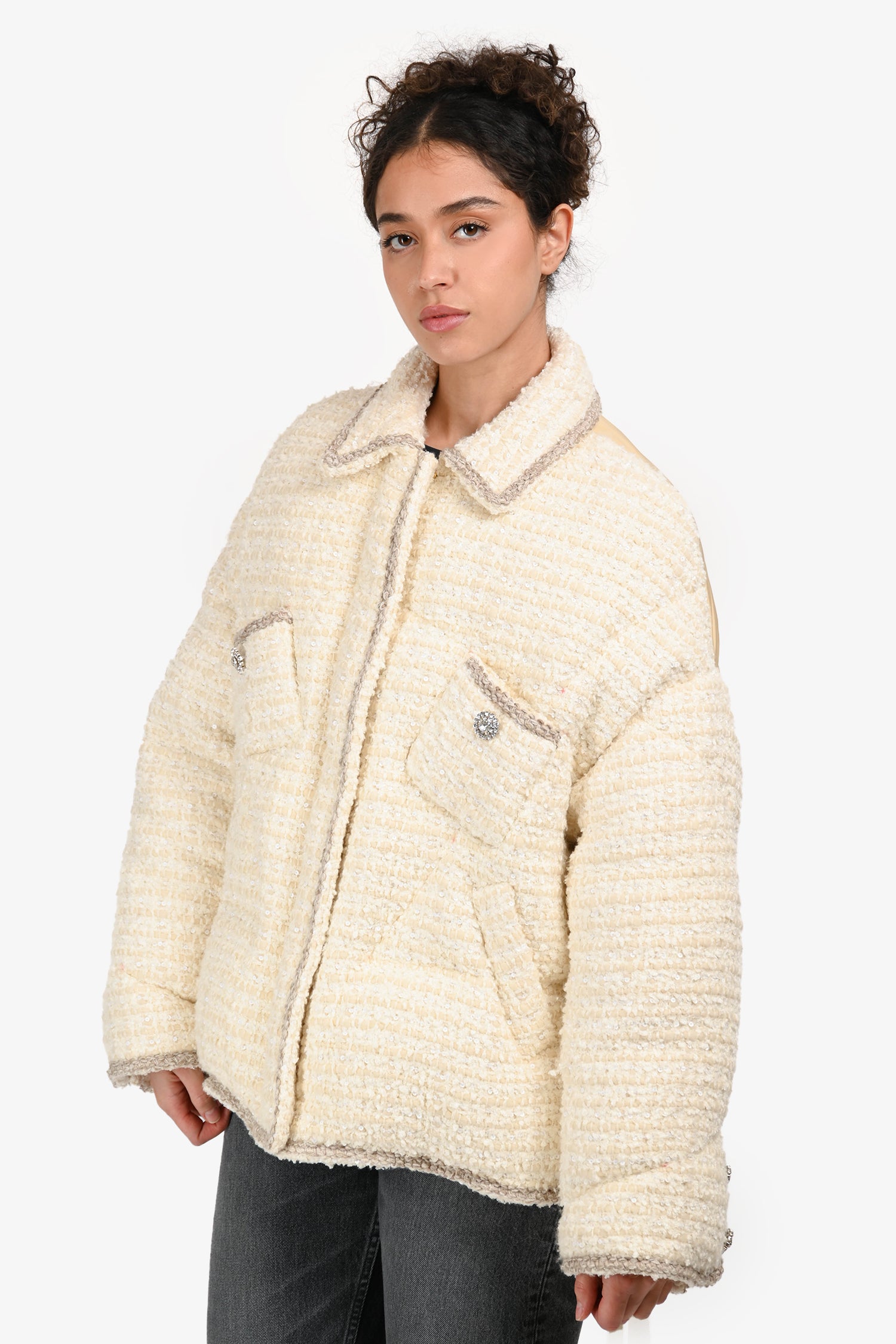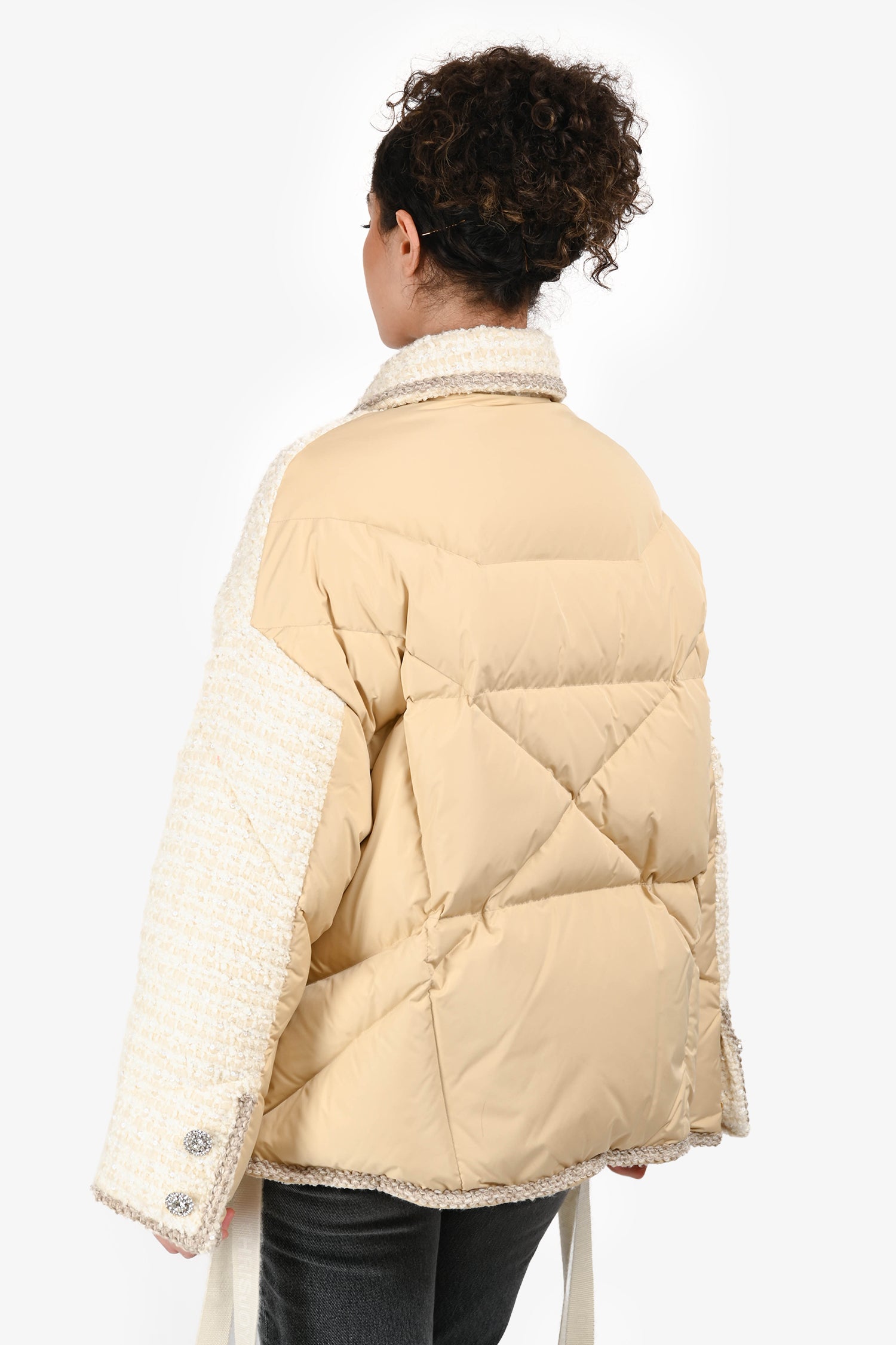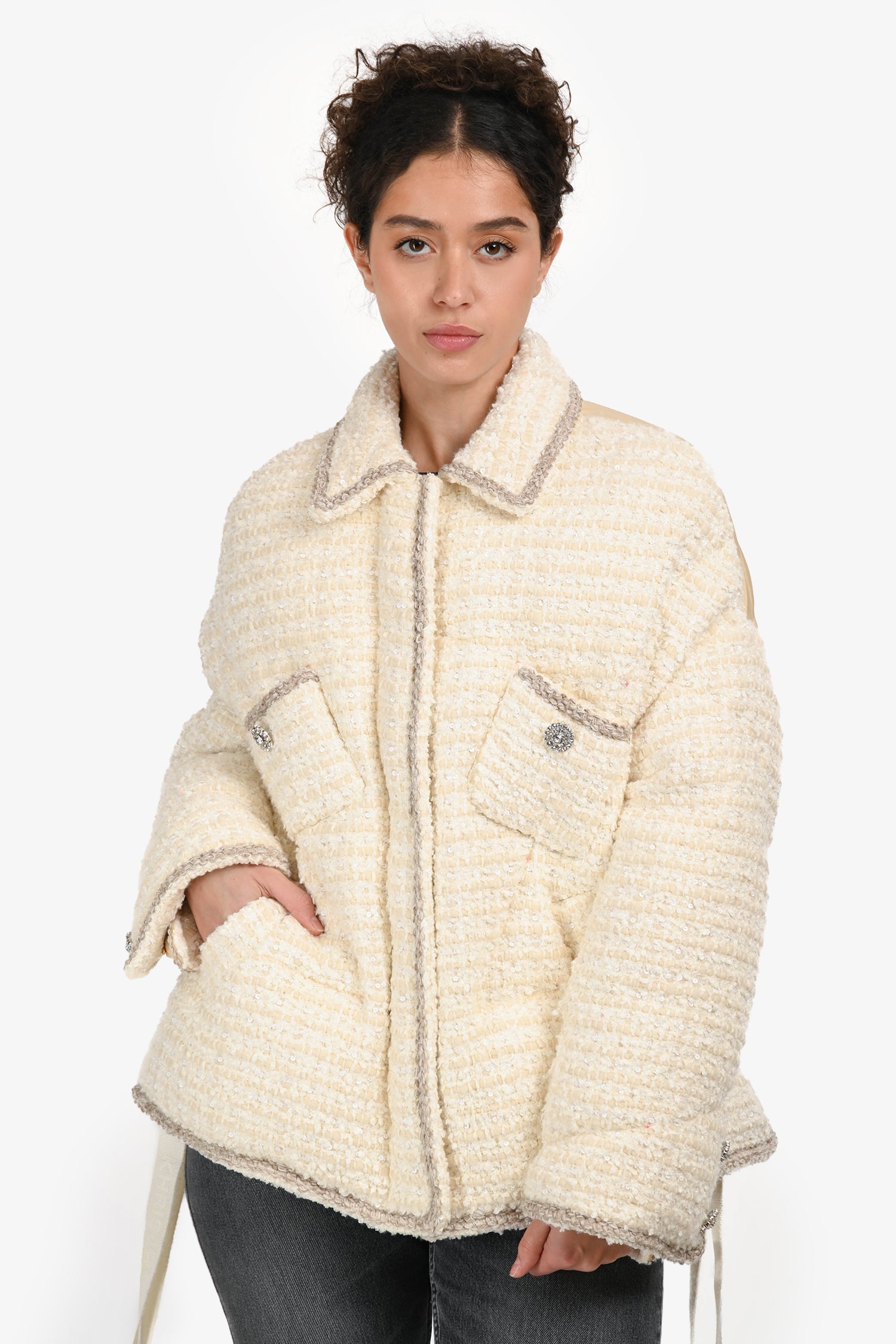 Khrisjoy Cream Tweed Embellished Button Puffer Jacket Size 0