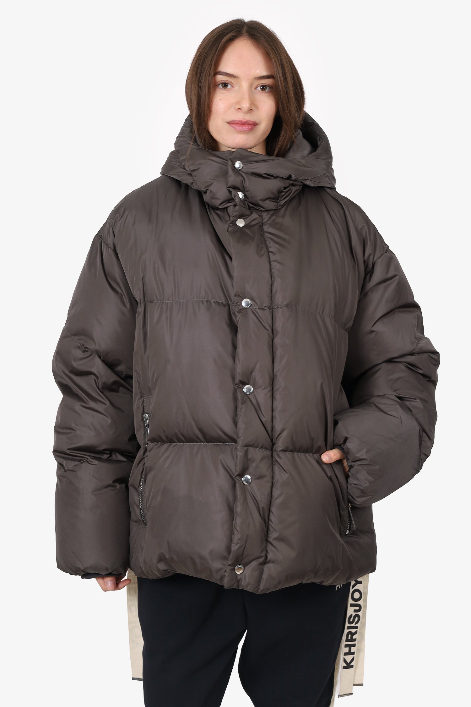 Refresh availabilityKHRISJOY Grey Oversized Down Puffer Jacket. Pull-on. Front zip with snap-button-up closure. Hooded. 2 exterior zip-up pockets. Lined interior with cinch cord and drawstring closure. Single interior zip-up pocket. Silver-tone hardware. Tonal stitching.