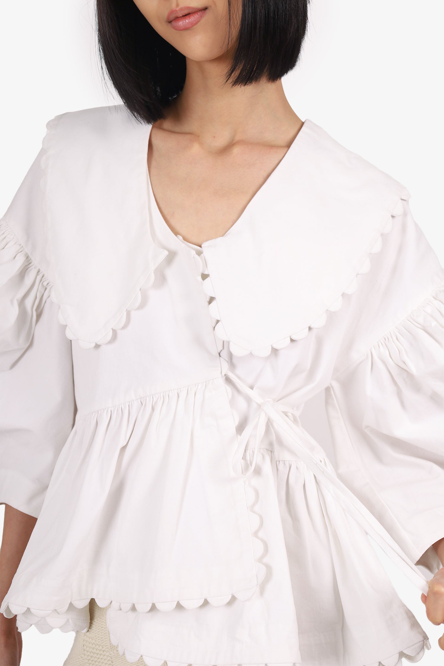 Refresh availabilityKika Vargas White Scallop-Trim Puffy-Sleeve Top with Removable Collar. Scoop neckline. Tie-up closure on front left side. Snap buttons to remove/attach collar. Tonal stitching.