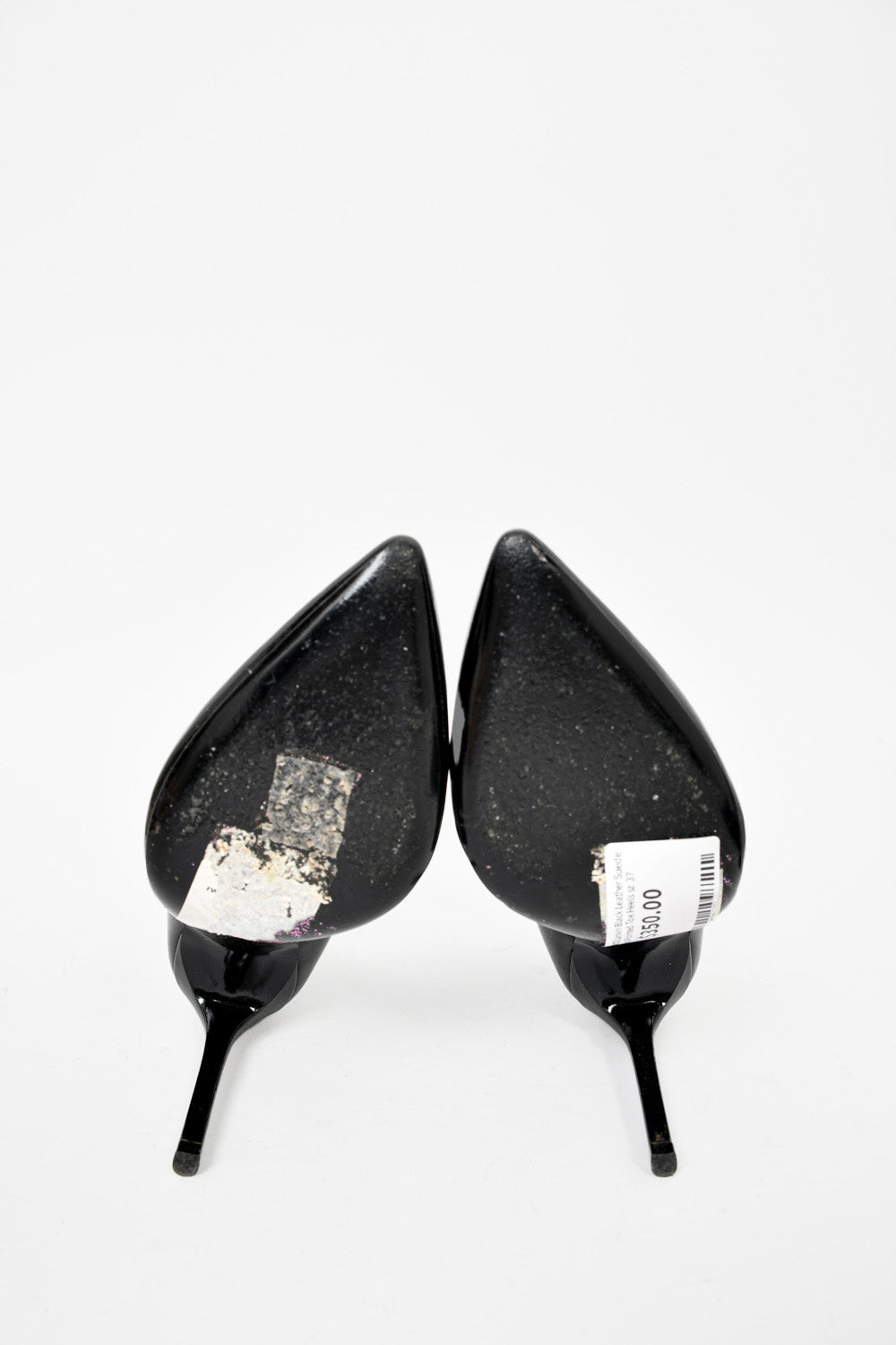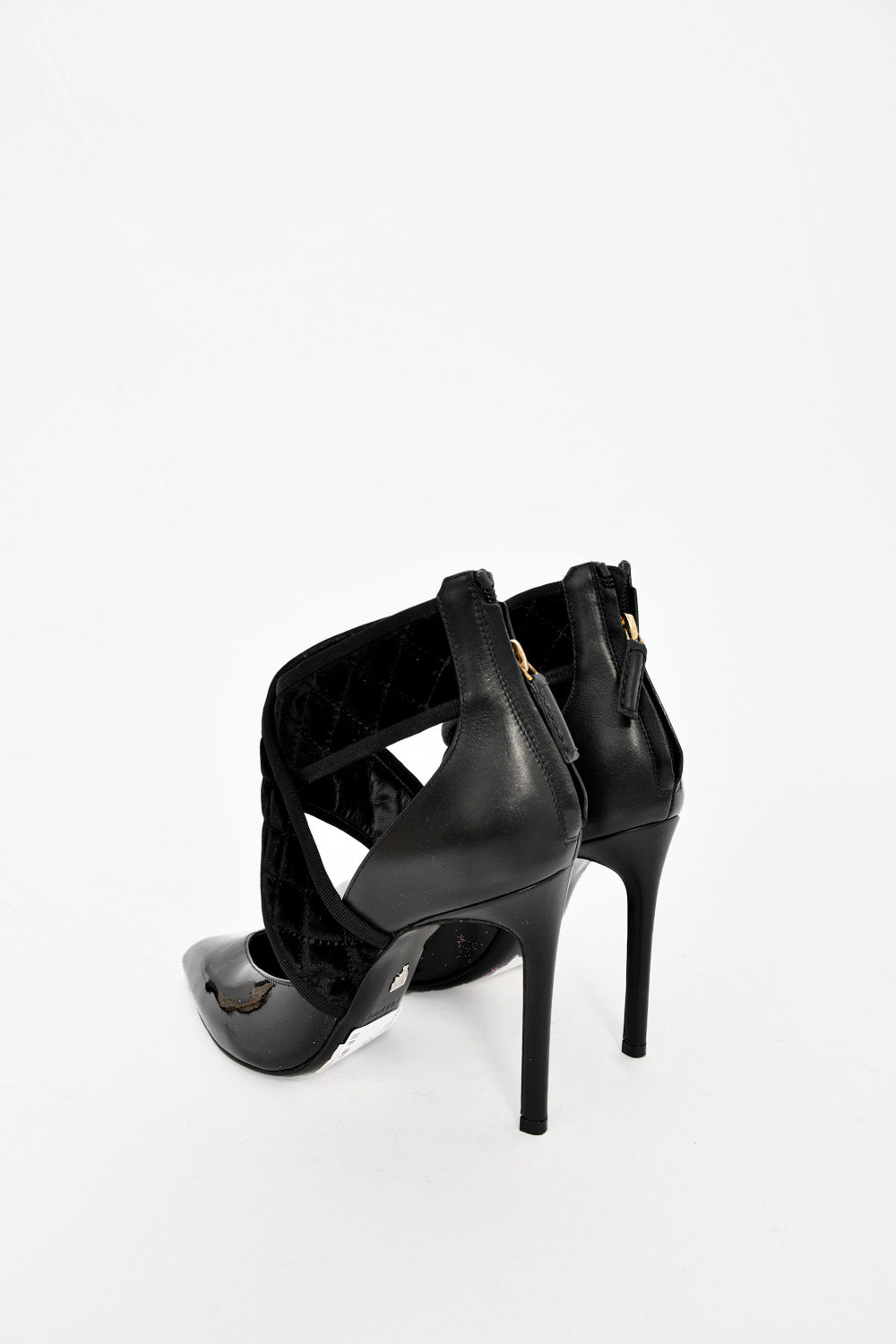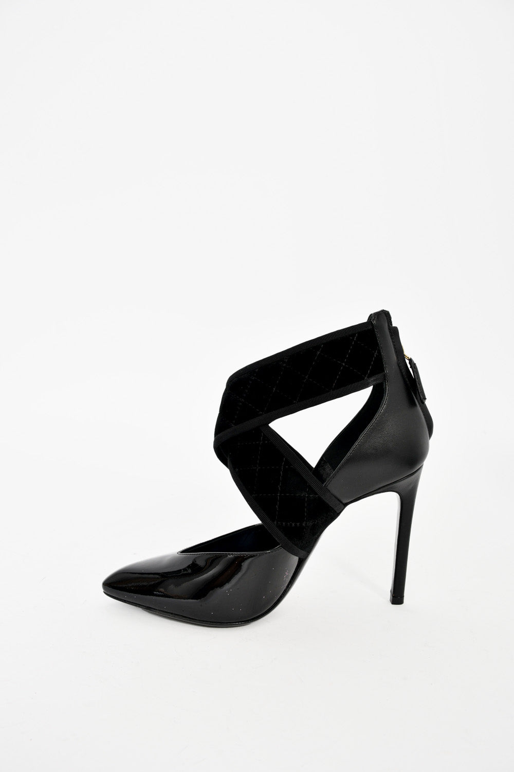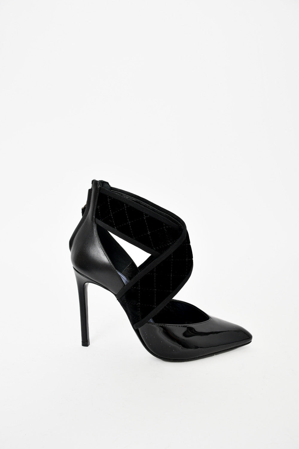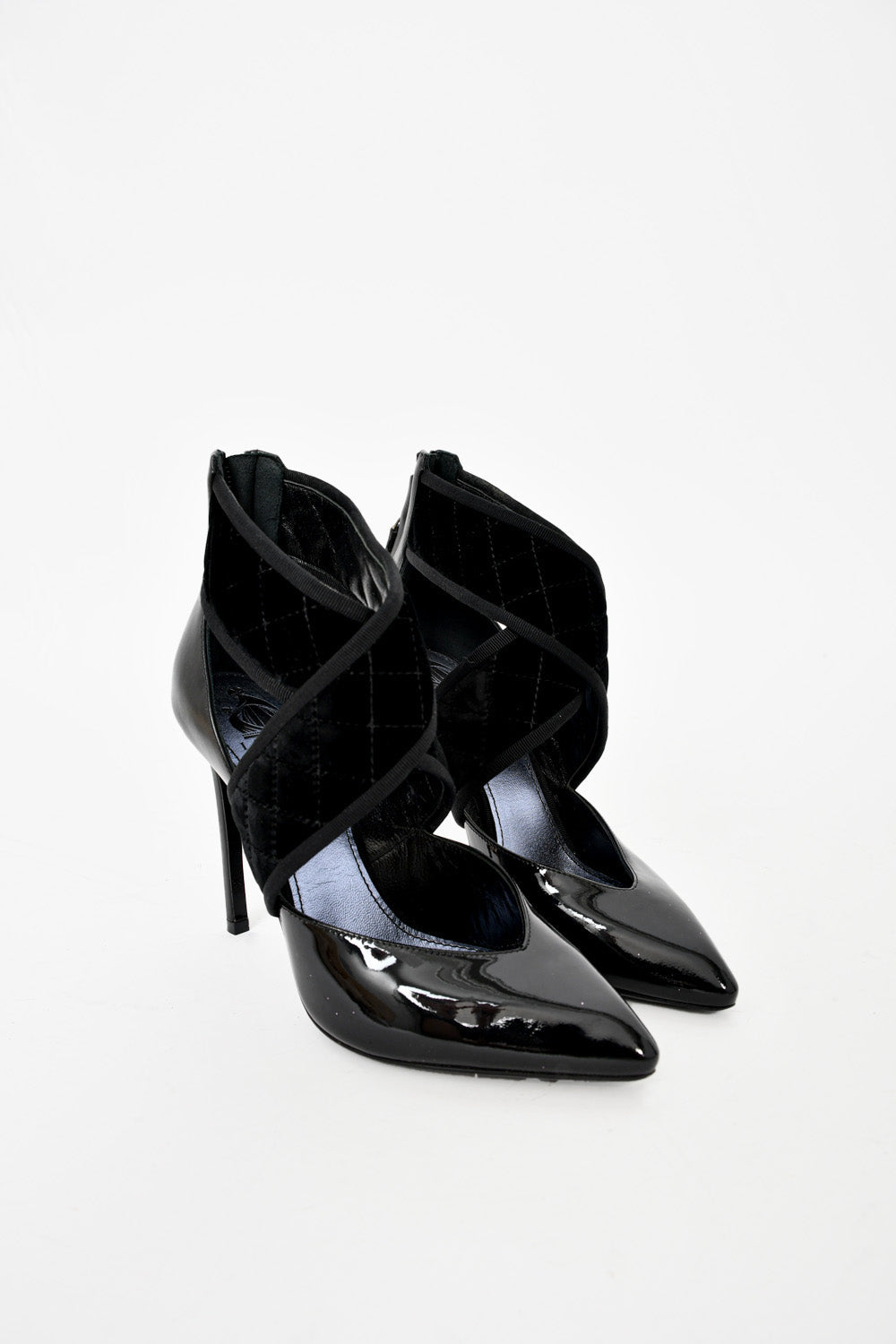 Refresh availabilityLanvin Black Leather Suede Wrap Pointed Toe Heels. Rear zip closure. Pointed toe. Tonal stitching.