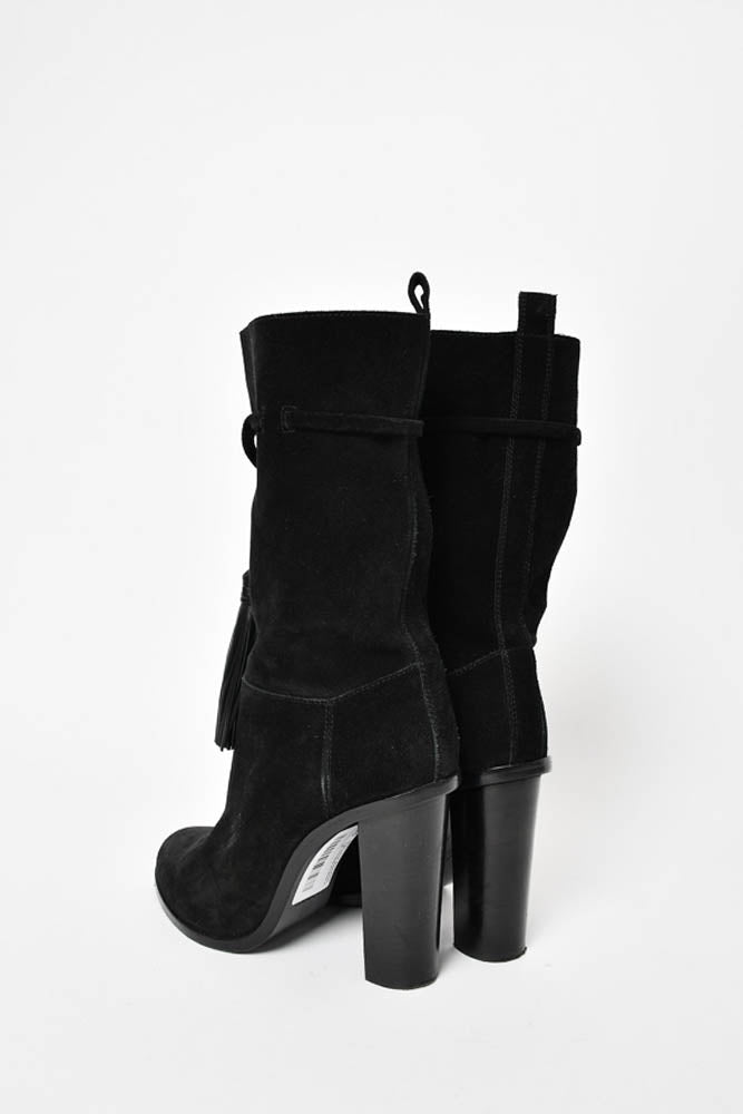 Refresh availabilityLanvin Black Suede Calf Heel Boot with Tassel. Round toe. Pull-on. Block heel. Tonal stitching.
